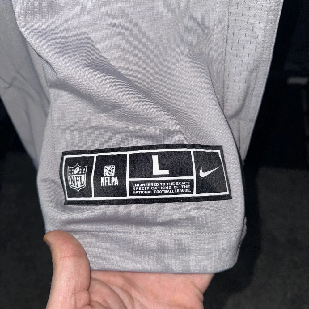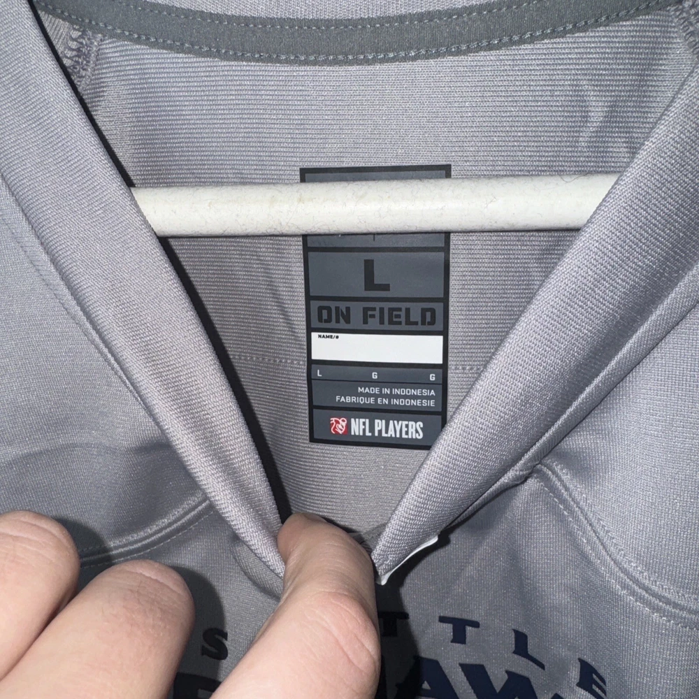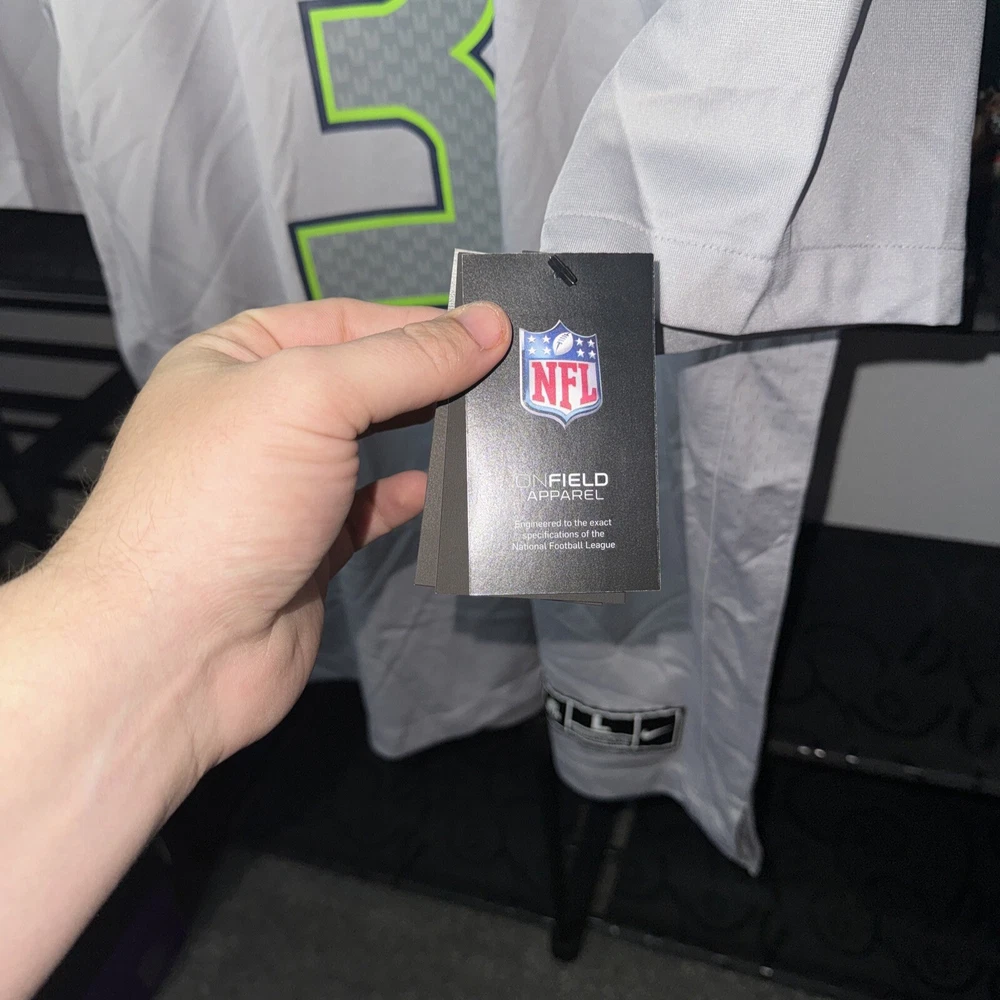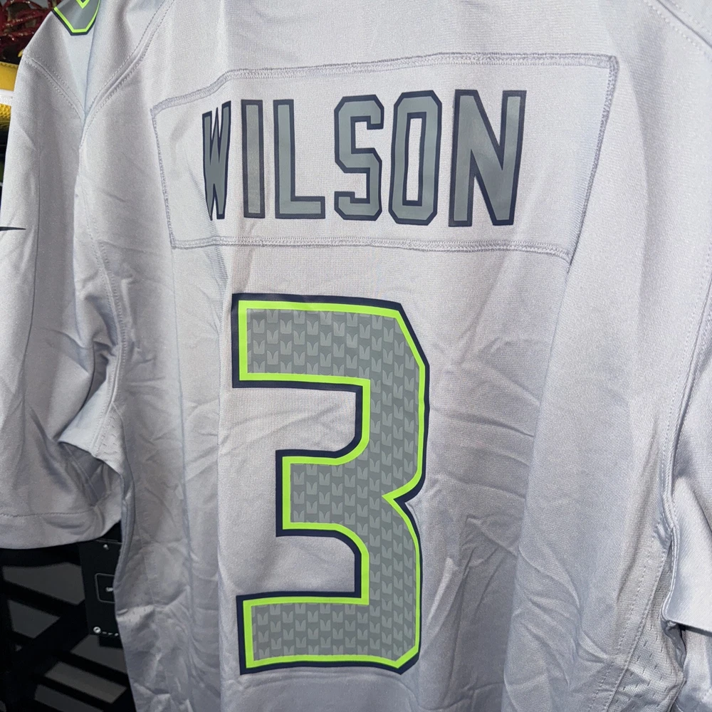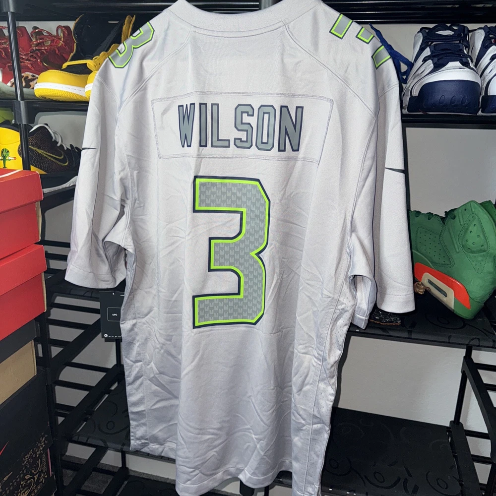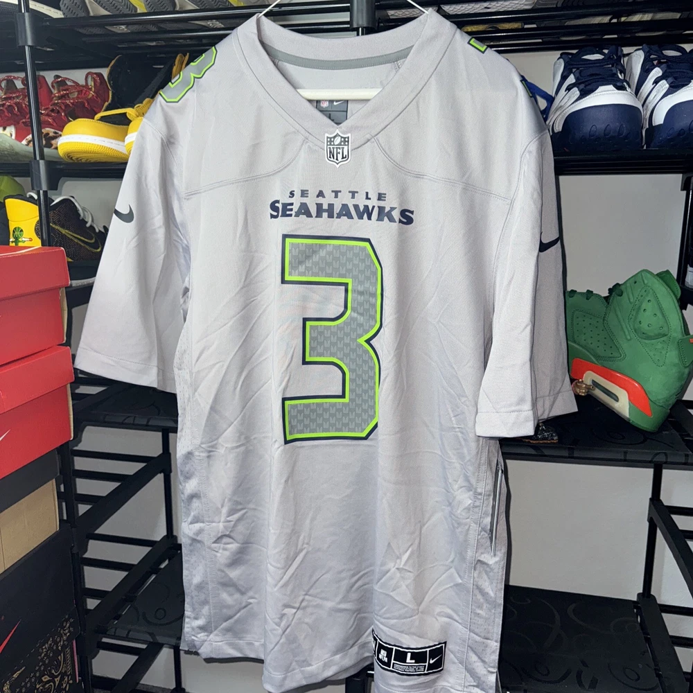 Show your support for the Seattle Seahawks with this officially licensed Nike jersey featuring Russell Wilson's name and number on the back. Made with Dri-FIT technology, this gray jersey is perfect for any football fan. It's designed for men and comes in size L, with a regular fit. The jersey is perfect for game day or any day, and is sure to make you stand out in any crowd. As a part of the Nike Atmosphere collection, this jersey is a must-have for any true football fan. Get yours today and show your support for the Seattle Seahawks!