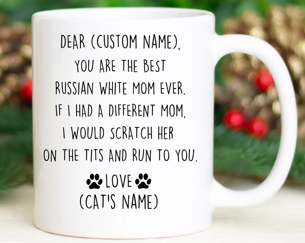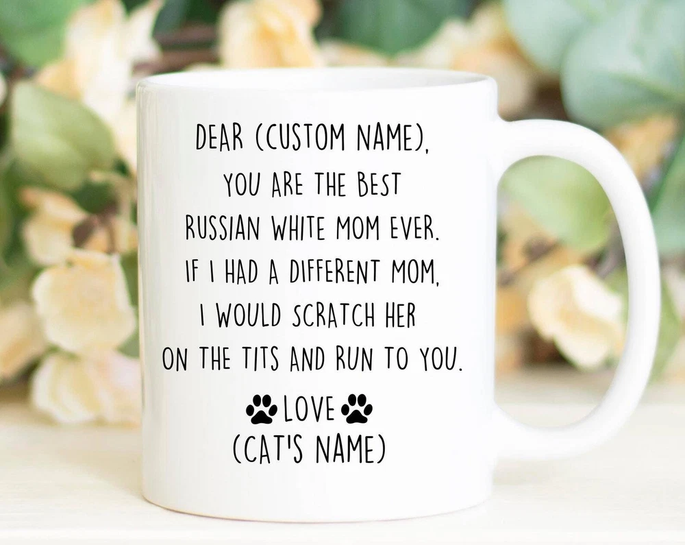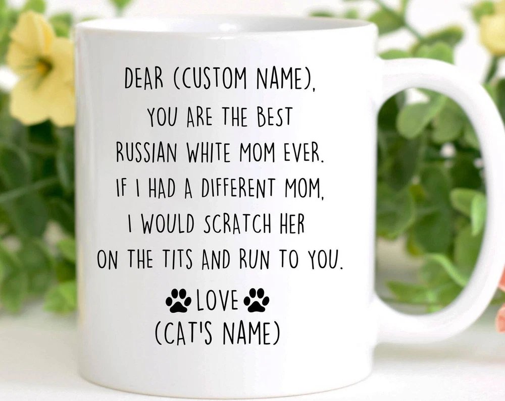 Russian White Cat Mom Birthday Gift Russian White Cat Mom Christmas Gift Russian White Mom Valentine Gift Russian White Mom Appreciation Product Details.. This high quality 11oz. ceramic white mug has a premium hard coat that provides crisp and vibrant color reproduction sure to last for years. Perfect for all hot & cold beverages. The highest quality printing possible is used. It will never fade no matter how many times you wash it. Material: 100% Ceramic. Print both sides. Dishwasher and Microwave Safe. High Gloss + Premium White Finish. Printed in the U.S.A. Personalized & Custom. We support personalized and custom mug to add custom, when placing an order, you can add notes to the "order note" in shipping address section. Also you can contact us directly via message. Shipping Info. Ready to ship in 1 to 2 business days, All products are made-to-order and proudly printed in the United States. Shipped by USPS and DHL, You will receive your order in 5-7 days. Replace & Refund. All products are defective during shipping broken, chipped will be replaced free of charge. You are not satisfied with the product, we will refund 100% money to you. If any other issues arise, please do not hesitate to message, we would be more than happy to assist you.