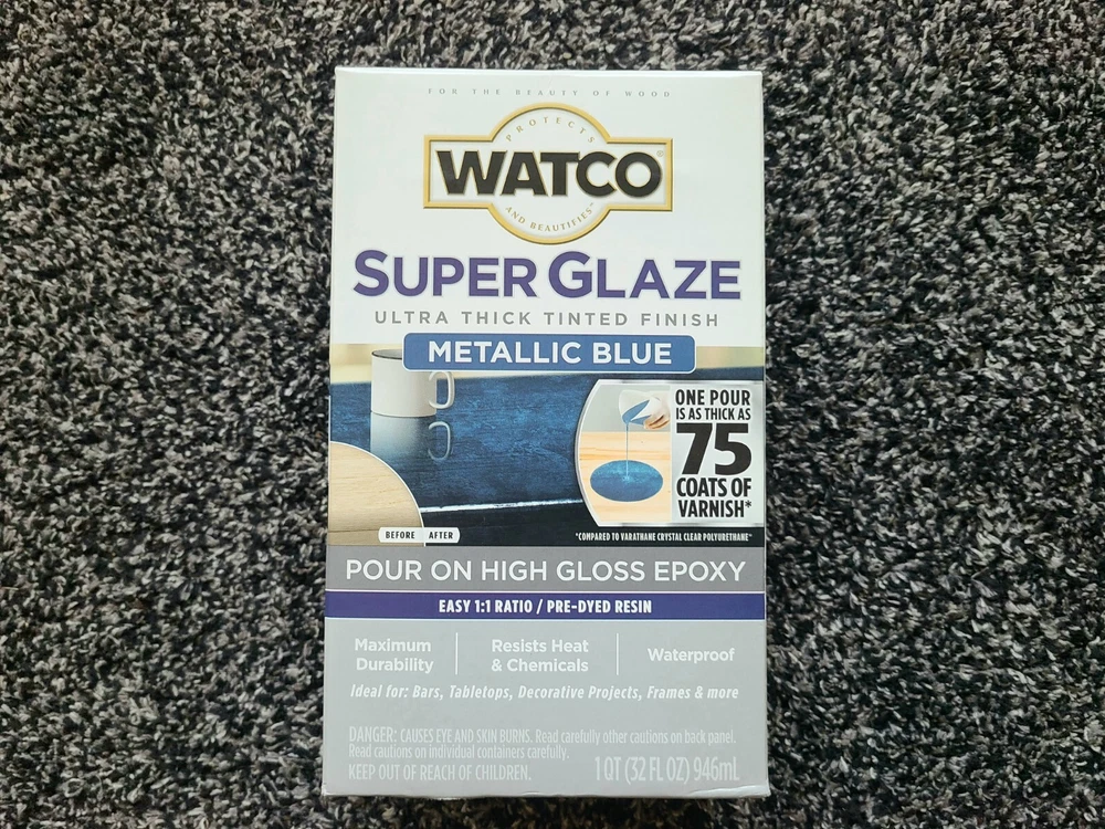 **SHIPS NEXT DAY** **ONE DAY HANDLING** **BEST-PRICE** Add a high-gloss metallic blue finish to your woodwork with Rust-Oleum Watco- Super Glaze Pour On High Gloss Epoxy. This liquid coating is perfect for bare wood, finished wood, old/reclaimed wood, and stained wood. The 1 Quart container size allows for a coverage area of 6.2 square feet, and the gloss sheen adds a stunning shine to your project. This epoxy varnish is oil-based and features a brushroller application method. The product is a waterproofer/sealer with a dry to touch time of 300 minutes and a time before recoating of 1 hour. The Rust-Oleum brand is known for its quality products, and this metallic blue finish is no exception. Ideal for interior use, this coating is a great addition to any home improvement project.