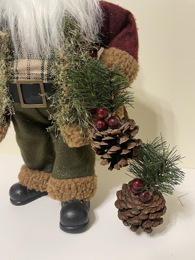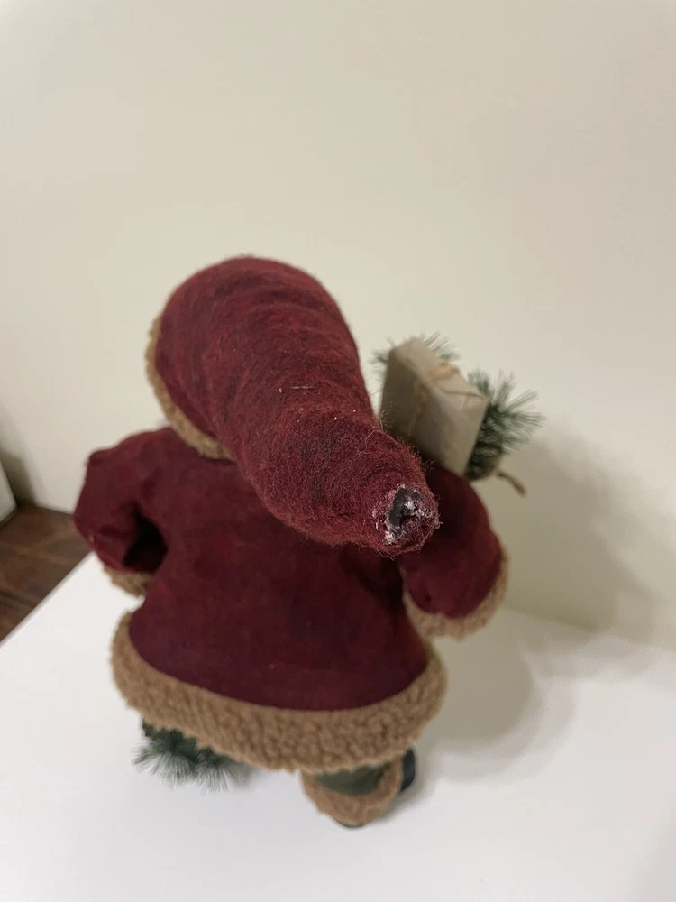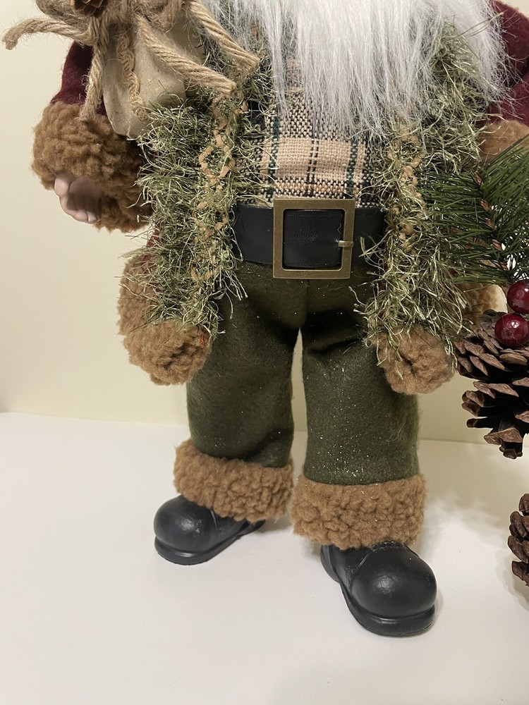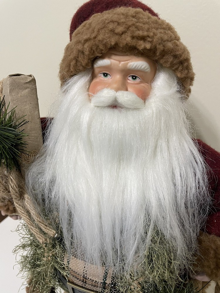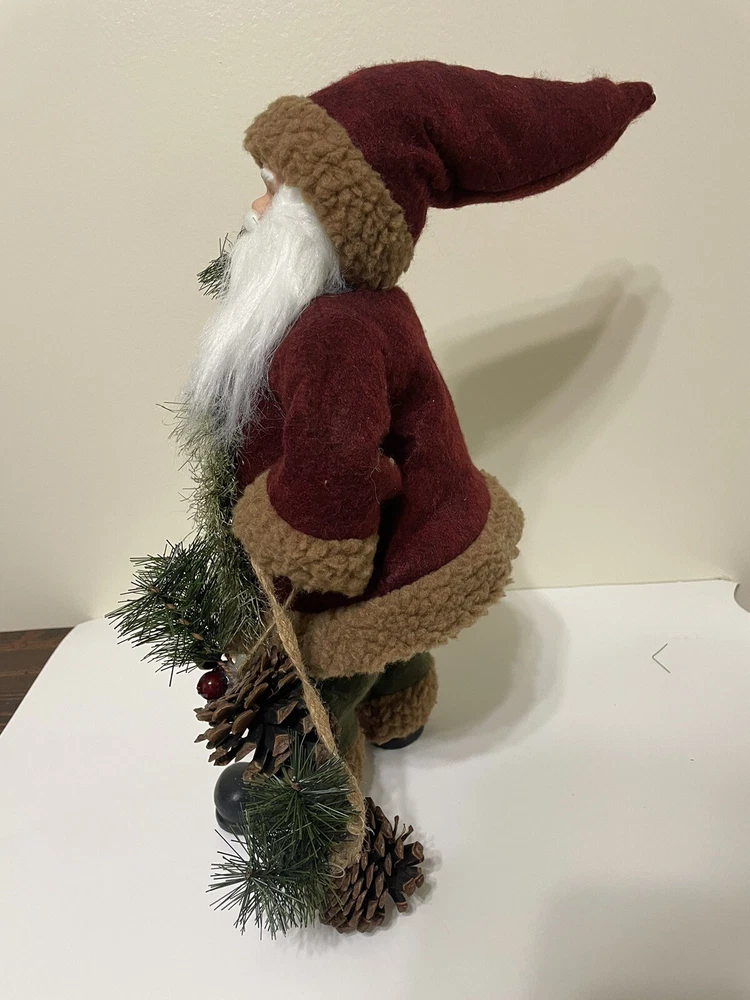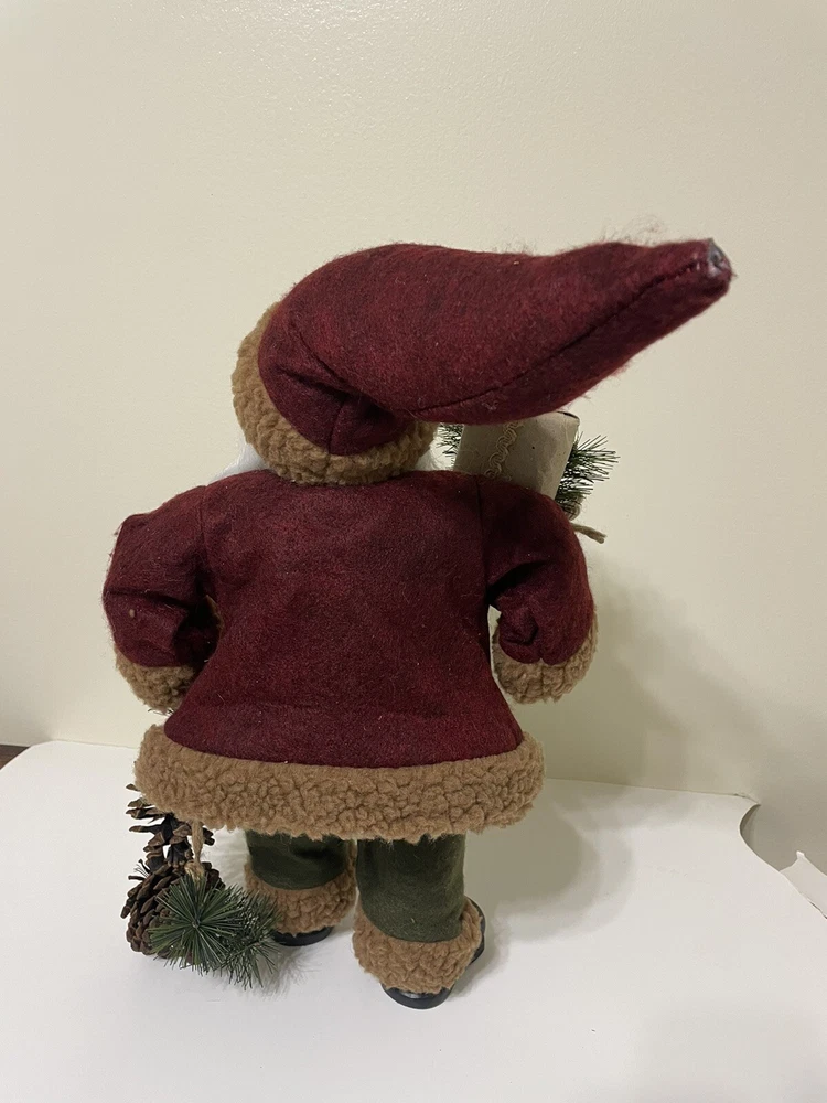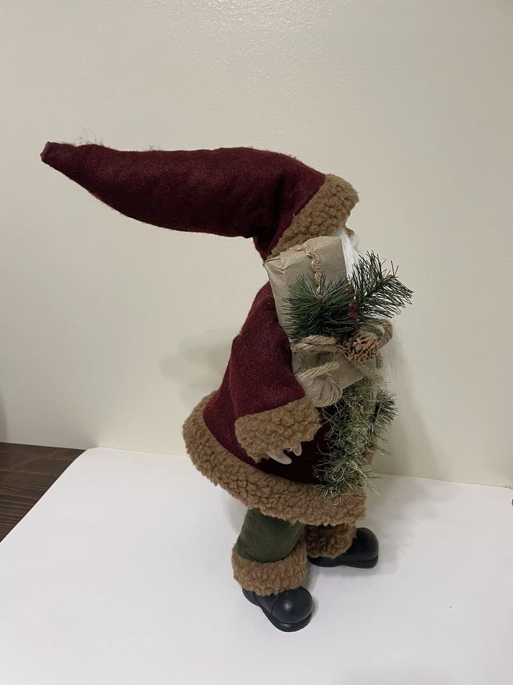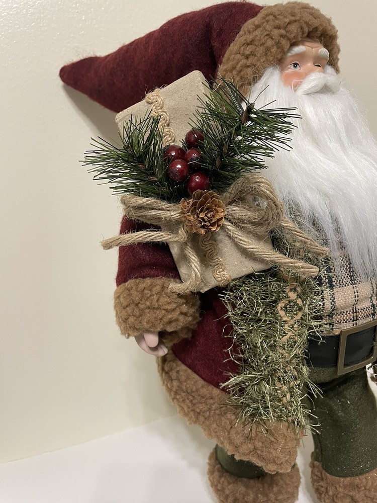 Rustic Santa Claus Christmas Figurine 16” Tall Burgundy Brown Adorned with Plaid, Faux Fur, and Holiday Greens, this charming Santa Claus figurine is perfect for adding a rustic touch to your holiday decor. Standing 16 inches tall, this Santa features a soft burgundy hat and matching Sherpa trim, plaid detailing on his outfit, and black boots. He holds a burlap-wrapped gift and is decorated with realistic greenery, pinecones, and red berries, making it an ideal centerpiece or accent piece for any Christmas display. Missing the top Pom Pom of his hat. Instagram: nina_benok