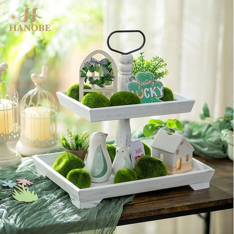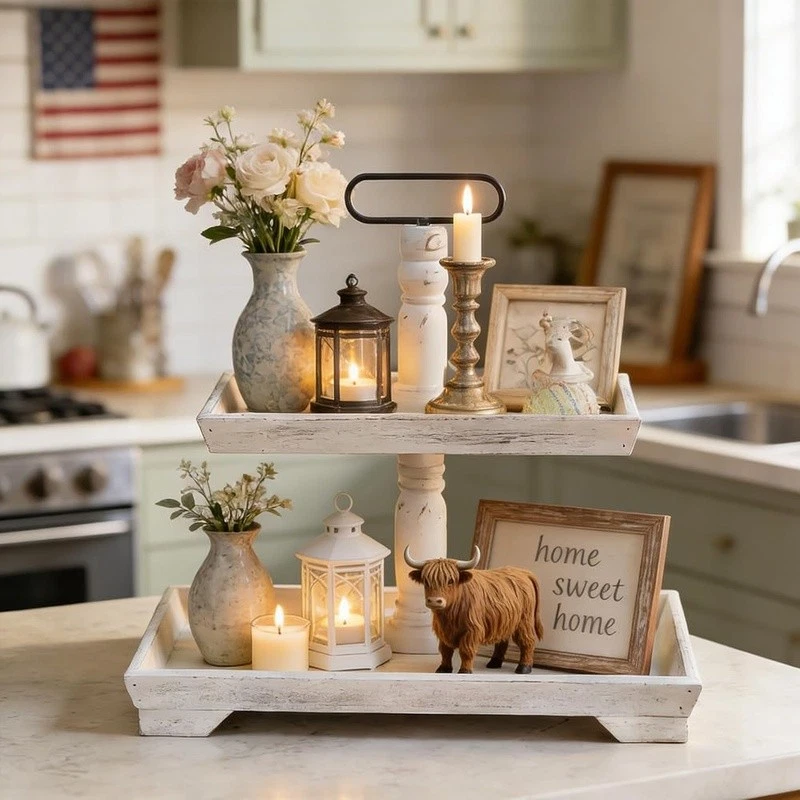 About this item Timeless Farmhouse Elegance : The whitewashed finish of our two-tiered tray serving stand adds a touch of timeless elegance to your home decor. It's the perfect backdrop for displaying cherished items, from cups to candles, plants to picture frames, and everything in between Versatile Celebration Hub : Our 2-tiered tray decor is the heart of every celebration. Whether it's Valentine's Day or Thanksgiving, this farmhouse tiered tray stand is your go-to for seasonal charm. It's the centerpiece that adapts to every festive mood, making your decor pop with rustic appeal Maximize Space, Enhance Aesthetics: The decorative tiered display stand's rectangular design is both space-efficient and aesthetically pleasing. It offers more room for your decor while taking up less counter space. This smart, farmhouse-style stand can hold up to 30% more, making it the perfect addition to any room Perfectly Sized for Display: With dimensions that allow for ample display space, our tray stand ensres that your decor items are the stars of the show. The bottom tray's 15.8"x 11.8" and the top tray's 11.8"x 8.7" provide plenty of room, while the 15.8" height and 7" gap between trays accommodate even taller pieces Rest easy knowing our uwavering commitment to support is just a message away, with a promise to resolve your queries within 24 hours. Purchase with complete confidence! Brand: Color: White Material: Engineered Wood Product Dimensions: 15"L x 12"W x 1.9"H Shape: Rectangular