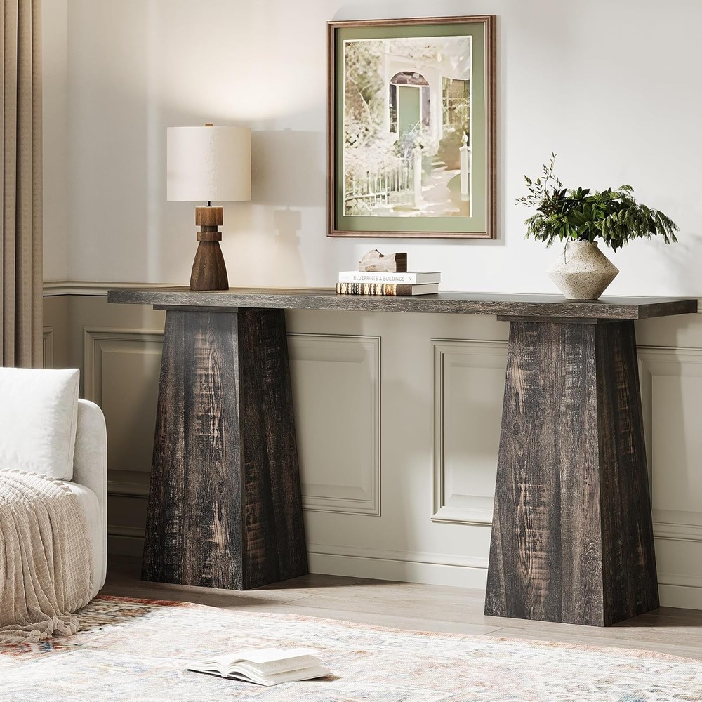 Product Description About this item Rustic Vintage Design: The Rustic Console Table showcases a unique vintage design that augments the aesthetics of any room. The 63-inch narrow sofa table features a stunning wood finish offset by a black double pedestal base, creating an intriguing piece of furniture that enhances your living room or entranceway with a warm farmhouse appeal. Plentiful Space: Designed for functionality, the Rustic Console Table offers ample space for storage and display. Its long and narrow tabletop allows you to showcase a variety of items, including decorative accents, family photos, or cherished mementos, while the spacious base leaves room for extra storage boxes, baskets, or even shoes to help maintain a tidy and organized space. Exceptionally Constructed: This console table is expertly crafted from solid MDF wood and strengthened with a robust double pedestal base. Its distinctive design ensures overall stability and durability, making it an exceptional piece of furniture that can bear considerable weight and withstand the test of time. Versatile Use: This table serves as more than just a console. It works well as a sofa table in the living room or as a functional accent piece in your hallway. The table's simplistic yet stylish fuss-free design makes it suitable for all room types, whether used as a statement piece in your entrance hall or as a practical surface in your living room. Easy Assembly & Maintenance: The Rustic Console Table comes with a detailed instruction manual and all necessary hardware, ensuring seamless assembly. The high-quality materials and impeccable finish make cleaning and maintenance a breeze, allowing you to keep this vintage charm looking sleek and new with minimal effort. Wood Console Table A versatile and stylish addition to your living space, the console table is able to enhance the beauty of your living room, entryway, or hallway, giving your living space a timeless appeal. Farmhouse Couch Table One of the outstanding features of this sofa table is its excellent wear resistance. It can withstand the test of daily use, resist scratches and wear, and maintain its original appearance after many times of placing and removing items. It is an excellent decoration for your home. 63 Inch Sofa Table Measuring 63 inches in length, this sofa table offers plenty of surface space, and its narrow design makes it perfect for areas with limited space, such as a hallway or behind the sofa, use it to display your treasured family photos, a vase filled with flowers, or your favorite books. Retro Hallway Table The hallway table features a carefully crafted double base, which not only provides sturdy support and stability to ensure that your daily essentials and cherished decorative items are kept safe, but also lends an air of sophistication and elegance. Rustic Entryway Table The control table embodies a vintage and nostalgic aesthetic, with rich black finishes giving it a classic yet timeless look that can easily complement a variety of interior design themes. Whether your home is rustic, traditional or modern industrial, this table will fit in perfectly. Sofa & Console Table