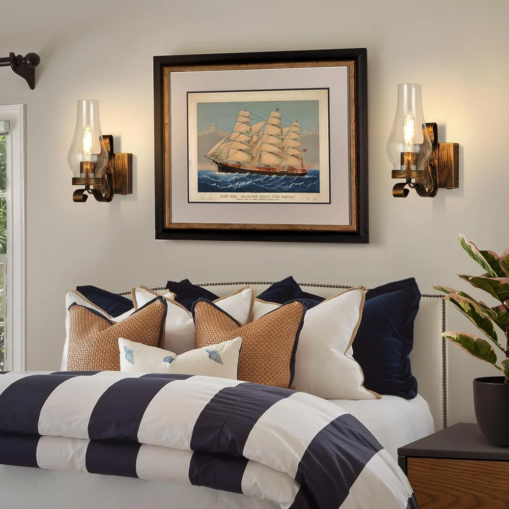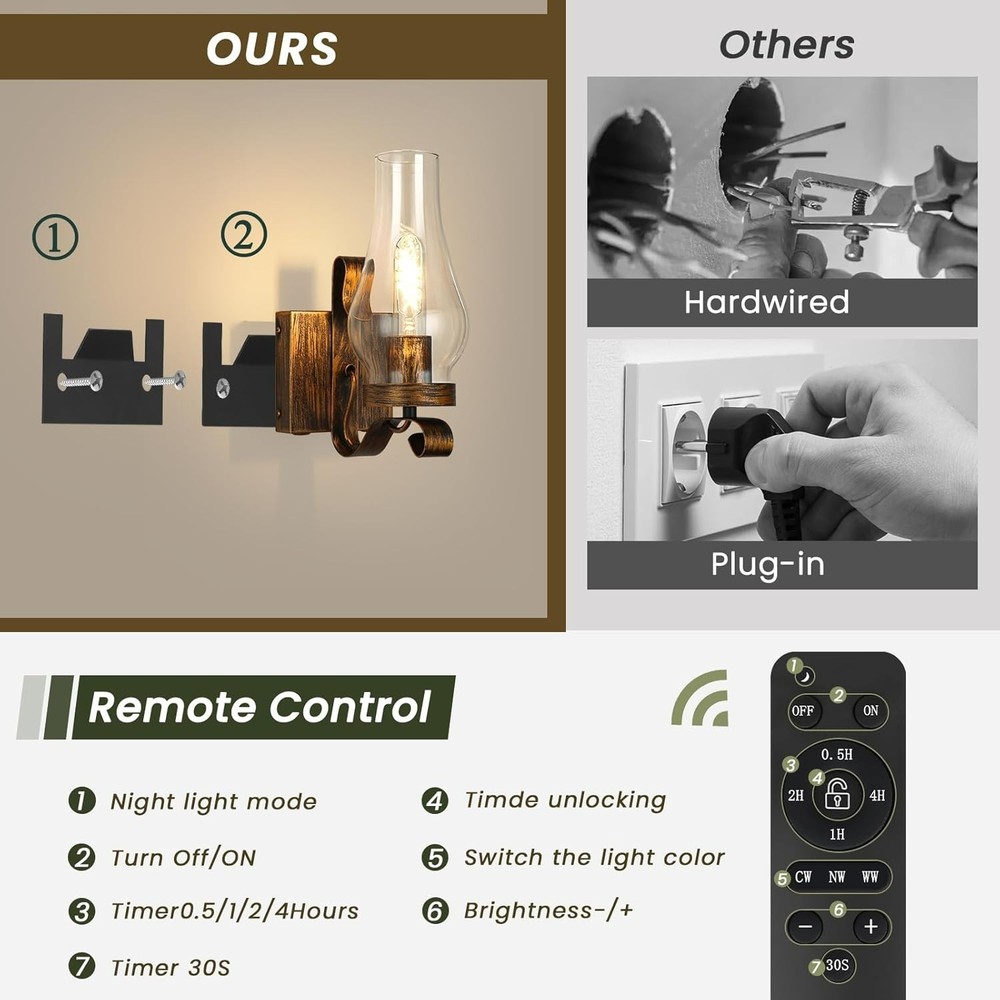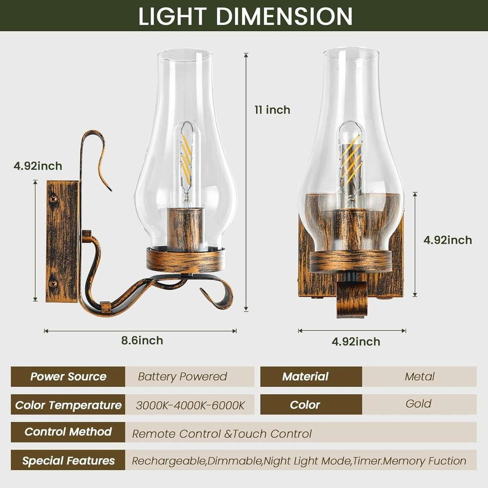 Rustic Battery Operated Wall Sconces with Remote, Set of 2 Vintage Lamps About this item; 【Retro Design】Vintage kerosene wall sconces/rustic wall sconces glass design brings a vintage atmosphere to your home. Metal lamp body with matte black finish and glass lampshade brings country style to your room. Stylish and minimalist, this vintage wall sconce is not hardwired for all interior scenes 【Rechargeable Wall Sconces】Battery powered wall sconce equipped with 7800 mAh high capacity battery, no wiring required, easy and safe to use. Vintage wall sconce with a USB charging cable that doesn't require battery replacement. If you have an area that cannot be wired but needs lighting, our wireless wall sconce will be your good choice. Our rechargeable battery sconce will keep your home lit even if there is a sudden power outage 【DIMMABLE WALL LIGHT】The battery operated wall light offers different brightness levels (10% to 100%) to suit all your different lighting needs. Whether you're reading for work or partying for fun. This vintage wall sconce is rich in functionality and beauty, ideal for you 【WALL LAMPS WITH REMOTE CONTROL】Vintage wall lamps, the metal parts are made of corrosion and oxidation resistant materials. Wall lamps also has a timer off function, you can use the remote control to set the timer off for 30-60-120-240 minutes, these functions can be easily accomplished with the included remote control. Allowing you to enjoy a peaceful and comfortable night's sleep or providing a quiet, distraction-free environment