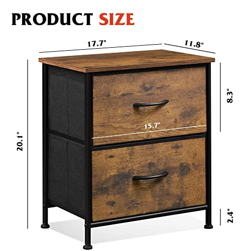 Return Policy Fast Delivery Trusted seller Nightstand with 2 Fabric Drawers,Bedside Furniture & End Table Dresser for Bedroom, Living Room, Steel Frame, Wood Top, Easy Pull Handle, Rustic Brown Product Description SMART & STYLISH DESIGN: This accent lightweight night stand is great for bedrooms, nurseries, playrooms and more. Match perfectly with other storge towers. SPACIOUS STORAGE: Wood top with hard surface can hold lamps, alarm clocks, books, eyeglasses, charging station, and more. Nightstand drawers can store accessories, toiletries, blankets, underwears, cosmetics, baby clothes, paperwork, toys etc STURDY & DURABLE: Sturdy steel frame and water-resistant wood top could serve you for a long time. WHAT YOU GET: Features 2 removable foldable drawers; Easy pull handle helps open and close the drawers simply; 4 adjustable plastic feet protect your floor from scratches EASY ASSEMBLY: This storage nightstand comes with easy-to-read assembly instructions; Overall dimension: 17.7" L x 11.8" W x 20.1" H Shipping Returns Payment Shipping Shipping is FREE to all addresses other than APO/PO boxes in the lower 48 states. All our stock ships from US-based warehouses. Shipped via USPS or UPS (depending on location and package weight) Unless stated otherwise, all orders will ship within 24-72 hours of your payment being processed. Check our feedback to see the great reviews of FAST shipping we offer. Returns Seller does not accept returns Payment We currently accept payment via eBay managed payments only. Once payment is cleared, we will dispatch your shipment within 1-3 business days. Please refer to the "Shipping" tab for more information regarding shipping speed to your destination.