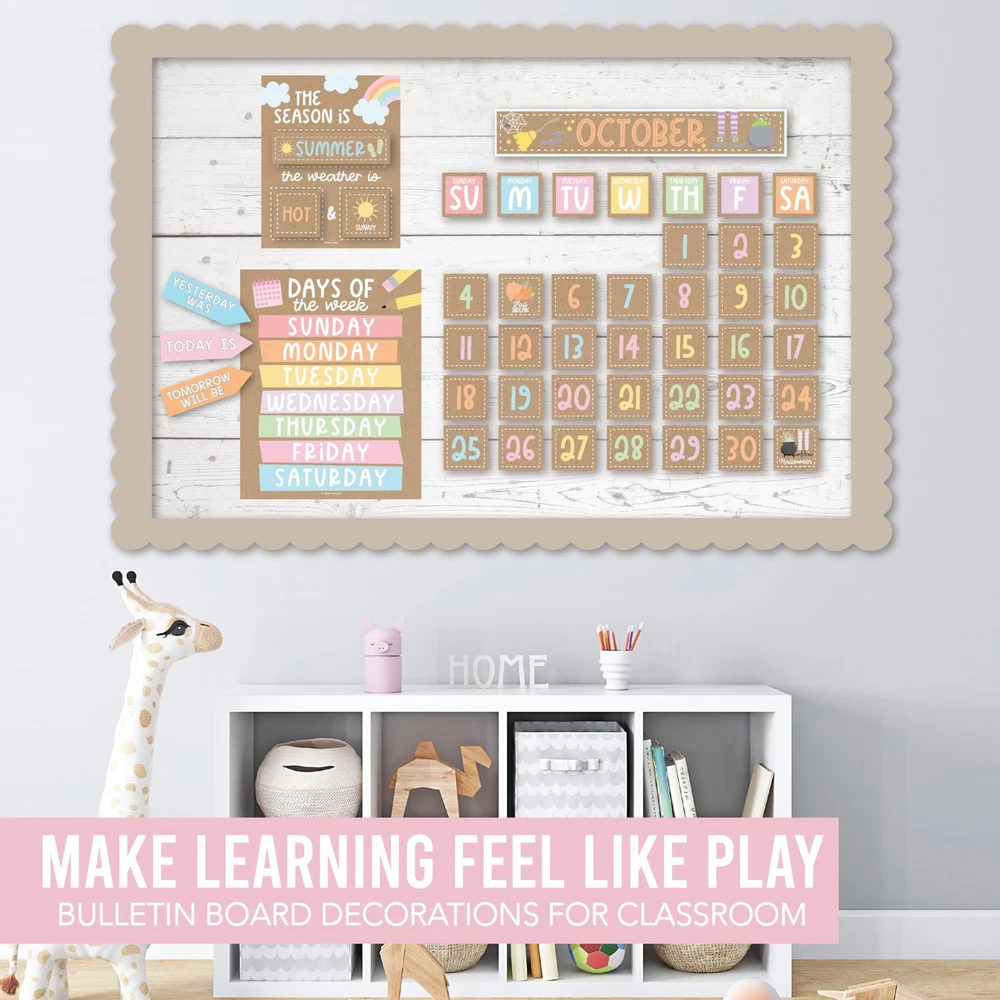 If You’re Looking To Make Circle Time Educational And Fun; Then you need this modern farmhouse calendar set for classroom elementary; While other calendar classroom are made overseas, our preschool classroom calendar set is proudly USA made Get Kids Excited About Their Day; You'll receive 98 individual calendar pieces, 1 - 8x10 weather chart, and 1 - 11x14 days of the week poster; Inspire a love for learning with this boho kraft school calendar for classroom elementary/teacher calendar for classroom Capture Attention And Boost Focus; This bright colorful calendar numbers for classroom helps grab and hold kids' attention; Skyrocket learning speed and retention with this classroom decorations, classroom wall calendar, months of the year bulletin board set Sharpen Critical Thinking Skills; Use as a bohemian homeschool calendar, kindergarten calendar for classroom, voice level poster for classroom, weather chart for classroom, months of the year for classroom, bulletin board decorations for classroom