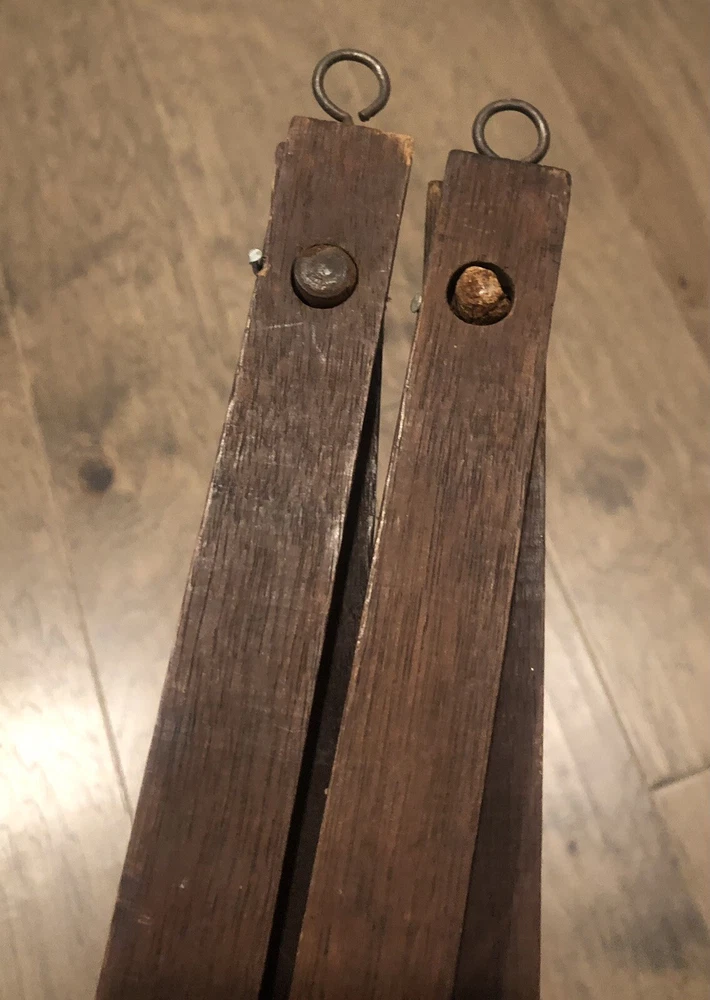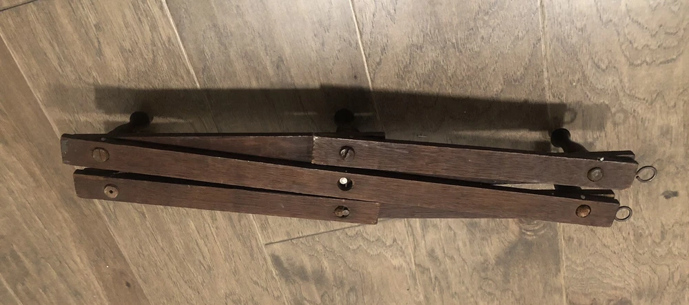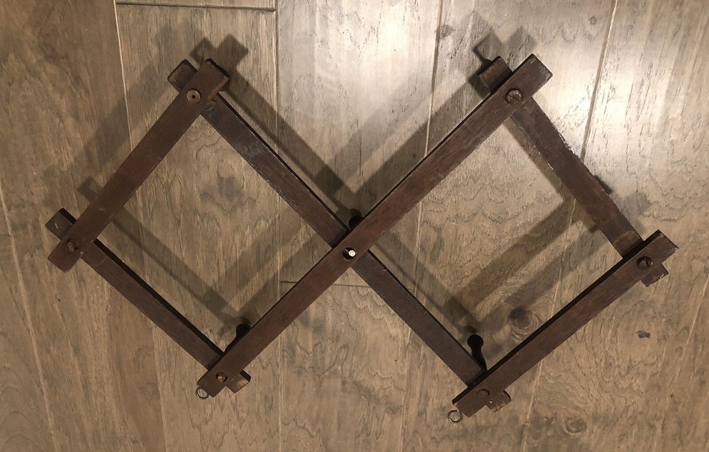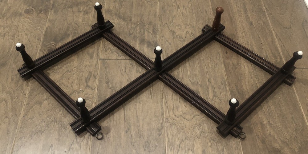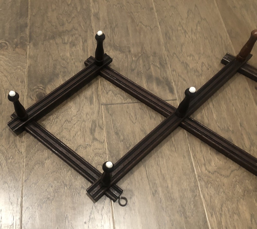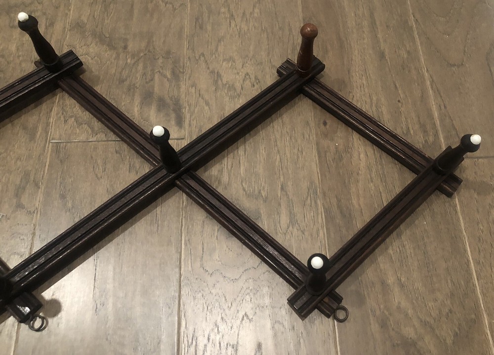This rustic expandable rack came from my grandparents' estate and is very old. As you can see one of the pegs was replaced over the years and has a different stain color and that peg is missing the porcelain tip. This rack still works but is very fragile and would likely be best to use to display lightweight items when hanging from these pegs. When collapsed this item measures approximately 19" long. When expanded as shown in the first picture the approximate measurements are: 25"x15". When mounted the measaurement from the wall to the tip of one of the pegs is approximately 4.75". Thank you for shopping with us! Please check out more of the unique items we have to offer ..... Visit Our eBay Store!
