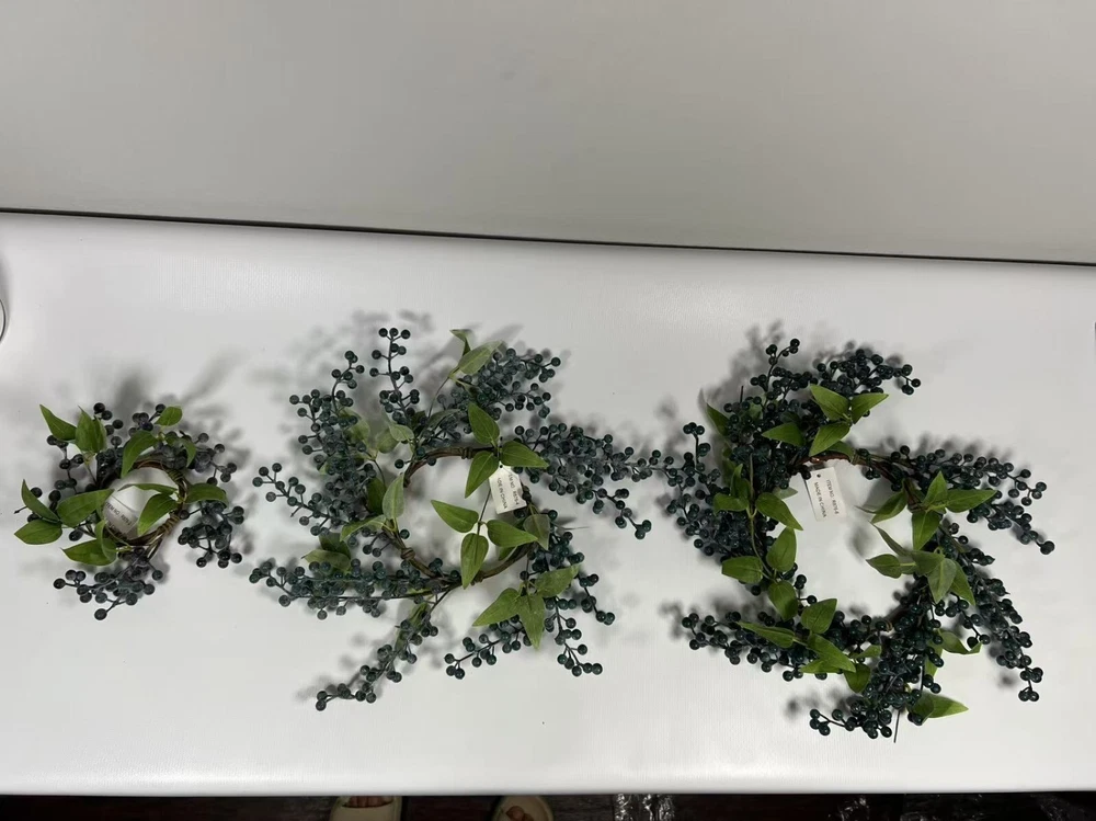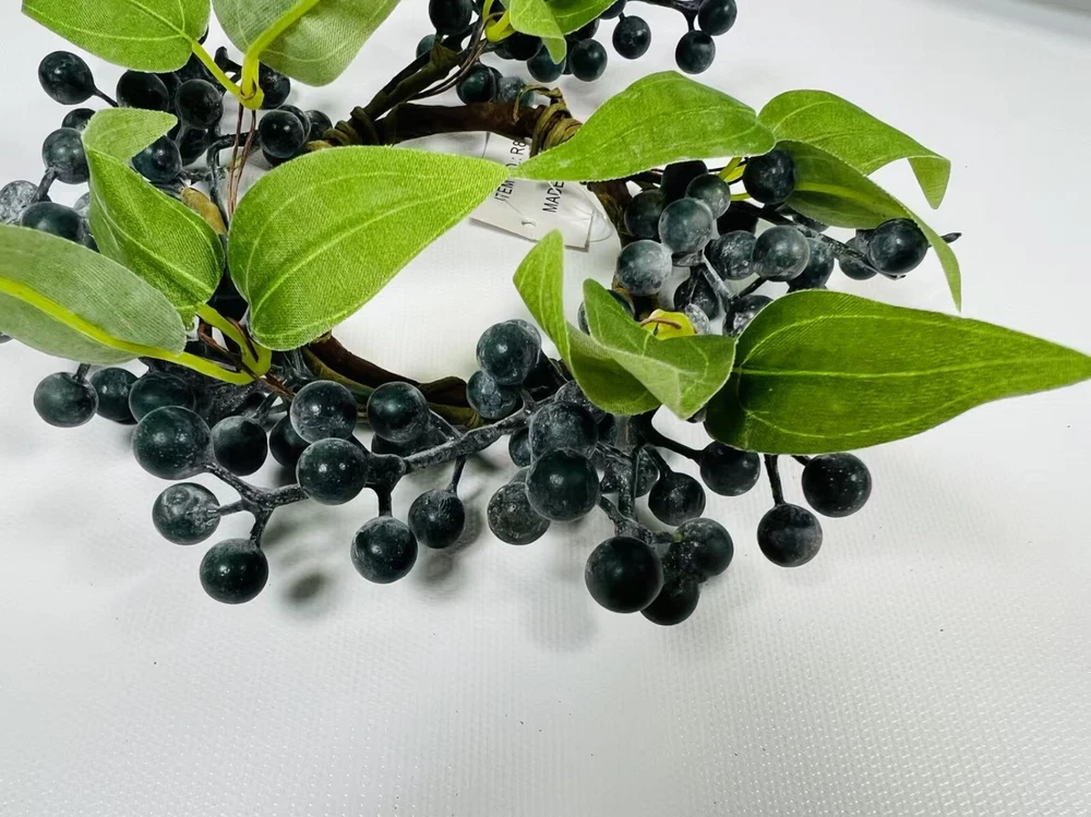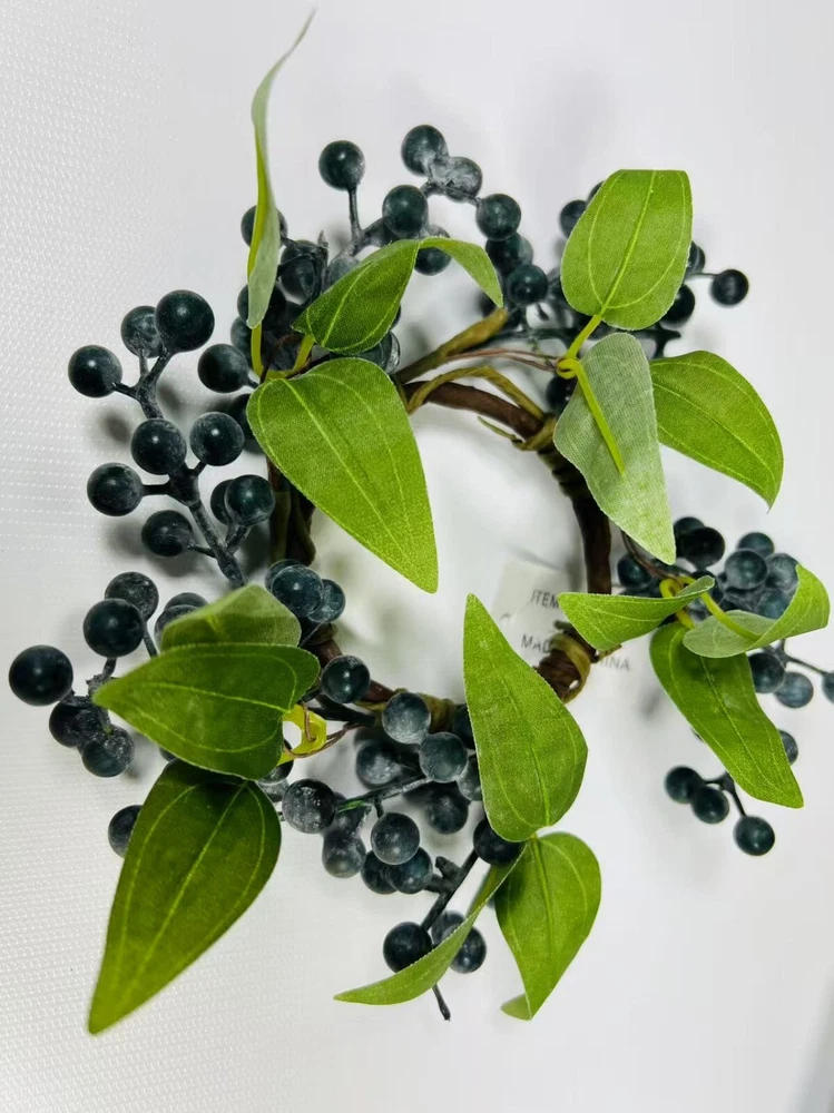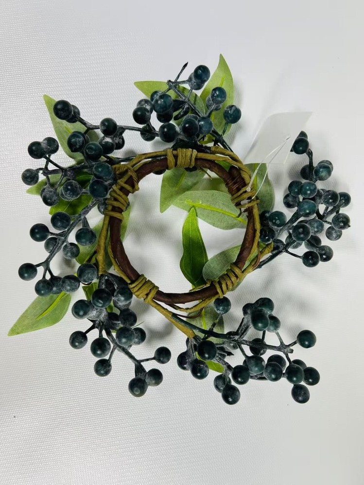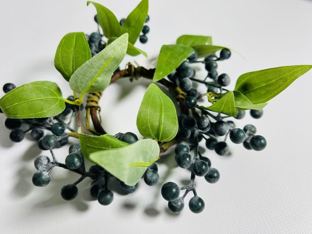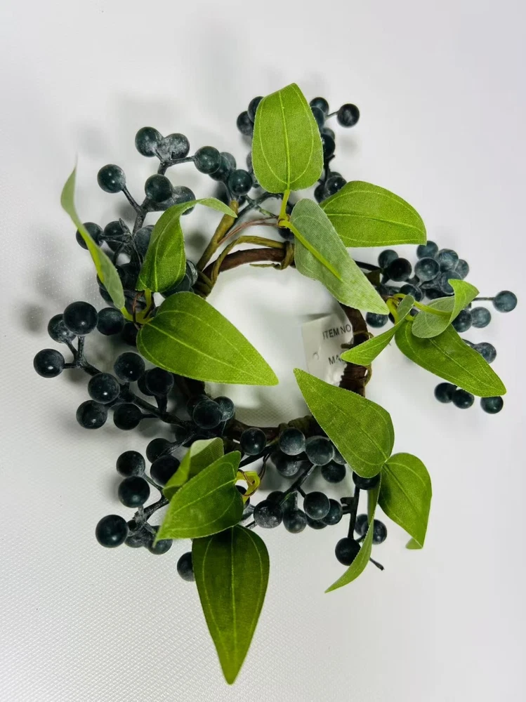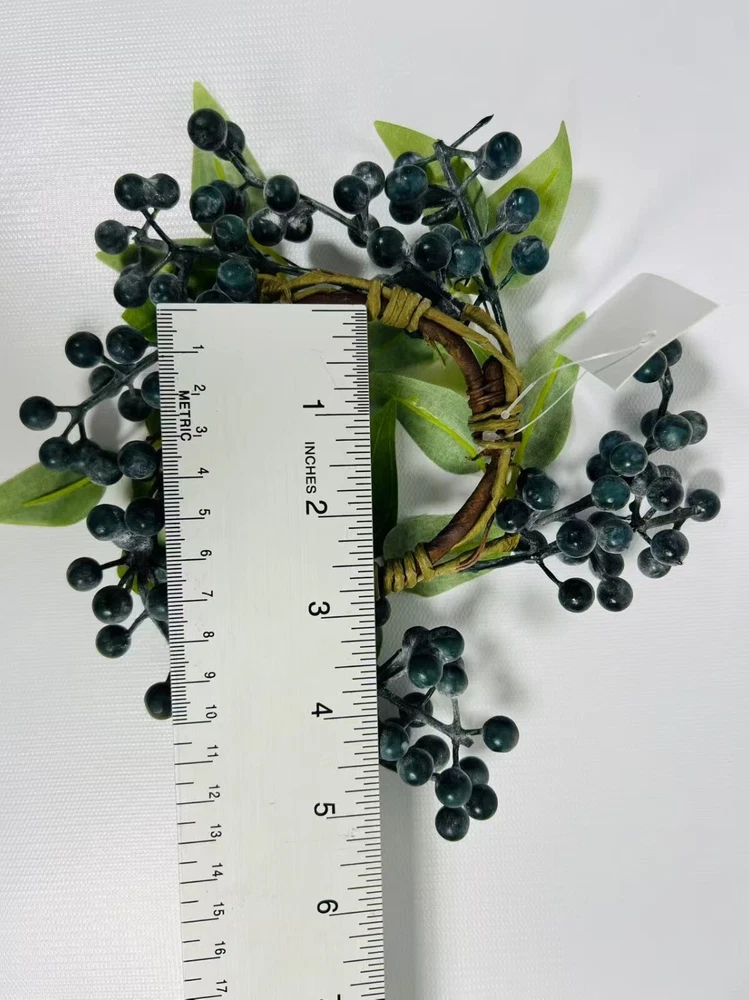 This 2.5” artificial blueberry candle ring is the perfect rustic accent for your home. Designed with lifelike navy berries on a flexible brown twig base, it fits beautifully around pillar candles, jars, or small vases. Whether used as part of a centerpiece, on a shelf, or for seasonal styling, this faux mini wreath adds charming farmhouse elegance to your decor. Durable, reusable, and easy to style.
