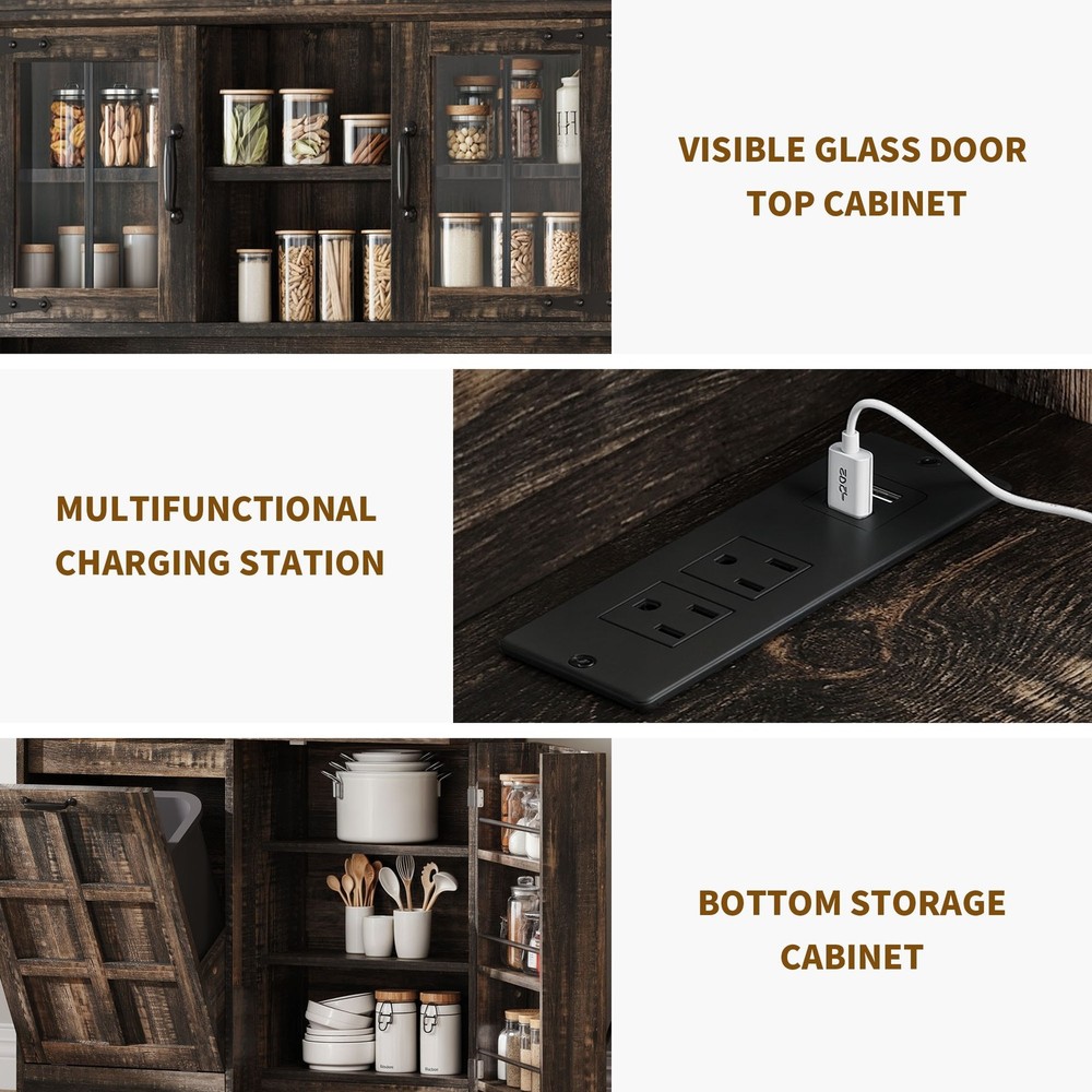 Elevate your kitchen with our 69" H Kitchen Pantry Cabinet, designed for efficiency and style. This versatile cabinet includes a designated area for a 13-gallon trash can (not included), keeping your kitchen organized and tidy. It features spacious drawers, a cupboard with doors, and an adjustable shelf for customized storage. Crafted from durable P2 particle board and equipped with an anti-toppling device, this cabinet ensures both strength and safety. Enhance your kitchen's functionality and aesthetics with this essential piece.Feature: Discreet Trash Bin Storage: The cabinet includes a designated area for a 13-gallon trash bin (not included), ensuring waste is neatly hidden and your kitchen remains clean and organized.Versatile Storage Options: With multiple compartments, 2 drawers, and Free Shipping Over $49.99* Details Farmhouse Kitchen Pantry Storage Cabinet Product Description: Elevate your kitchen with our 69" H Kitchen Pantry Cabinet, designed for efficiency and style. This versatile cabinet includes a designated area for a 13-gallon trash can (not included), keeping your kitchen organized and tidy. It features spacious drawers, a cupboard with doors, and an adjustable shelf for customized storage. Crafted from durable P2 particle board and equipped with an anti-toppling device, this cabinet ensures both strength and safety. Enhance your kitchen's functionality and aesthetics with this essential piece. Feature: Discreet Trash Bin StorageThe cabinet includes a designated area for a 13-gallon trash bin (not included), ensuring waste is neatly hidden and your kitchen remains clean and organized. Versatile Storage OptionsWith multiple compartments, 2 drawers, and an adjustable bottom shelf, this cabinet provides flexible storage for all your kitchen essentials, while a smart side shelf is perfect for seasonings and small jars. Built-In Power ConvenienceStay connected with 2 USB ports and 2 AC outlets integrated into the cabinet, ideal for charging devices or powering kitchen appliances right where you need them. Modern DesignFeaturing a sleek upper shelf with tempered glass and available in sophisticated white or rustic brown, this cabinet adds a contemporary touch to any kitchen decor. Durable & SafeConstructed from thickened engineered board for lasting durability, the cabinet includes a wall-anchoring kit to ensure stability and safety in your bustling kitchen.