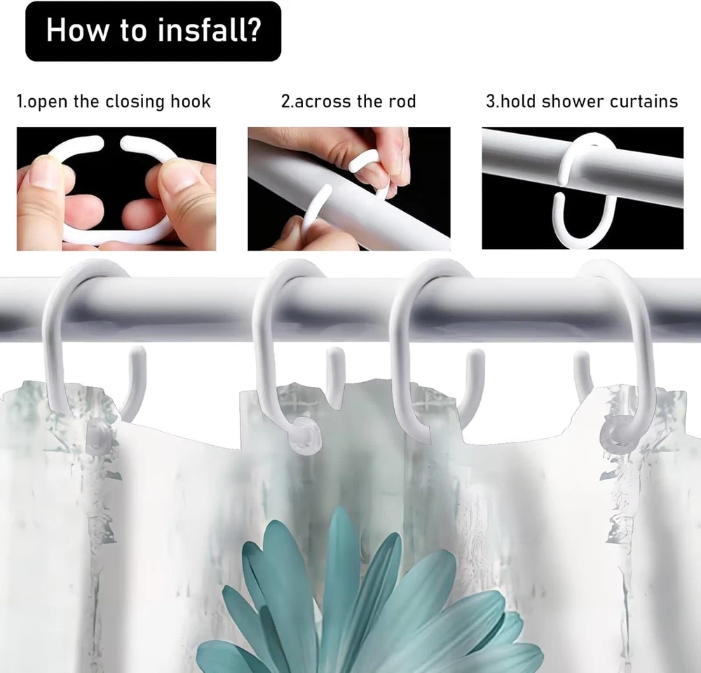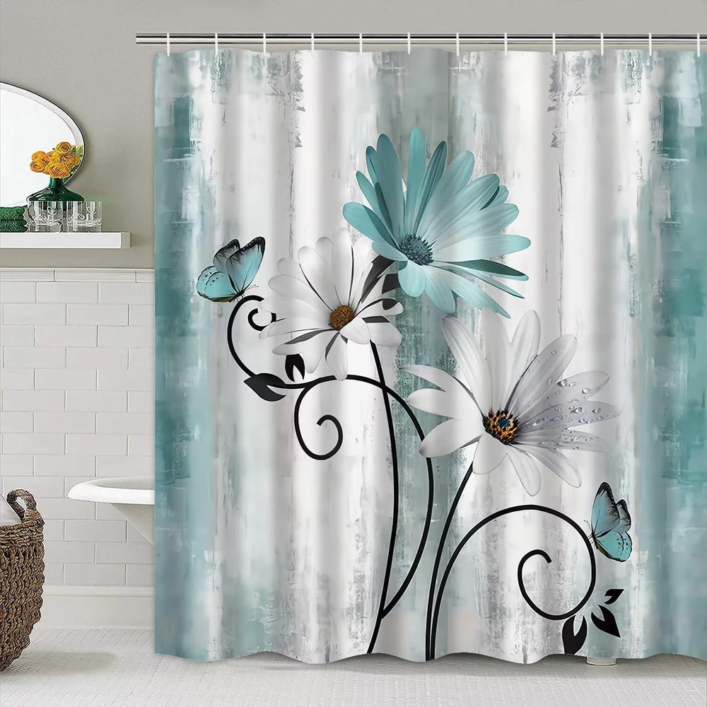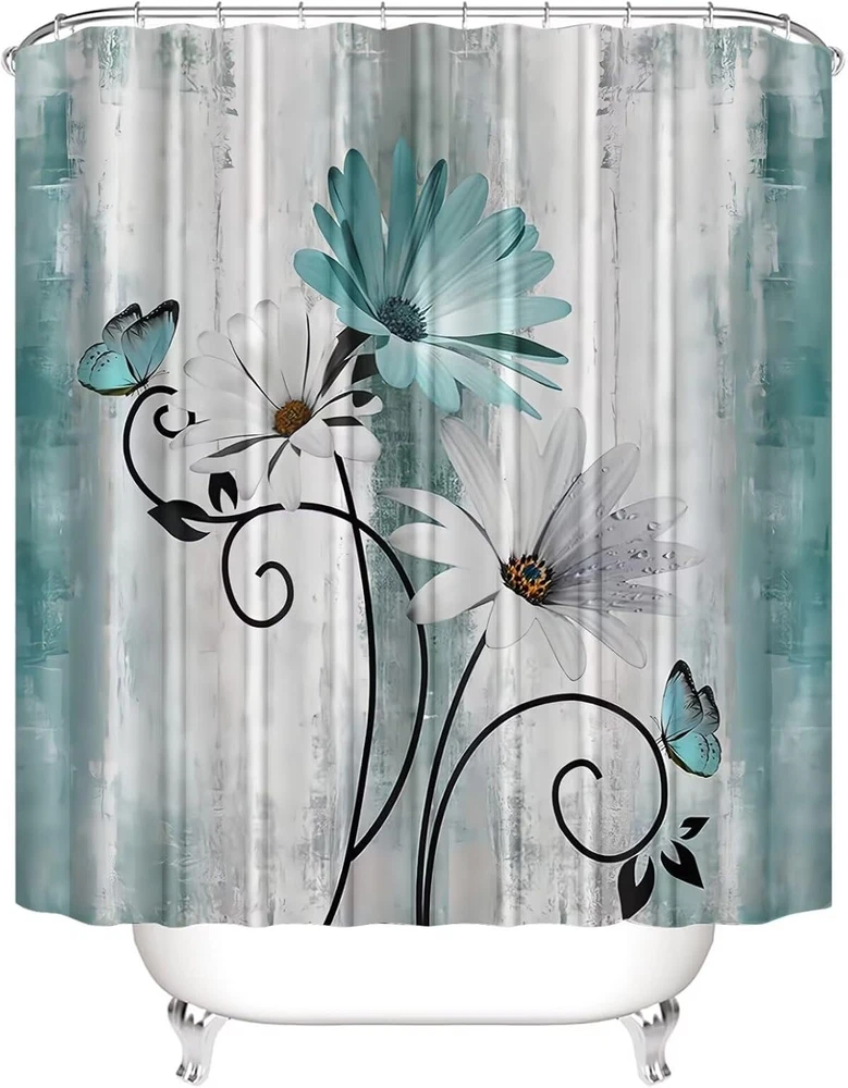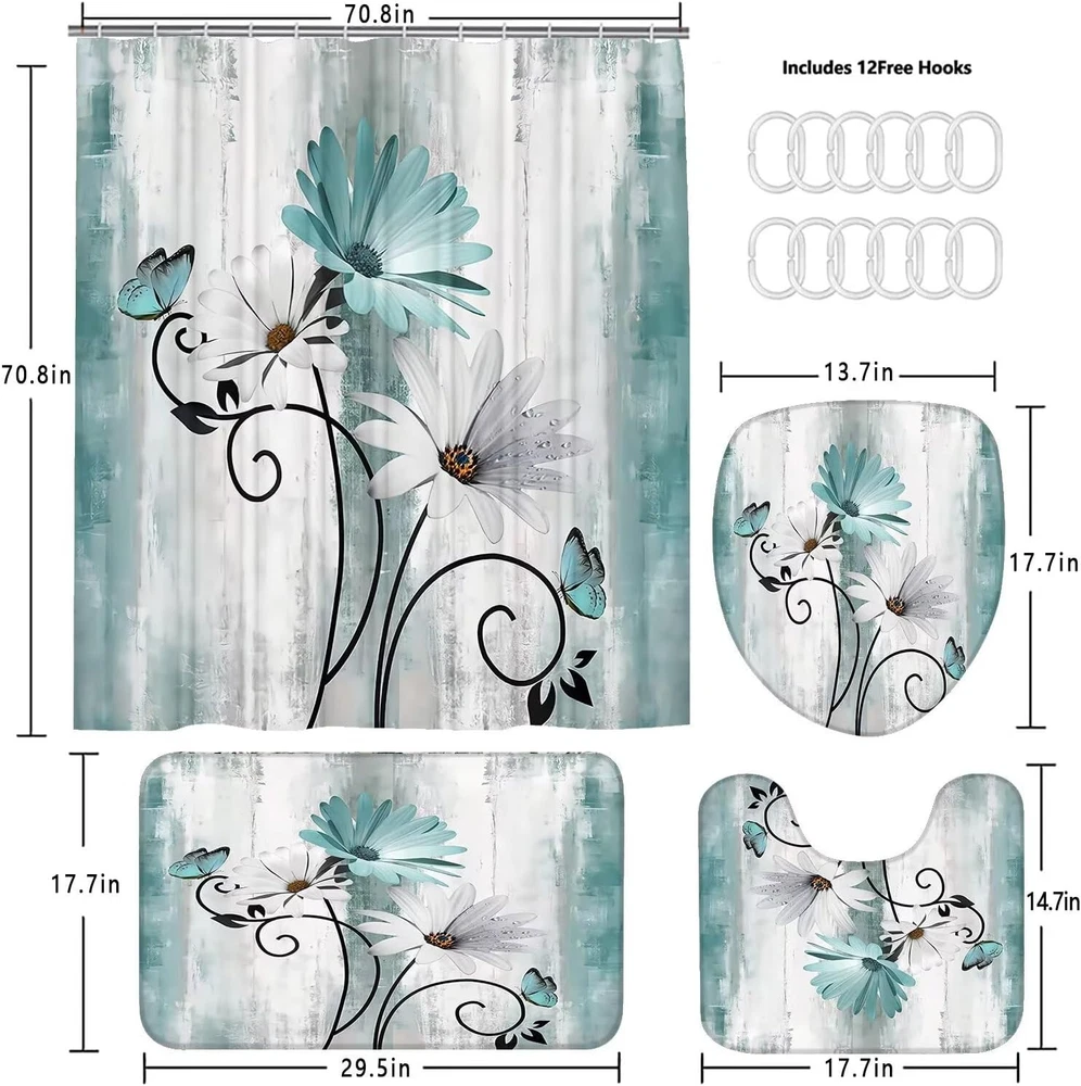 【4-Piece Shower Curtain Set】Set includes shower curtain, non-slip bath mat, toilet seat cover and U-shaped mat. 【SIZE INFORMATION】:The rustic farmhouse bathroom sets with shower curtain and rugs: 70.8" l x 70.8" w, the bathroom rug size: 29.5" l x 17.7" w, the toilet lid cover size: 17.7" l x 13.8" w, the u shape rug size: 17.7" l x 14.8" w. This bathroom sets size is suitable for most bathrooms. 【UNIQUE DESIGN】: Our white daisy bathroom decor set with shower curtain and hooks are printed with 3d hd pattern printing technology, colorfast. The clear image makes your bathroom/toilet more stylish and refreshing. 【EASY TO INSTALL & USE】: We provide 12 strong hooks free for you. You don't have to worry about how to install it. You can use this bathroom accessories set to decorate your bathroom, toilet, wall, window and any space where you like. 【pragmatic】: Our Welcome Farmhouse Rustic shower curtains for bathroom are pragmatic polyester fabric made, it prevents water splashing outside the bath area and keep your home clean and fresh. Product Description HIGH DEFINITION PRINTING Farm Teal Daisy Floral Shower Curtain Set Accents Bathroom's Sense of Ambiance. ABSORBENT BATH MAT The Farm Teal Daisy Floral shower curtain set comes with 12 plastic hooks for easy installation. Keep your bathroom and toilet dry. EASY TO INSTALL Farm Teal Daisy Floral Shower Curtain Set comes with 12 plastic hooks and is easy to install for most bathrooms. PACKAGE INCLUDE 1PC ×Farm Teal Daisy Floral Shower Curtain 1PC ×Bath Mat 1PC × Toilet Seat Cover 1PC × U-Shaped Contour Pads 12PCS × Plastic Hooks Preventing bath water splashing Farm Teal Daisy Floral Bathroom 4 Piece Set is made of high quality 100% pragmatic polyester fabric and ultimate waterproof coating technology, healthy, comfortable, skin-friendly, pragmaticand waterproof. Machine Washable Machine wash in cold water or hand wash, easy to clean, fast drying and colorfast. Greatly reduce your housework. Please do not bleach! Please do not expose to sunlight!
