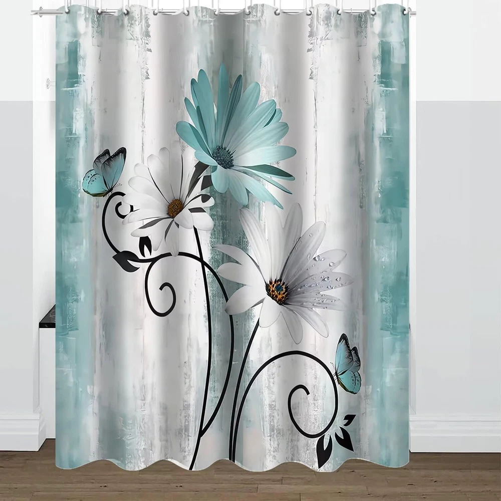 Rustic Farmhouse Shower Curtain Set 4Pcs Farm Teal Daisy Floral Bathroom Decor S