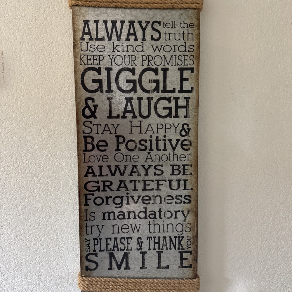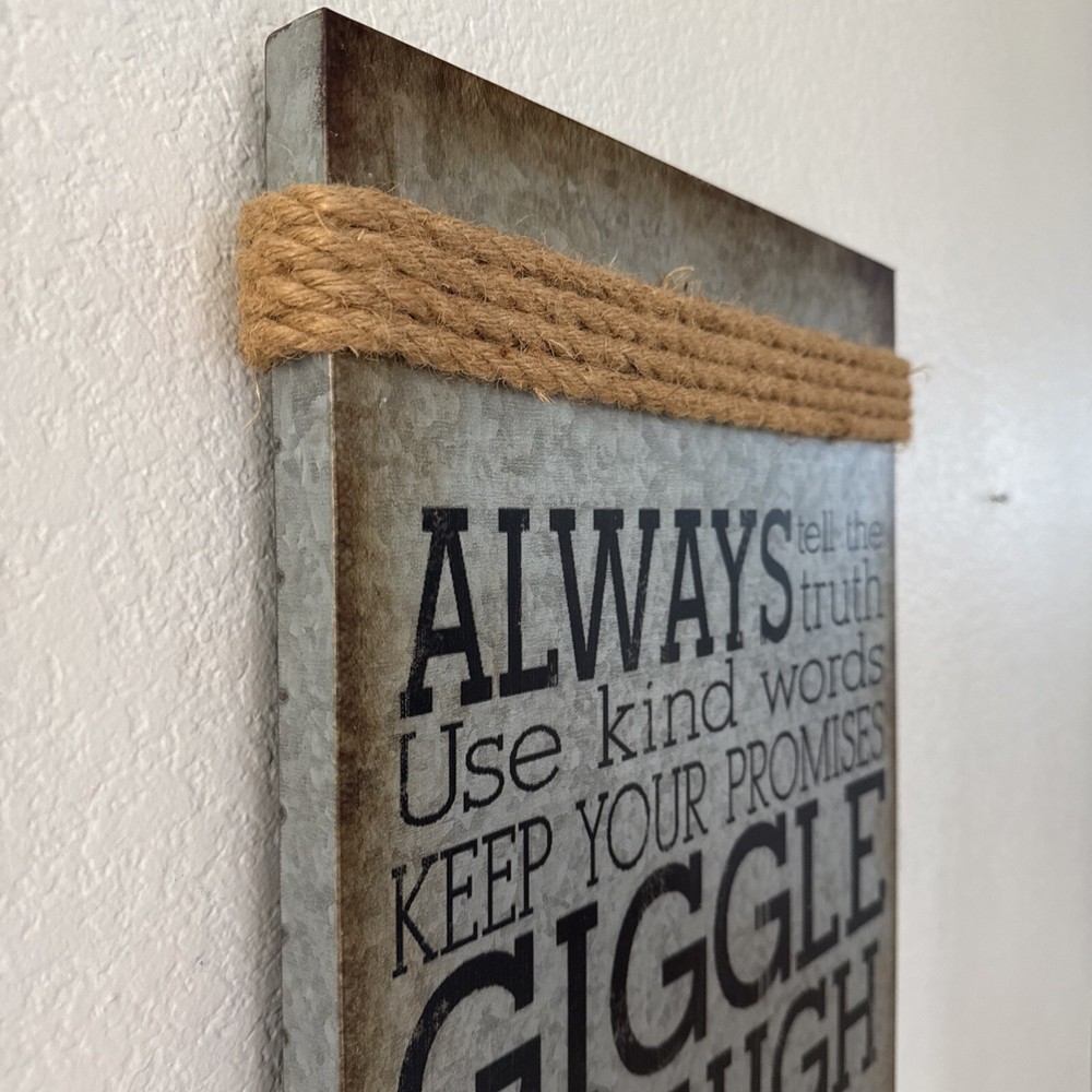 Add a touch of rustic charm to your home decor with this large farmhouse style wall sign. The sign is made of mixed materials including stainless steel and has a silver finish. It features a family-oriented theme and is designed to be a decorative piece that will add character to any room. The sign measures 37.5 inches in height and 14 inches in width, making it suitable for teens, adults, and kids. It is easy to care for and does not require any additional parts to be displayed. Bring the warmth of the countryside into your home with this beautifully crafted wall sign. ALWAYS tell the truth Use kind words KEEP YOUR PROMISES GIGGLE & LAUGH STAY HAPPY& Be Positive Love One Another ALWAYS BE GRATEFUL, Forgiveness Is mandatory try new things PLEASE & THANK YOU, SMILE