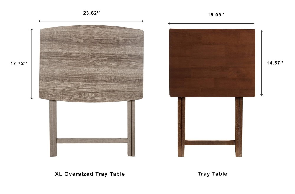 Indoor Oversized Single Folding Tray Table, Rustic Gray, 26" x 23.6 x 17.7" inches. Assembly height 26 inches thoughtfully designed to effortlessly fold away conveniently when not in used, saving spaces when needed. Its classic minimal curved rectangular table top shape along with open up X-frame bases make these table not only look good but also help with stability. Its wooden rustic gray finish looks also sure to compliment any decor scheme! It is ready to use, stylish, durable, light weight and easy to store tables on hand! It sits at a perfect height while you're seated, and rest on intersecting legs to create a strong base for anything you put on its surface. It is the perfect addition to dorm rooms, or smaller living spaces. Use it to instantly creates a desk, small kitchen table and work surface, meals by the television. Its sleek design can also fit in with many styles of décor, a perfect choice for every home. Constructed of MDF tabletop and solid rubberwood leg. Table measurement 26" H x L 23.6" x W 17.7" inches. Enhance your living space with the Indoor Oversized Folding Tray Table in Rustic Gray. This versatile and stylish table effortlessly combines functionality with rustic charm, making it an ideal addition to any home. Elevate your home with the Indoor Oversized Folding Tray Table, a versatile and reliable piece that effortlessly combines style and utility. Order yours today and experience the convenience of functional furniture that complements your lifestyle. indoor XL oversize tray table folded dimension: 29'' H x 1.7'' W x 19'' L inches. No assembly require for XL folding tray tables. The weight of table is 4.55 KG which make it easy portable from one place to another. Indoor XL Tv Tray Oversize Sturdy Construction: Crafted with a combination of durable MDF and solid Rubberwood, this table ensures longevity and stability. The robust build can withstand daily use, making it a reliable choice for your indoor spaces. Indoor XL Tv Tray Oversized Design: With dimensions of H26" x L23.6" x W17.7" inches, this table provides ample surface area for a variety of activities. Whether you're enjoying a meal, working on your laptop, or simply need extra space for decor, this oversized tray table has you covered. Foldable Convenience: The folding feature adds practicality to this table, allowing for easy storage when not in use. Perfect for those with limited space, the foldable design ensures you can tuck it away effortlessly when you need to reclaim your living area. Rustic Gray Aesthetics: The rustic gray finish adds a touch of sophistication to your decor. The neutral color blends seamlessly with various interior styles, making it a versatile and stylish choice for any room. Indoor Lightweight Portability: Weighing only 4.55 KG, this table is easy to move around as needed. Whether you're rearranging your living space or hosting guests, the lightweight design ensures you can effortlessly transport the table wherever it's needed. MDF Table Top and Rubberwood Legs: The MDF tabletop offers a smooth and easy-to-clean surface, while the solid Rubberwood legs provide a sturdy foundation. The combination of these materials ensures both aesthetic appeal and practical functionality. Indoor Folded dimension: 29'' H x 1.7'' W x 19'' L Tray table measures 26" H x 23.6" W x 17.7" D Indoor Table weight 4.55 KG