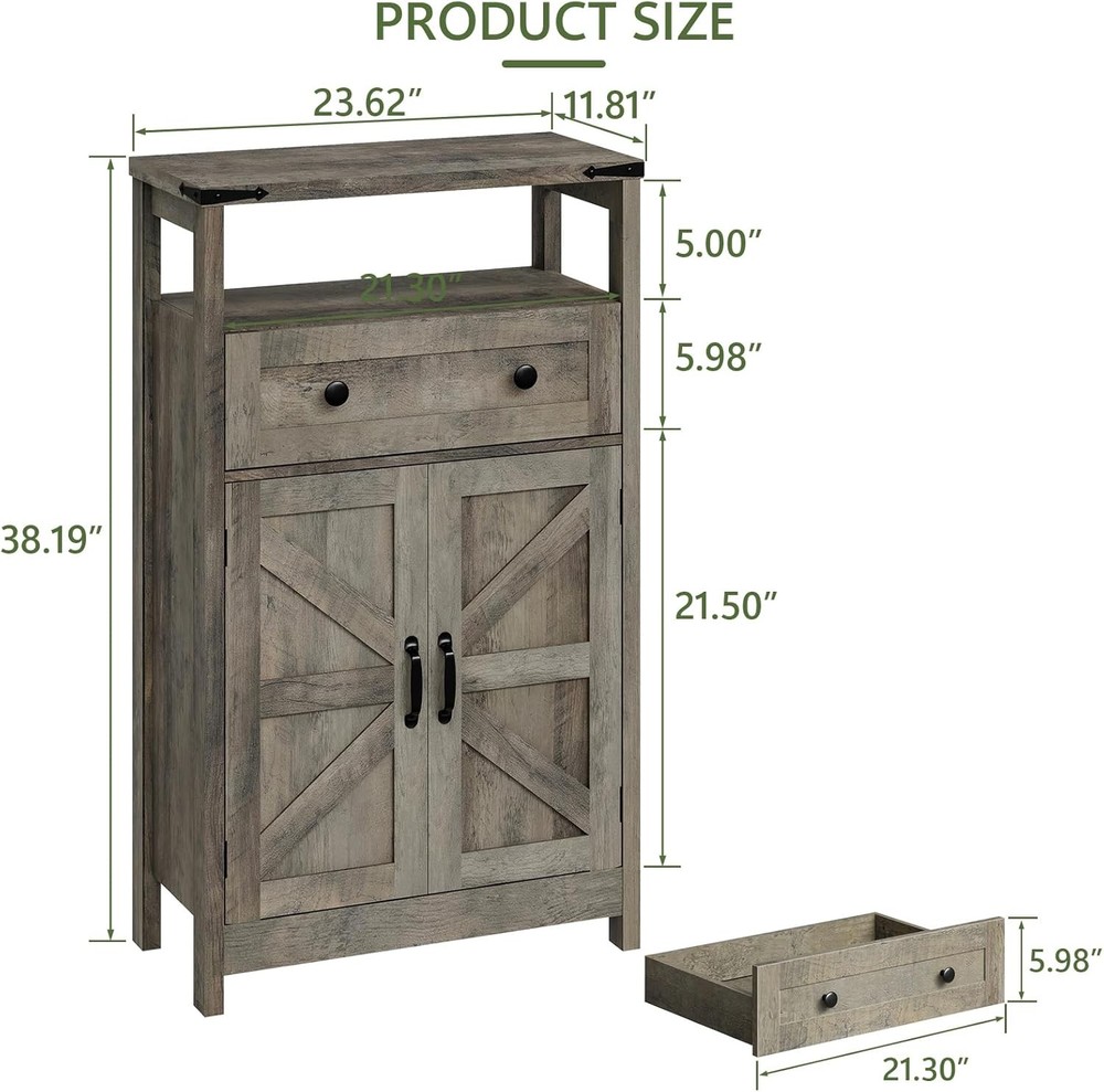 Small Cabinet with Drawer - Side Storage Organizer, Farmhouse Rustic Style, Grey for Bathroom, Kitchen, Living Room Product Description About this item 🌳【Sturdy and Durable Construction】 Our bathroom storage cabinet features a thickened top board, ensuring excellent weight-bearing capacity and durability. This robust construction makes it perfect for holding heavy items such as toiletries, decorative pieces, or even small appliances, adding both function and style to your bathroom. 🌳【Open Storage Space】Just below the top board, the cabinet boasts an open storage space that is ideal for quick access to everyday essentials. Whether you need to grab a towel, your favorite skincare products, or other bathroom necessities, this easily accessible area helps keep your space organized and clutter-free. 🌳【Spacious Middle Drawer】 The large middle drawer provides ample storage for a variety of items. It’s perfect for storing smaller, less frequently used items out of sight yet within easy reach. The smooth sliding mechanism ensures effortless operation, making it convenient to access your belongings whenever needed. 🌳【Adjustable Shelving】 The bottom storage cabinet includes an adjustable wooden shelf, allowing you to customize the storage space according to your needs. This feature is ideal for accommodating items of different sizes, from tall bottles to stacked towels, providing versatile storage solutions tailored to your preferences. 🌳【Elegant and Functional Design】 Combining functionality with a sleek design, our bathroom storage cabinet seamlessly integrates into any bathroom decor. Its modern aesthetic, coupled with practical storage options, not only enhances the look of your bathroom but also adds convenience to your daily routine, keeping everything tidy and in its place. Bathroom Storage Cabinet Upgrade your space with our versatile bathroom storage cabinet. Farmhouse Storage Cabinet Bathroom Storage Cabinet Transform your bathroom into an organized and stylish oasis with our premium bathroom storage cabinet. Crafted with a thickened top board, this cabinet ensures unmatched durability and impressive weight-bearing capacity, perfect for displaying your favorite decor or holding everyday essentials. Beneath the sturdy top lies an open storage space, providing easy access to frequently used items, keeping your bathroom clutter-free and beautifully arranged. Feature Metal Handle Large Capacity Drawer Adjustable Board Thickened Top Shelf Versatile and stylish storage for any room.