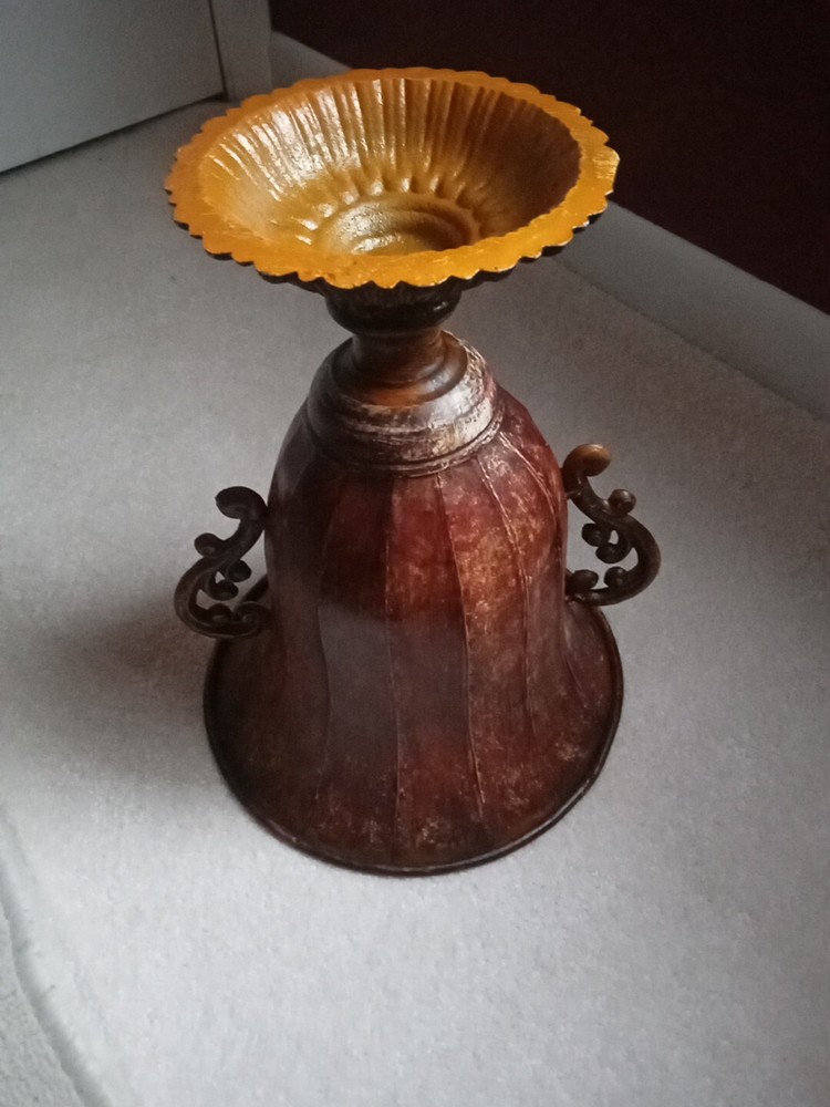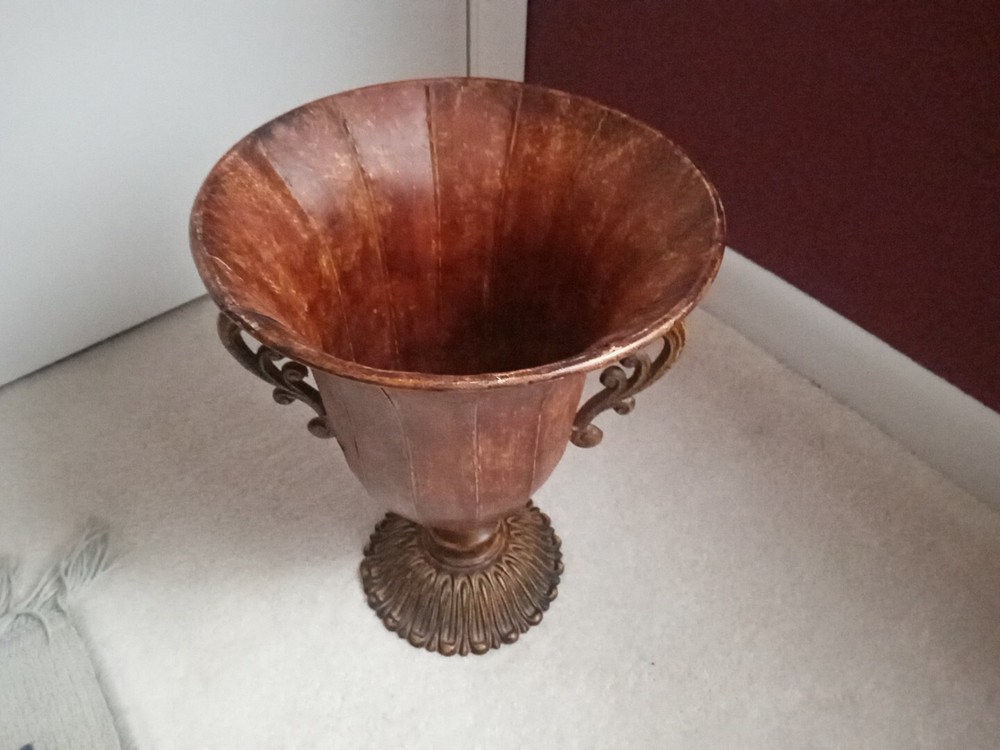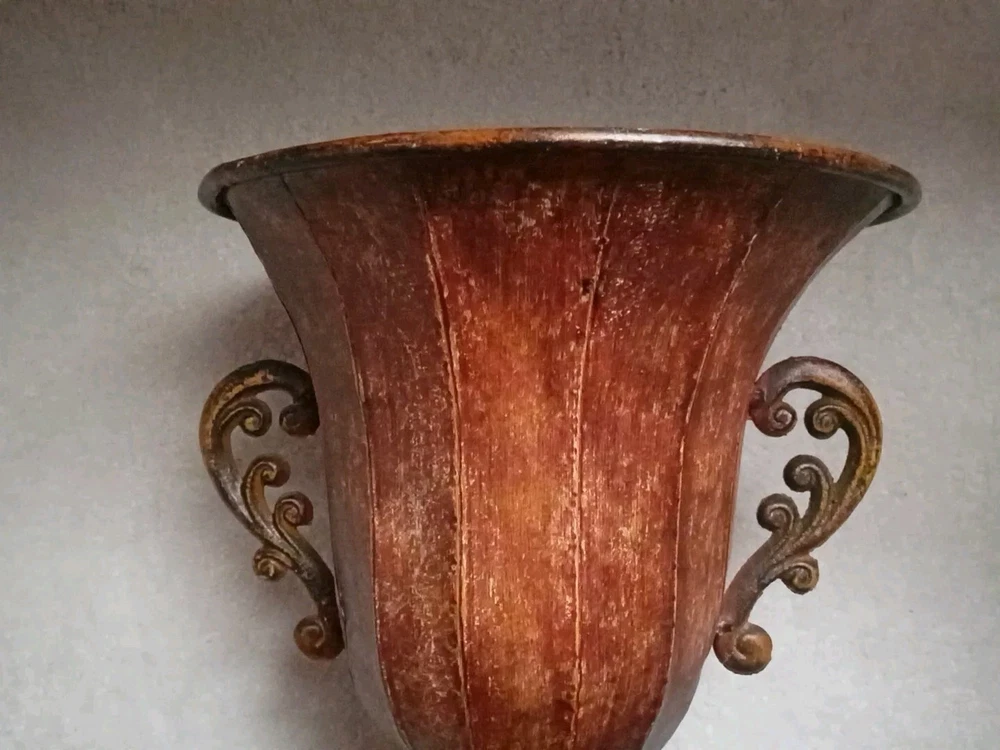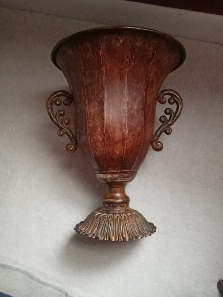 This urn planter is a large faux antique distressed metal vase with a rustic multicolor finish. It measures 12 inches in height, 10 inches in width at the rim, and weighs a solid 4 pounds. This free-standing indoor planter has a vintage style and can be used in any room as a decorative vase or planter.