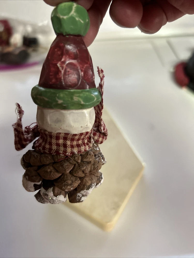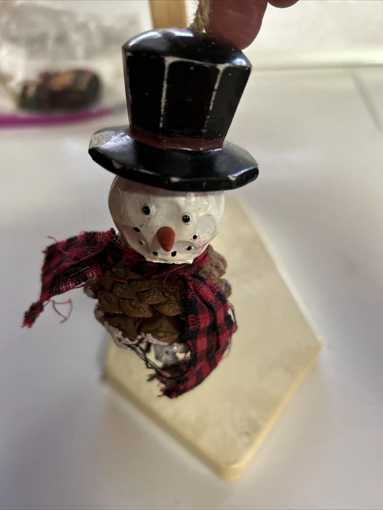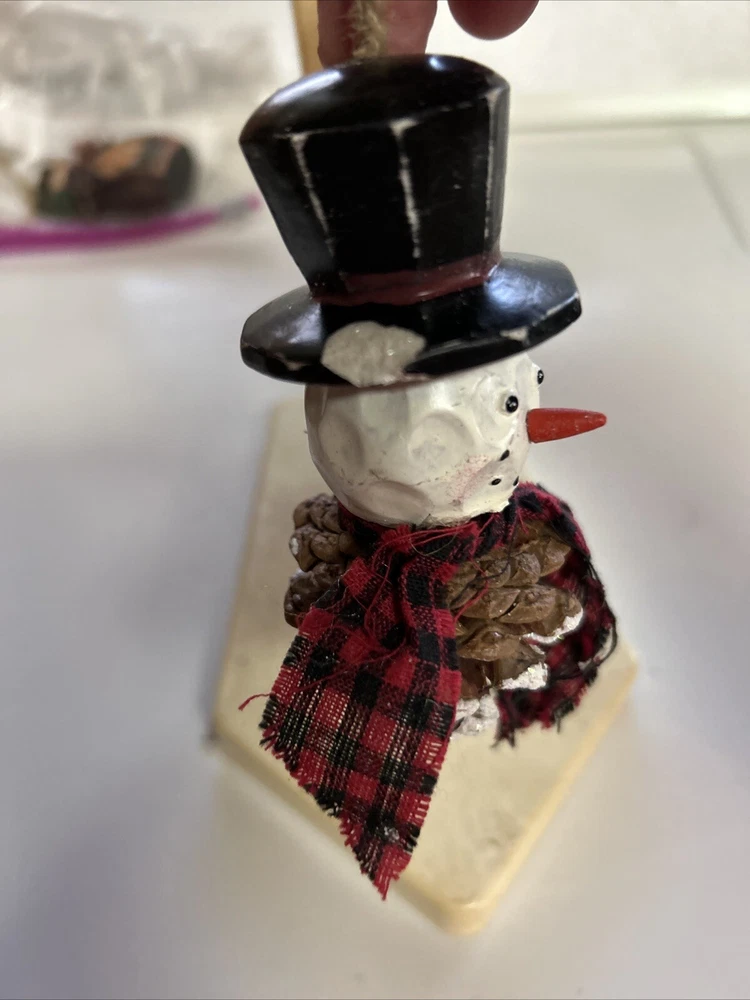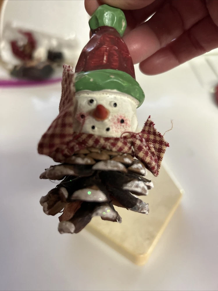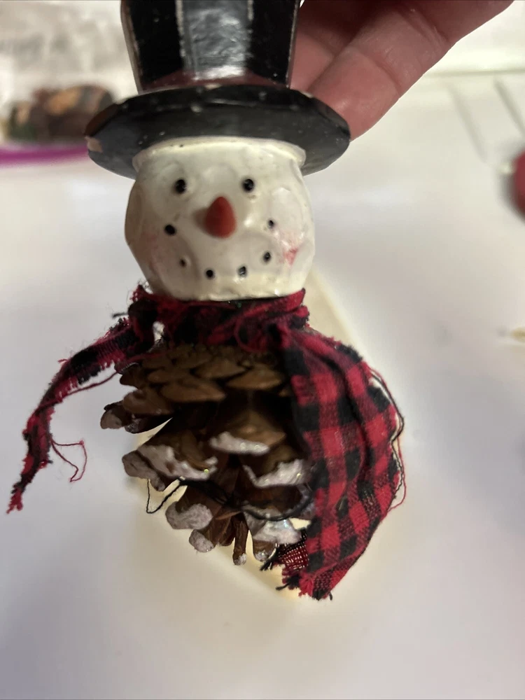The "Rustic Lodge Snowman Christmas Ornament" set includes three medium-sized snowman ornaments crafted from resin. Each snowman measures 4 inches in height and length, featuring a multicolor design with a rustic theme perfect for a holiday cabin decor. These vintage ornaments from the 1990s by the brand Lodge can be hung on a Christmas tree or around the house, adding a festive touch to the Christmas season. Good condition ** pine cone has split (bottom half) real pine cone. Hat on one snowman has abrasion (both shown in photos)