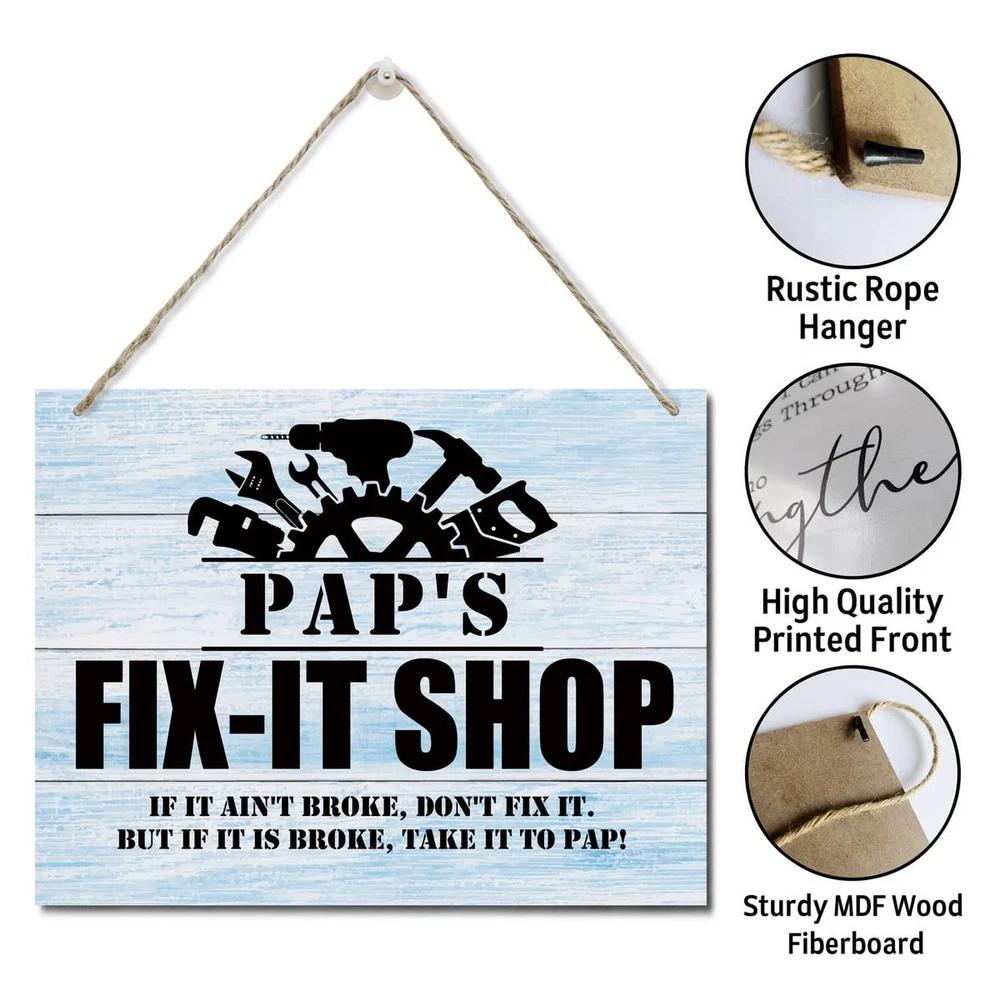Rustic "Pap's Fix-It Shop If It Ain't Broke, Don't Fix It." Wall Art Sign, Hanging Printed Wall Plaque Wood Signs, Farmhouse Decor, Home Decor, Father's Day Gift for Grandpa 10 X 7.8 inch Product Details Style: Paps Fix-It Shop Brand: AUII JO DESIGN MPN: 1 UPC: Does not apply EAN: Does not apply Color: white Brand: AUII JO DESIGN Material: Engineered Wood, Wood Theme: Rustic,Farmhouse Mounting Type: Wall Mount Product Dimensions: 10"L x 0.12"W Shape: Rectangular Style: Paps Fix-It Shop Item Weight: 3.84 ounces Manufacturer: AUII JO DESIGN Country of Origin: China Item model number: 1 Material: Made of high quality MDF wood material with hemp lanyard, the decoration is odorless, not easy to fade, very durable and not easy to damage. Size is 10 x 7.8 x 0.12 inch, 26 x 20 x 0.3 cm Easy to use: The wooden wall sign is equipped with a hemp rope hanging strap, which is convenient and simple for you to quickly and easily do wall installation, perfect for your home, office, business, garage, dorm, game room, kitchen or anywhere you want to display this unique logo. Beautifully Crafted: Our signs make a great gift, our wooden signs are beautifully printed and durable, we have hundreds of different designs to choose from to give your house a chic finish; suitable for indoor use, can also be used outdoors, as long as the environment is not humid. BEST GIFT: Our wooden signs will look great in your home and friends' homes. This is a versatile gift for Christmas, Thanksgiving, outdoor or indoor parties, birthday parties, New Years decorations, and a great decorative gift for friends or family; hope it will give you encouragement and joy or remind Size: 10 x 7.8 x 0.12 inch; Material: Made of MDF wood material; If you are looking for a unique gift for your home or friends who want to give them positive energy, this is the one for you.
