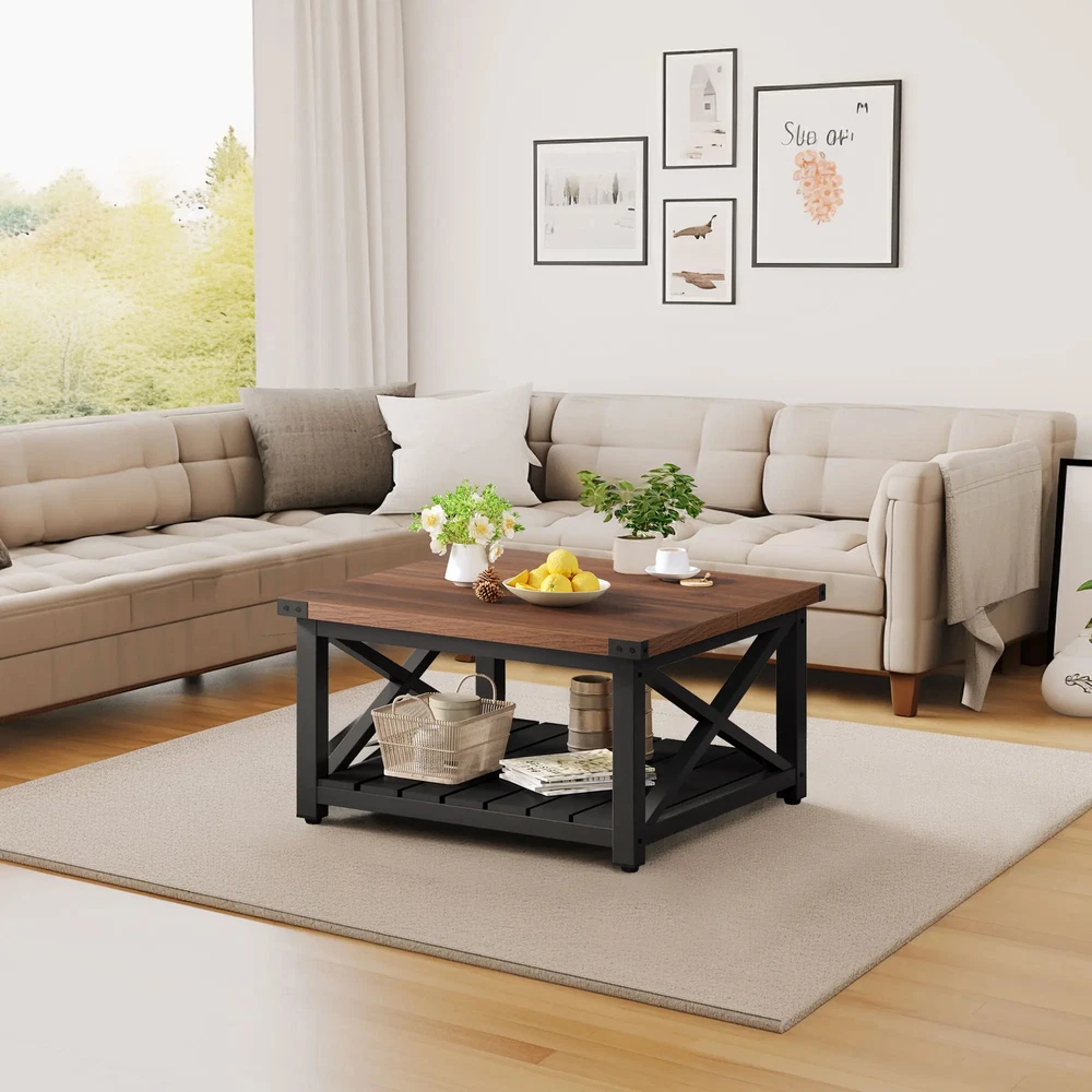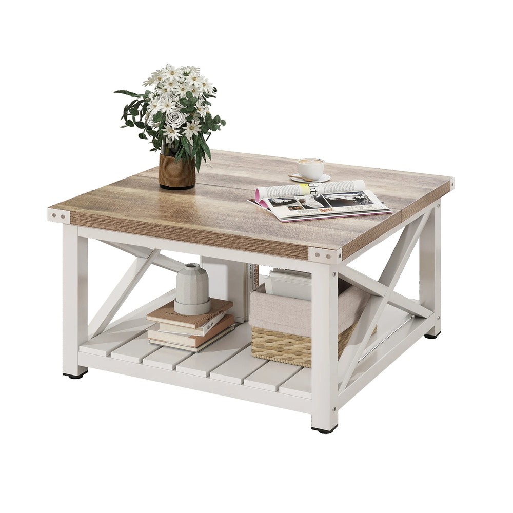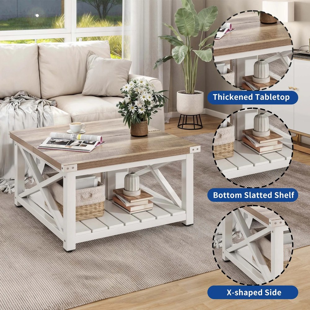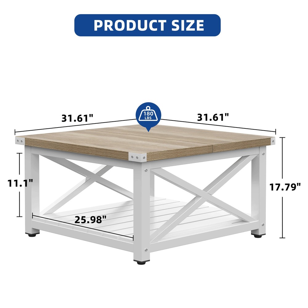 Bottom Slats Design The slats at the bottom of the coffee table living room add a farm style, and the thickened panels increase the weight and can hold more items. Sturdy Wooden Construction The coffee table stable frame consists of thick well-made boards, featuring excellent weight capacity of 176 lbs and ensures better durability. Strong Legs of Iron Center table with 1.57 inch thick iron legs, more solid and stable. 2-tier Storage Space Large storage spaces of square coffee table allow you to freely display or store items. Ideal for living room, study, bedroom, etc. Specifications: Color: Grey Wash,Walnut Escalation point:Side X design and bottom slats Size:31.5" D x 31.5" W x 17.7"H The max weight capacity:176LBS Style:Farmhouse and harmonious Base Type:Legs Package Includes: 1 x Coffee Table 1 x Accessory Kit 1 x Instruction