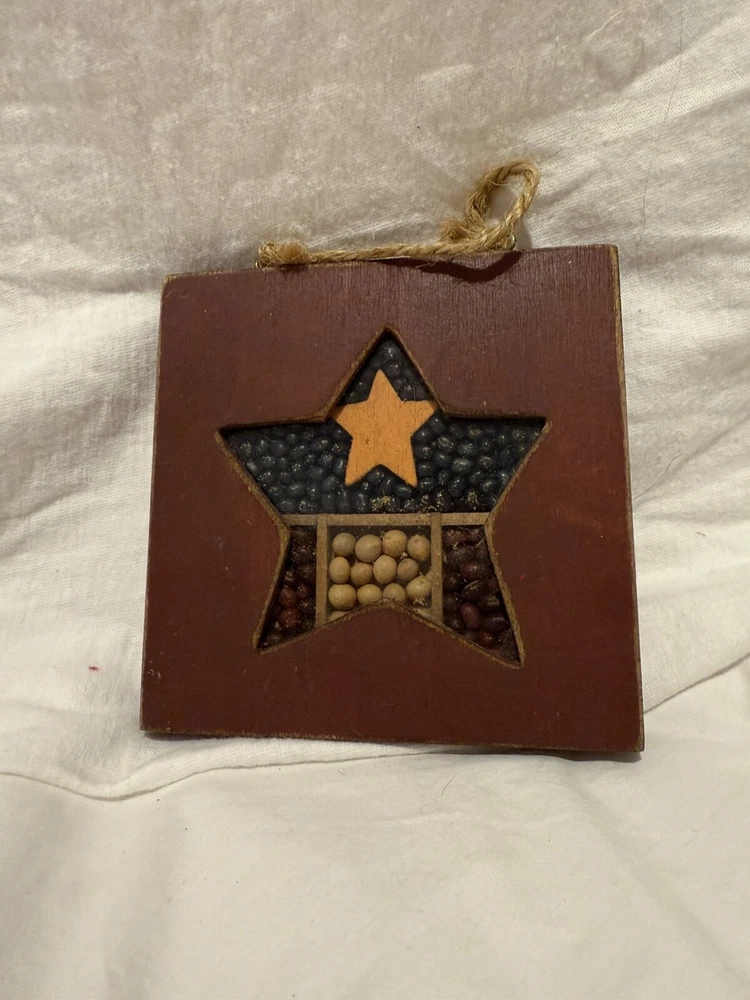 Add a touch of rustic charm to your home decor with this beautiful wooden star decoration. The star features seeds inside, adding a unique and decorative touch to the piece. The brown, red, white, and blue colors give it a patriotic vibe, perfect for a country and western or Texas-themed room. This vintage wall decor piece from Decor is perfect for those who love a primitive style. The star's shape and material make it a great addition to any room. It's easy to display and will surely catch the eye of any guest.
