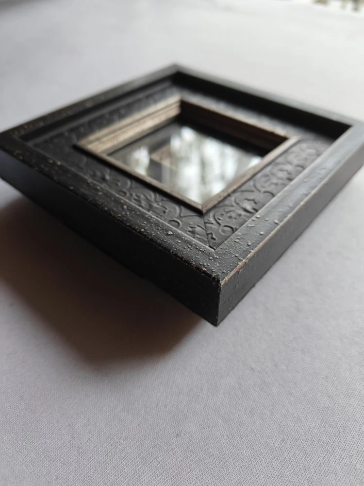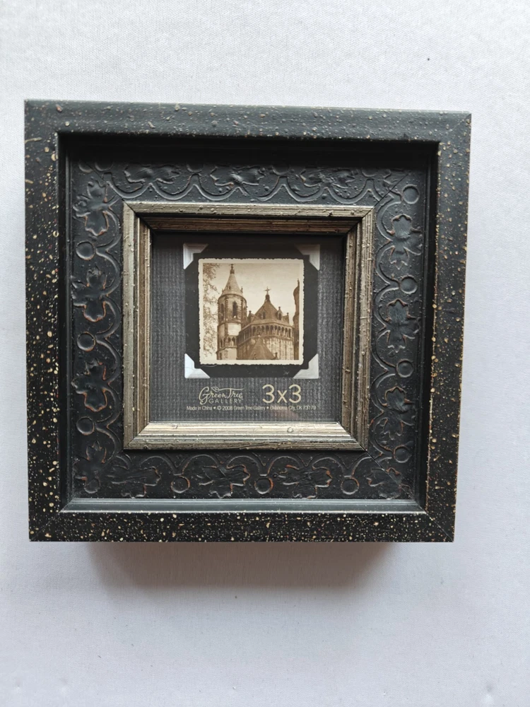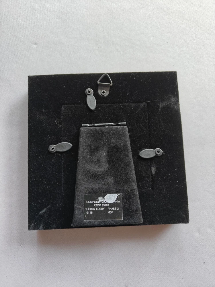 This rustic Hobby Lobby picture frame features a brown wooden material with a textured finish, adding a touch of charm to any home décor. frame is designed to hold a 3x3 inch photo. The rustic design of this frame makes it a perfect addition to any room in need of a cozy and inviting touch. outer measurements of frame are 5 1/2 by 5 and 1/2 by 1 in