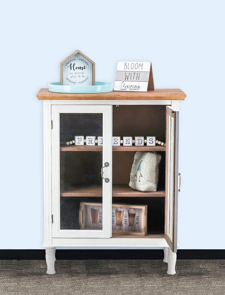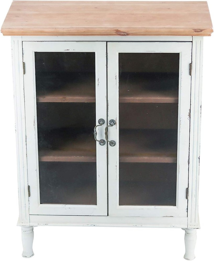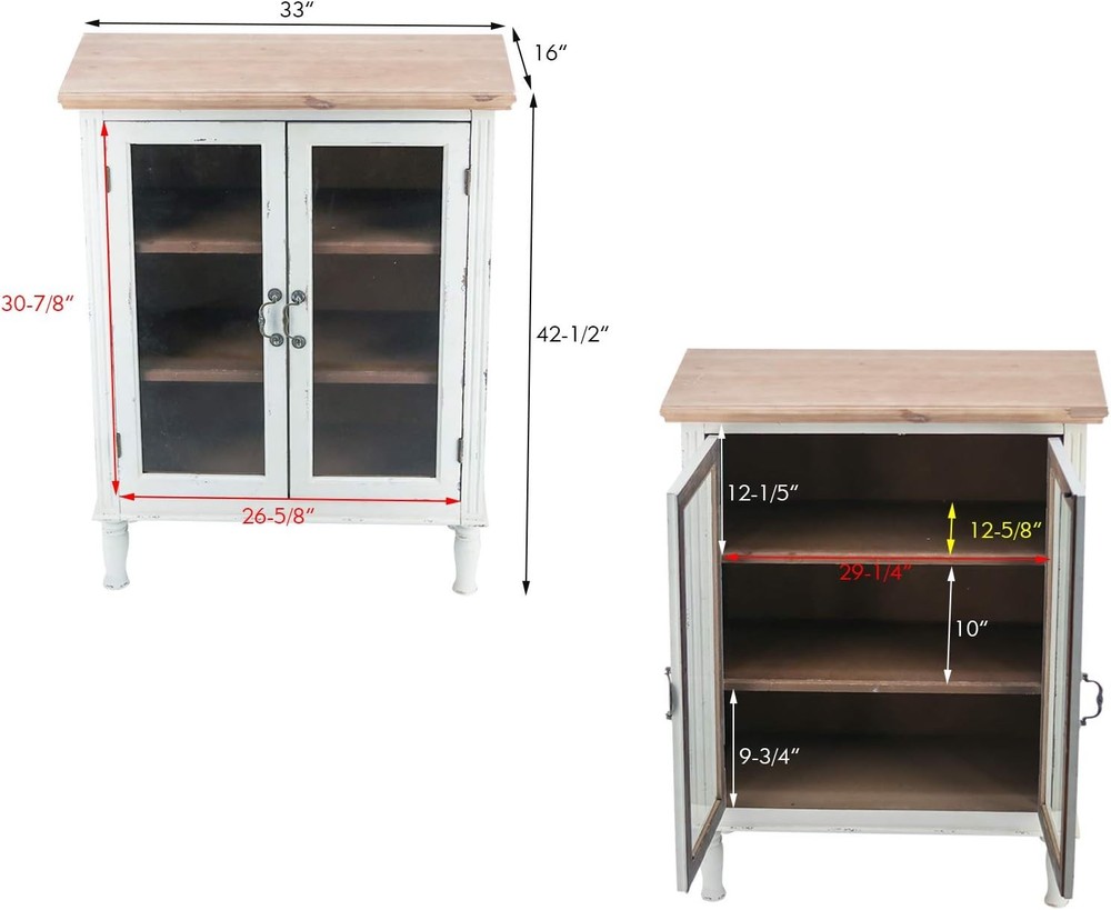 Product Description About this item • Wood Accent Storage Overall Dimensions: 33-1/8"W x 15-1/2"Dx 42-3/4"H. • This charming furniture is designed with a distressed white finish, a brown wood top, 3 shelves inside, and 2 real glass doors with magnetic closures and vintage metal handles. • The Rustic Wood Cabinet is simple but sturdy to use for years and will blend in any decor scheme and organize your living space with a classic, antique vibe. • Perfect to place in your bathroom or kicthen to organize cloths and towels and tableware! • Assembly is required(Most of our customers need only 15 minutes to assemble). Easy to clean with soft cloth. Add This Glass Doors Farmhouse Cabinet to Your Home to Brighten Your Kitchen or Entryway, and to Create the Farmhouse Charm! Specifications: Weight: 45 lbs. Material: MDF, Metal, Solid wood, Magnets Finish: Brown Top + White washed Cabinet Package: 1 x Wood Carved Cabinet + 1 x Anti-tipping spare parts + 1x Assemble Instruction Assembly is required. Inner shelves are adjustable or detacheable to storage for tall objects. Easy to clean with soft cloth. Specific Dimensions: Overall Dimensions: 33 1/8W x 15 1/2D x 42 3/4H Door Dimension:13 1/8W x 30 3/4H Top Shelf Storage Space Dimension: 29 3/8W x 12 5/8D x 12 1/4 inches On Aug 11, 2025 at 21:39:46 PDT, seller added the following information: