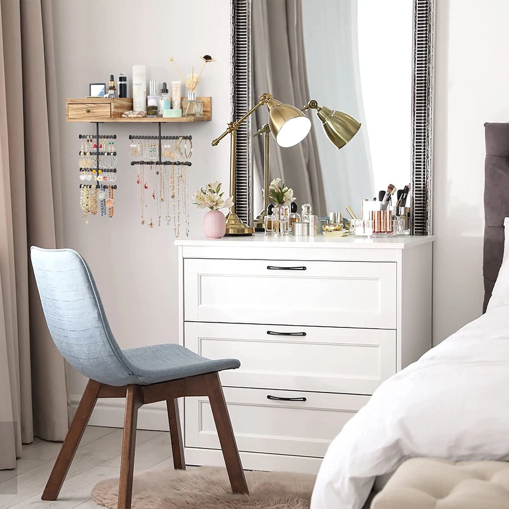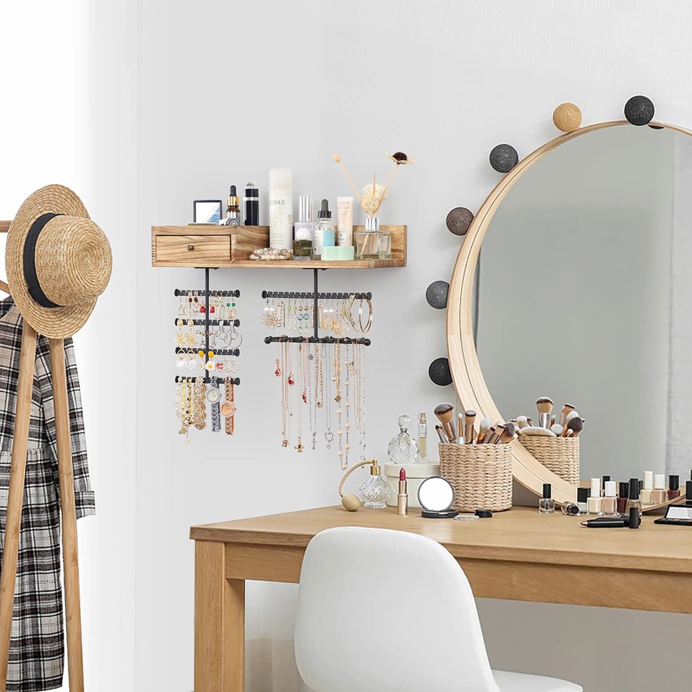 Innovative Improved Jewelry Organizer:Totally 6 rods,allowing you freely place earrings,necklaces,bracelets,watches,eye glasses etc..Large capacity earring organizer:58 slots instead of holes,directly place and fetch;Necklace organizer:branched rods instead of single rod,avoid tangling,directly get the piece you want;Ring&brooches organizer:wood drawer,lined with soft fine linen,divided compartment for rings and brooches;Ample space shelf for storing cosmetic,perfume bottles,display decor items Wall Mounted Jewelry Organizer: Jewelry wall organizer is made of rustic wood with carbonized finish, creating a rustic and stylish look that complements a variety of decors. No tangled necklaces, no missing earrings, easily pick the right accessories for the day Large Capacity Jewelry Organizer: Wooden storage drawer for your percious ring and brooches, a shelf for perfumes, watches and eye glasses, 58 earring slots & 6 bracelet rod for storing all shapes and sizes of jewelry including rings, necklaces, bracelets, sets, large hoop earrings. It's time to show off your collection, outstanding hardwood made organizer for hanging all jewelry, perfect for storing your favorite jewelry Excellent Gift For Women: Every female have their own jewelry,and jewelry organizer is a necessary and lovely gift. This exquisite jewelry organizer is absolute a ideal gift for birthday, Christmas, New Year, Valentine's Day, anniversary and the perfect gift for mom, daughter, wife, girlfriend and female friend Enjoy Easy Setup: Wall mounting screws and anchors are included for easy quick installation, all you need to do is mount it on the wall with installed mounting brackets. The drawer lined with fine linen to keep your jewelry from scratching, plenty of divided space and organizers, greatly save your space, you can fit on your bedroom, closet, or bathroom wall. Get this jewelry organizer and say goodbye to the lost earrings and tangled necklaces 100% SATISFACTION SERVICE: Storing your makeup or daily accessories and protect your rings or earrings from scratches with this Jewelry Wall Organizer. Any questions about our product, please reach out to us