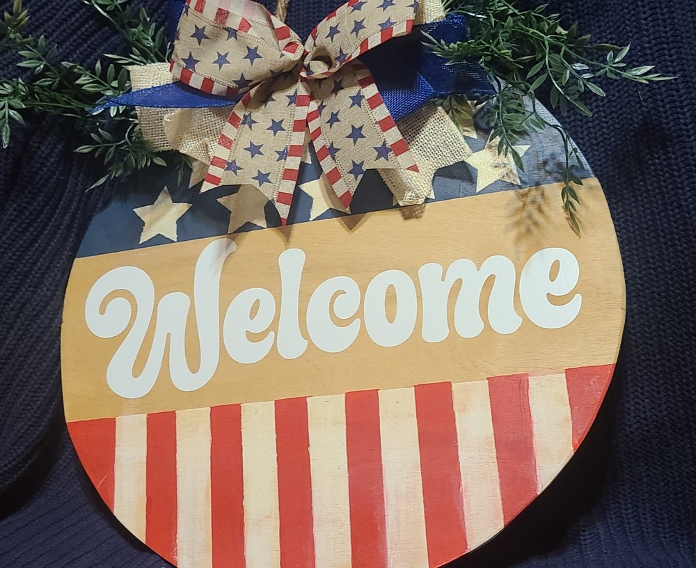 This handcrafted wood door wreath is a patriotic-themed decoration perfect for all occasions. The red artificial wreath hanger is made from wood, adding a touch of natural charm to your home decor. Display this wreath on your front door to show off your patriotic spirit and add a festive touch to your seasonal display.