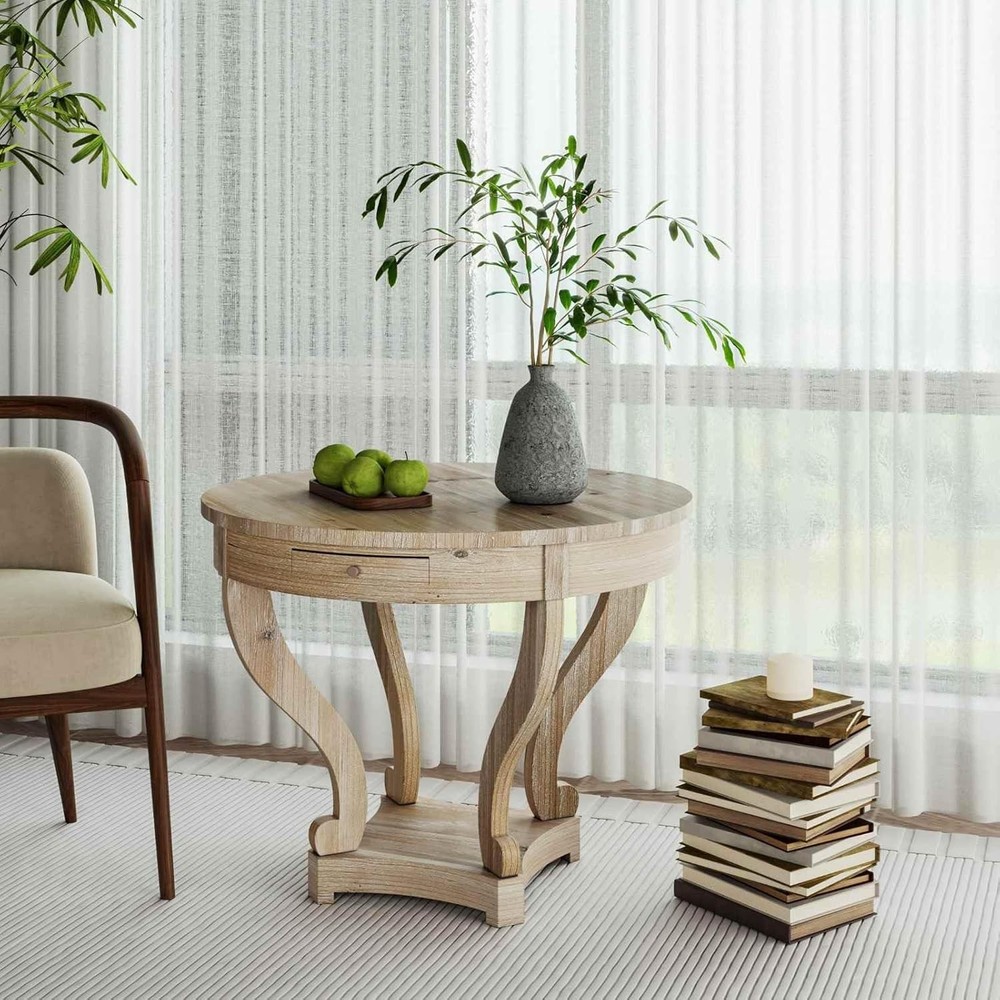 Product Description About this item Natural Wood Finish: Features a beautiful natural wood grain with a distressed finish, adding rustic charm to any room in your home Solid Construction: Made from solid wood and MDF with a fir wood veneer, ensuring durability and preventing cracks during daily use Elegant Design: Elegant scrollwork-inspired legs offer a timeless design motif that enhances the aesthetic appeal of your living room, bedroom, or office Convenient Storage: Includes two side storage drawers, perfect for keeping your living space organized and clutter-free Easy Assembly: Simple assembly required with just four curved legs to attach, making setup quick and straightforward Specifications: -Main Color: Natural Wood -Main Material: Solid Wood+MDF -Product Dimensions Assembled Length (in.):31.50 Assembled Width (in.):31.50 Assembled Height (in.):27.16 -Weight (lbs.):29.10 -Assembly Required: Yes Notice: 1. The color of the actual product may differ from the image due to the lighting or the monitor’s display. 2. Manual measurement has been used, there may be some reasonable error. Package includes: 1 x End Table