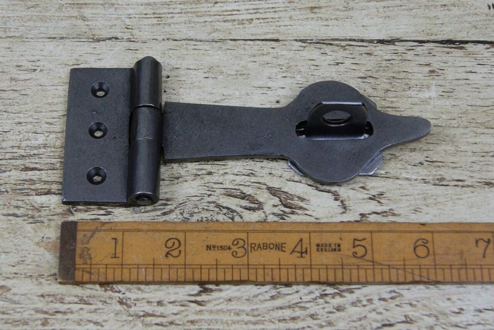 Hasp and staple c/w screws Cast iron hasp and steel hasp Popular on cabinet doors, armoires, trunks and chest. SPEAR- HASP 155MM X 65MM STAPLE 45MM X 40MM STAPLE HOLE DIAMETER 15MM