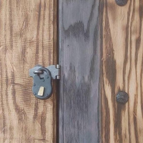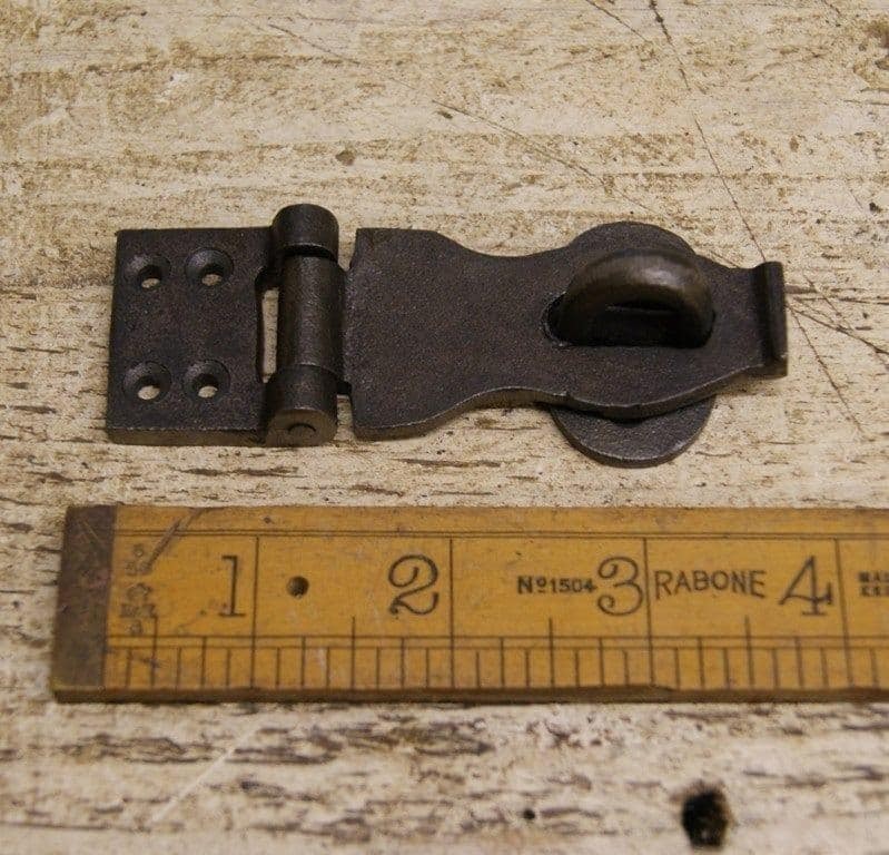 Cast iron hasp & staple comes with fixing screws This outstanding hasp crafted of iron are popular on cabinet doors, armoires, trunks and chest. It's a fabulous detail for a modern sleek look or for that old colonial charm. Affordably reclaim old cabinet doors or update a piece of furniture or bedroom armoire. OVERALL OPEN LENGTH 90MM INCLUDING HINGE HINGE: 30MM WIDTH HEIGHT 20MM EYE: 35MM X 25MM HOLE DIAMETER: 10MM