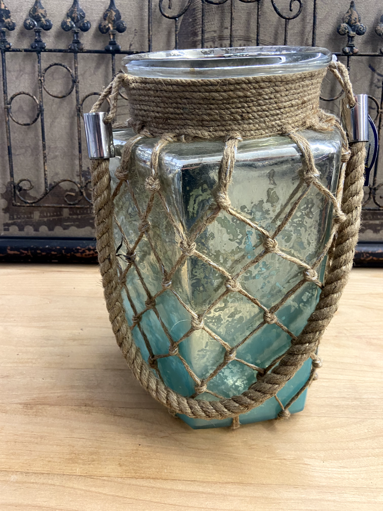 The rustic rope hanging flower vase is a round, blue glass vase designed to add a touch of charm to any space. With a rustic theme and adorned with delicate flowers, this vase is perfect for bringing a natural and rustic feel to your home decor. The vase is made of glass and features a rope for easy hanging, allowing you to display your favorite blooms in a unique and eye-catching way.