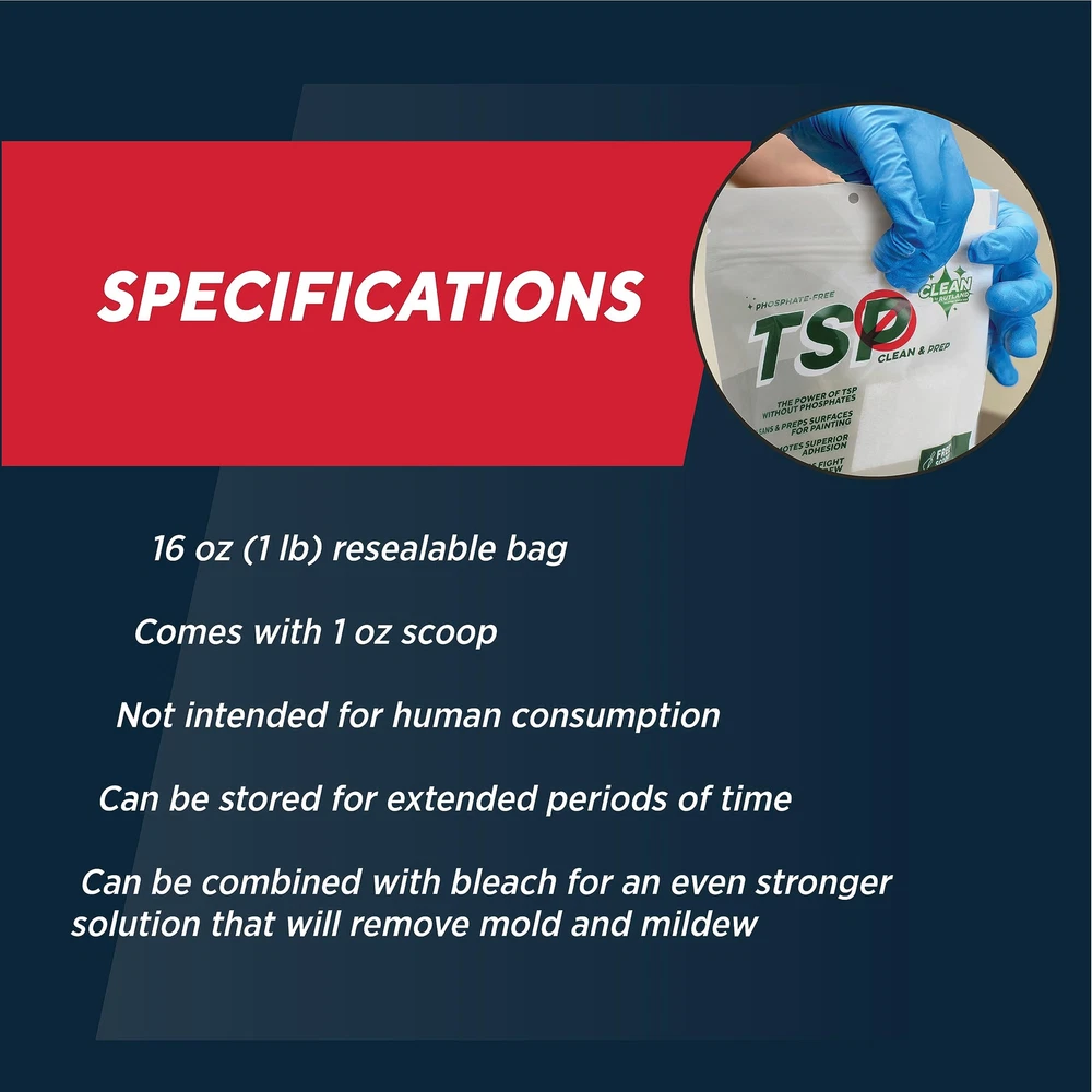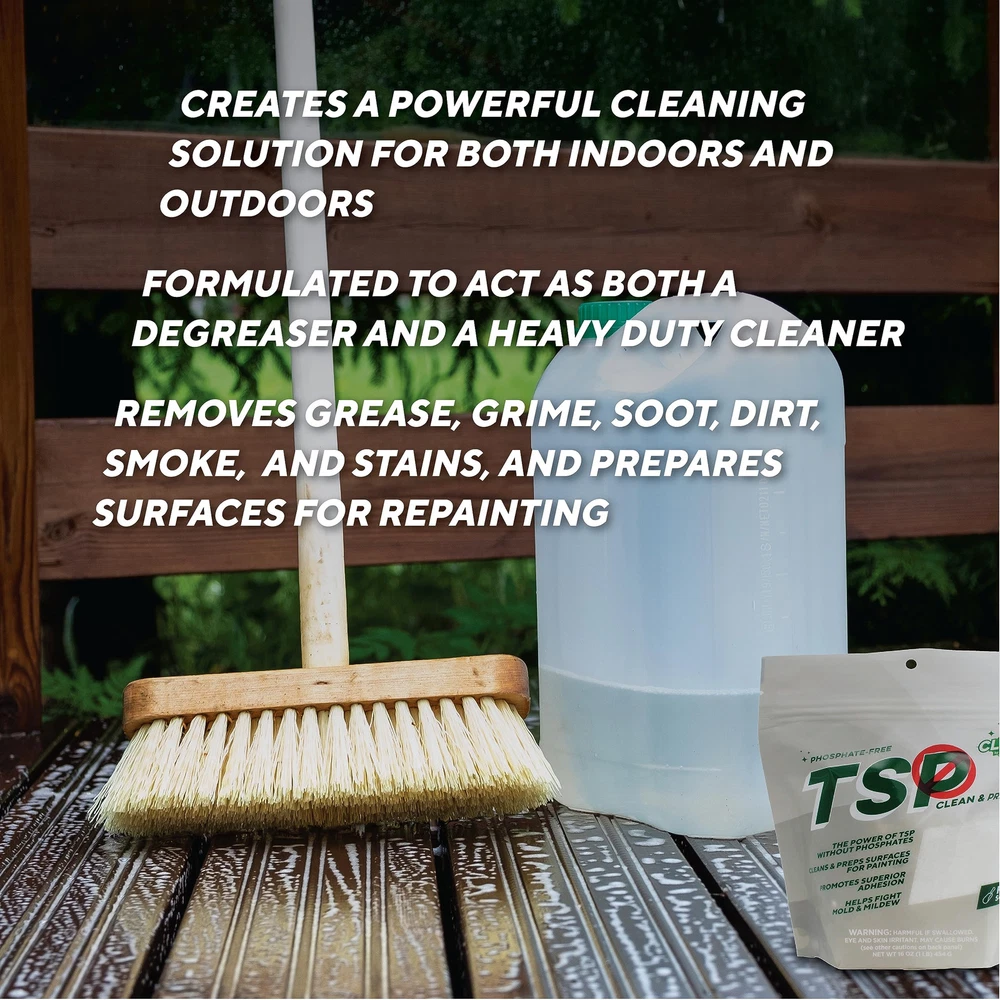 RUTLAND TSP-PF is a technical-TSP substitute intended to be combined with water to create a powerful cleaning solution for both indoors and outdoors. Formulated to act as both a degreaser and a heavy duty-cleaner, it will remove grease, grime, soot, dirt, smoke, and stains. Works great on woodwork, walls, decking, siding, concrete, and masonry. Safe, heavy-duty indoor, outdoor cleaner & degreaser A heavy-duty cleaning substitute for TSP for use where state and local regulations prohibit the sale of TSP. Great for woodwork, walls, decking, siding, and concrete & masonry Excels at removing heavy deposits of grease & grime, smoke, soot stains and chalked paint For heavy duty indoor cleaning, dissolve 2 scoops in 1 gallon of hot water