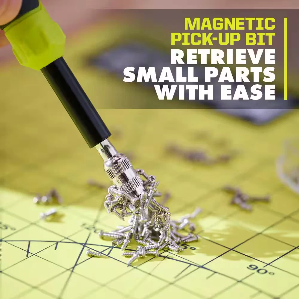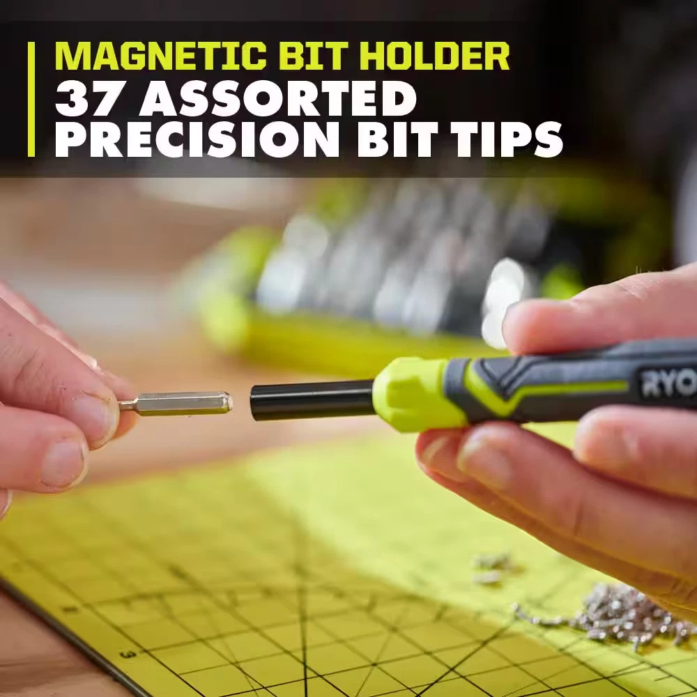 Ryobi 38 Piece Precision Screwdriver Set, Includes Magnetic Pick-up Bit, Case The RYOBI 38 PC. Precision Screwdriver Set is designed for a wide variety of precise applications from electronics repair to adjusting eye glasses. The rotating cap and comfort grip handle provide increased control, while the anti-roll design keeps the screwdriver where you left it. The included magnetic pick-up bit helps retrieve small parts with ease and the storage case with built in sorting tray lid helps keep you organized while working. The 38 PC. Precision Screwdriver Set includes: (1) Screwdriver Handle, (5) Phillips Bits (000, 00, 0, 1, 2), (4) Slotted Bits (1.0, 2.0, 3.0, 4.0), (9) Star Bits (T3, T4, T5, T6, T7 ,T8, T9, T10. T15 (T5-T15 Security Bits)), (8) Hex Bits (0.7, 0.9, 1.3, 1.5, 2.0, 2.5, 3.0, 4.0mm), (2) Nut Drivers (2.5mm, 5.0mm), (2) Pentalobe Bits (#2, #5), (4) Tri-Point Bit (Y000, Y00, Y0, Y1), 1) AWL/Scribe Bit, (1) Standoff Bit, and (1) Case. 37 assorted precision bit tips for a wide range of applications Rotating cap for increased control Comfort grip handle Anti-roll design keeps the screwdriver where you left it Included magnetic pick-up bit helps retrieve small parts with ease Stay organized with included storage case and built in sorting tray for bits and screws while in-use Includes: A96302 (1) Screwdriver Handle, (5) Phillips Bits (000, 00, 0, 1, 2), (4) Slotted Bits (1.0, 2.0, 3.0, 4.0), (9) Star Bits (T3, T4, T5, T6, T7 ,T8, T9, T10. T15 (T5-T15 Security Bits)), (8) Hex Bits (0.7, 0.9, 1.3, 1.5, 2.0, 2.5, 3.0, 4.0mm), (2) Nut Drivers (2.5mm, 5.0mm), (2) Pentalobe Bits (#2, #5), (4) Tri-Point Bit (Y000, Y00, Y0, Y1), 1) AWL/Scribe Bit, (1) Standoff Bit, and (1) Case