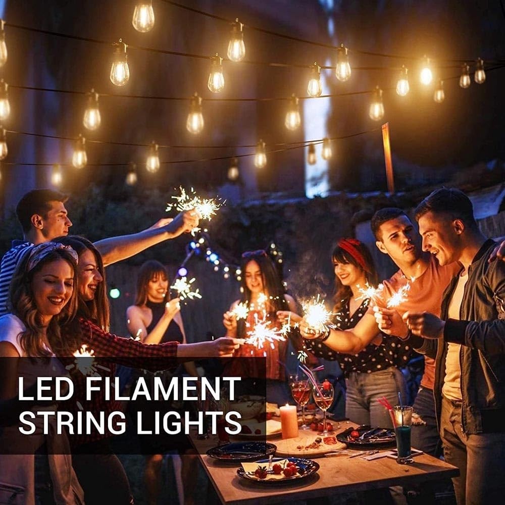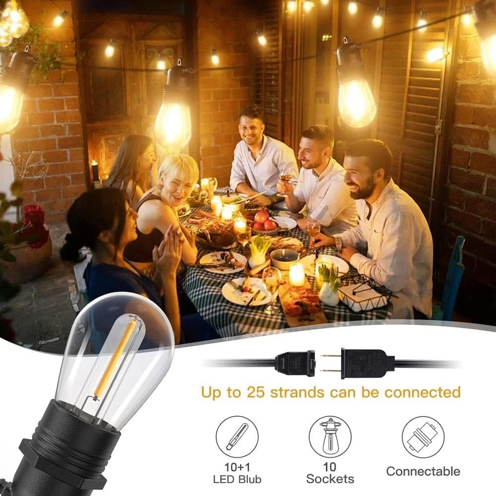 The outdoor string lights using the most advanced LED chip enables each bulb to illuminate every dark corner softly and evenly, bring warm and bright enough“ITALIAN STYLE" bistro ambiance and add flair to porch, patio, cafe, backyard etc. Each bulb has a hanging hook above it, making it easier to install these lights around your space. Energy Saving - The 2700K warm white LED light bulb gives off a perfect soft warm glow, creating a relaxing and romantic atmosphere. 30,000 hours long lifespan could reduce maintenance costs and help you to save up to 90% on your electric bill. End To End Connection - Outdoor hanging patio lights has end-to-end connections, which means you can connect multiple sets to achieve the perfect length for any installation.If one bulb goes out, you just need to replace it, others still light up. Waterproof & Shatterproof - The outdoor lighting chain is made of safe plastic and durable rubber, which is fall-proof and durable. It has a special weatherproof plug that can completely wrap the filament. Waterproof to IP65, can be used in extreme environments such as wind, rain and snow, is an ideal choice for indoor and outdoor use. Easy Installation & Wide Application - There is a hook on the top of the socket, which is very easy to hang with a cable tie or ropes, saving you time. You can easily use zip ties to hang it perfectly in any space. Great for your outdoor garden, pool area, gazebo, porch, deck, pergola, wedding, Bar, balcony, or any outdoor party and event.