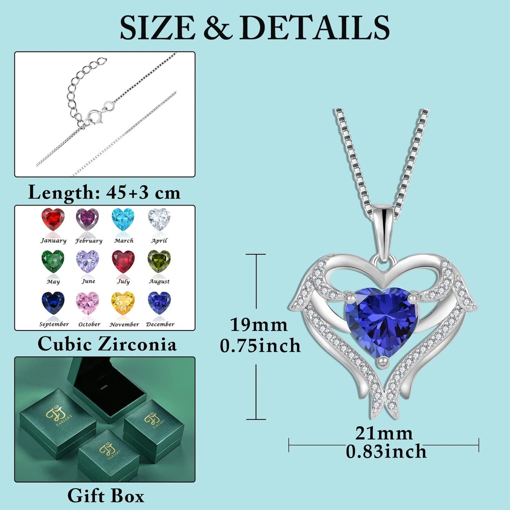 ❤ Unique Design ❤ Angel wing jewelry has gained popularity for it's beautiful symbolic meaning of love, spirituality and protection. Inspired by angel wings and birthstones, meaningful design concepts. Each month's birthstones have good meanings as well as attributes. It's a thoughtful present for mom, wife, daughter, sister, girlfriend, best friend or yourself. ❤ High Quality ❤ Material: 925 sterling silver with AAA cubic zirconia, which is hypoallergenic and will not get dark or change color. ❤ Suitable Size ❤ Chain Length: 45+3 cm. Pendant Size: 19 * 21 mm / 0.75 * 0.83 inch. Birthstone Size: 8 * 8 mm / 0.31 * 0.31 inch. ❤ Perfect Gift ❤ Delivery with a delicate gift box, a Perfect Gift for Valentine's Day, Anniversaries, Birthday, Mother's Day, Graduation Season or Christmas! ❤ Without Worry ❤ If you have any question or problem about the item, please contact us. We will reply you within 24 hours.