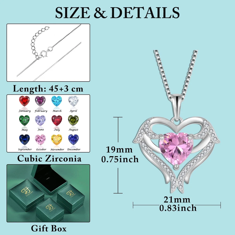❤ Unique Design ❤ Angel wing jewelry has gained popularity for it's beautiful symbolic meaning of love, spirituality and protection. Inspired by angel wings and birthstones, meaningful design concepts. Each month's birthstones have good meanings as well as attributes. It's a thoughtful present for mom, wife, daughter, sister, girlfriend, best friend or yourself. ❤ High Quality ❤ Material: 925 sterling silver with AAA cubic zirconia, which is hypoallergenic and will not get dark or change color. ❤ Suitable Size ❤ Chain Length: 45+3 cm. Pendant Size: 19 * 21 mm / 0.75 * 0.83 inch. Birthstone Size: 8 * 8 mm / 0.31 * 0.31 inch. ❤ Perfect Gift ❤ Delivery with a delicate gift box, a Perfect Gift for Valentine's Day, Anniversaries, Birthday, Mother's Day, Graduation Season or Christmas! ❤ Without Worry ❤ If you have any question or problem about the item, please contact us. We will reply you within 24 hours.