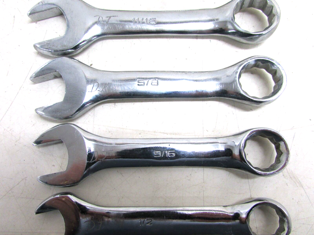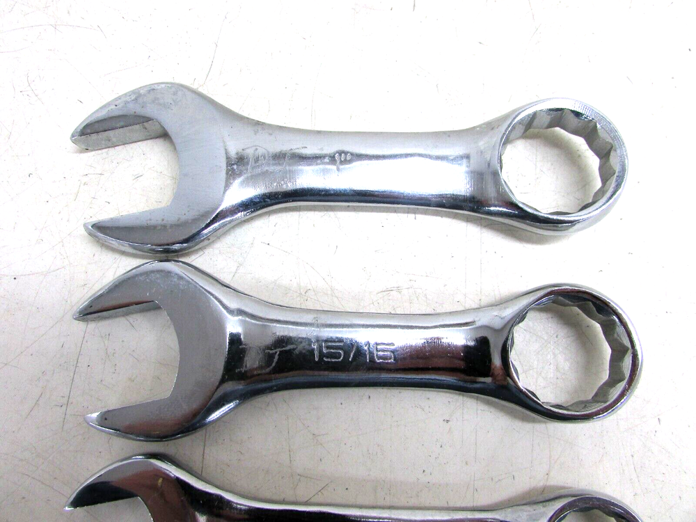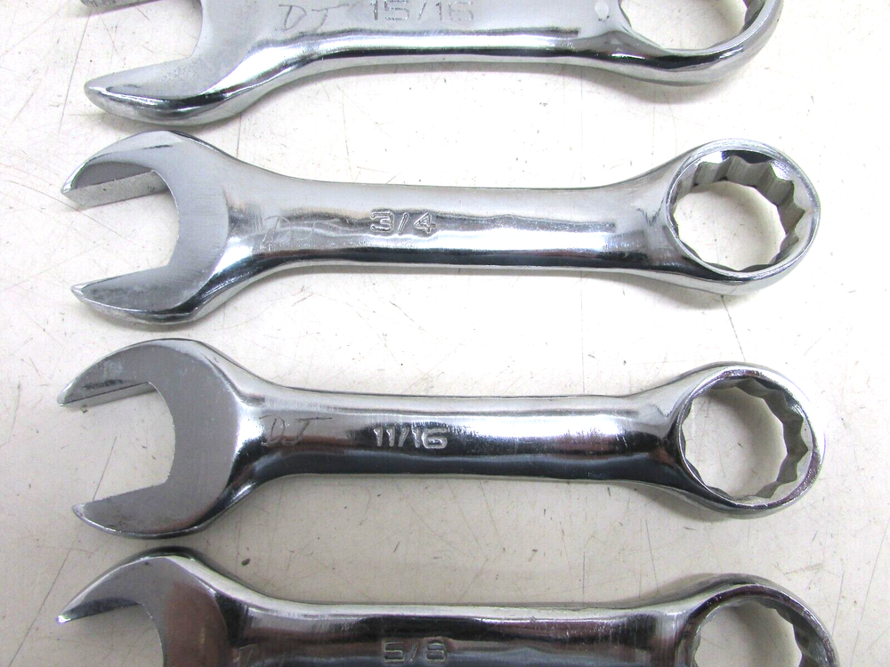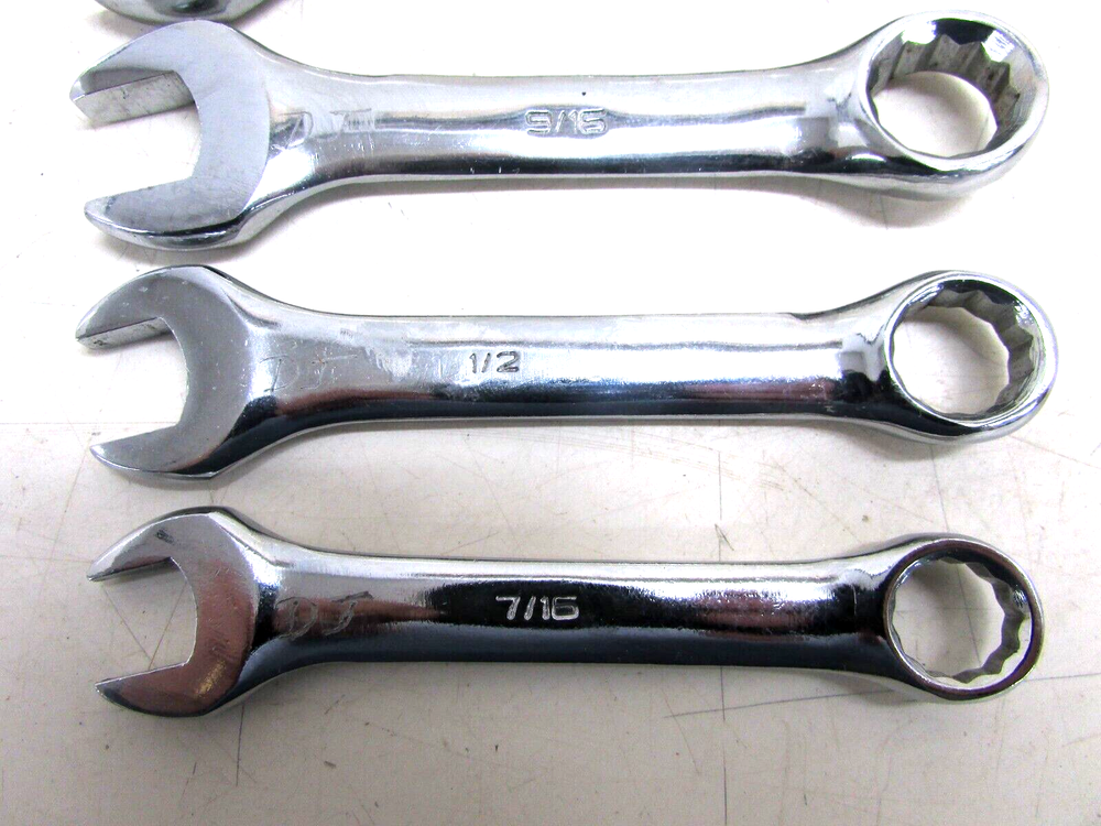 THIS IS A PREVIOUSLY USED ITEM UNBRANDED SAE STUBBY COMBINATION WRENCH SET CHROME 12-POINT 7/16”, 1/2”, 9/16”, 5/8”, 11/16”, 3/4”, 15/16", 1" **COMES JUST AS PICTURED** HAS PREVIOUS OWNER’S ENGRAVINGS GOOD USED CONDITION! 38-BB