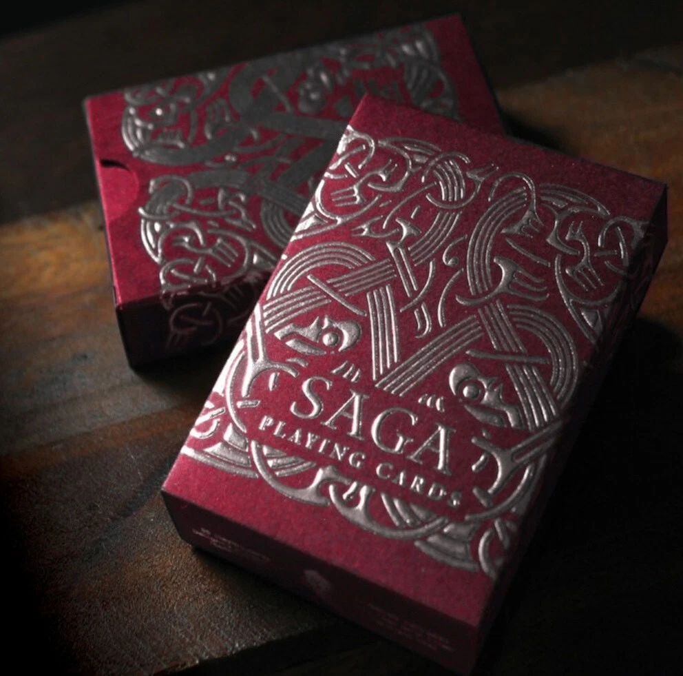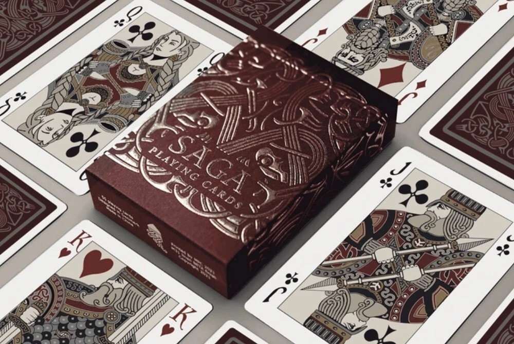 ★ Neo-norse art style by danish designers ★ Embossed tuck boxes with metal foil ★ Exclusive to Kickstarter backers & Isolated Thunderstorm ★ Special matte-raw tuck stocks ★ A new series of decks with great handling ★ 52+3 poker sized playing cards ★ Printed with M31 Linen BETA finish