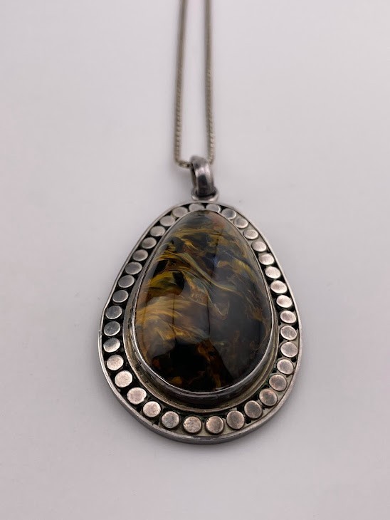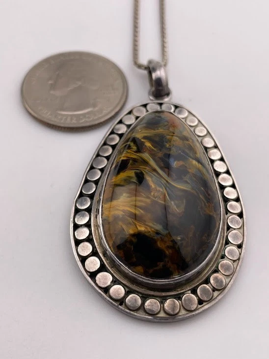 SAJEN 925 STERLING SILVER PIETERSITE TEARDROP NECKLACE 24" AMAZING COLOR 385 ****************************** Thank you for your interest in our jewelry. We'd like to introduce ourselves. We are just a retired couple who love matching our customers with great jewelry. We're not professional jewelers. To have the best shopping experience we like to recommend the following: Please measure your hand, wrist, finger or neck to ensure the best fit. We can use your measurements to help with sizing. Please ask all the questions you want. We know some stuff and, if we don't, we'll do the research. We like to learn too. More Stuff: If an item is described as "gold over 925 sterling silver" this means it is gold vermeil. Vermeil is the process by which a layer of gold (usually 14k or 18k) is bonded to sterling silver. We only clean with gentle soap and warm water to avoid damage. The items we sell may be new or pre-owned and may have normal wear, slight damage, and/or tarnish. We make every effort to ensure the items we sell are as described. This includes testing to confirm metal purity if the item isn't marked, and testing for gemstone identity. We try to put measurements in the jewelry description and include a photo of each piece with a U.S. quarter (25mm).