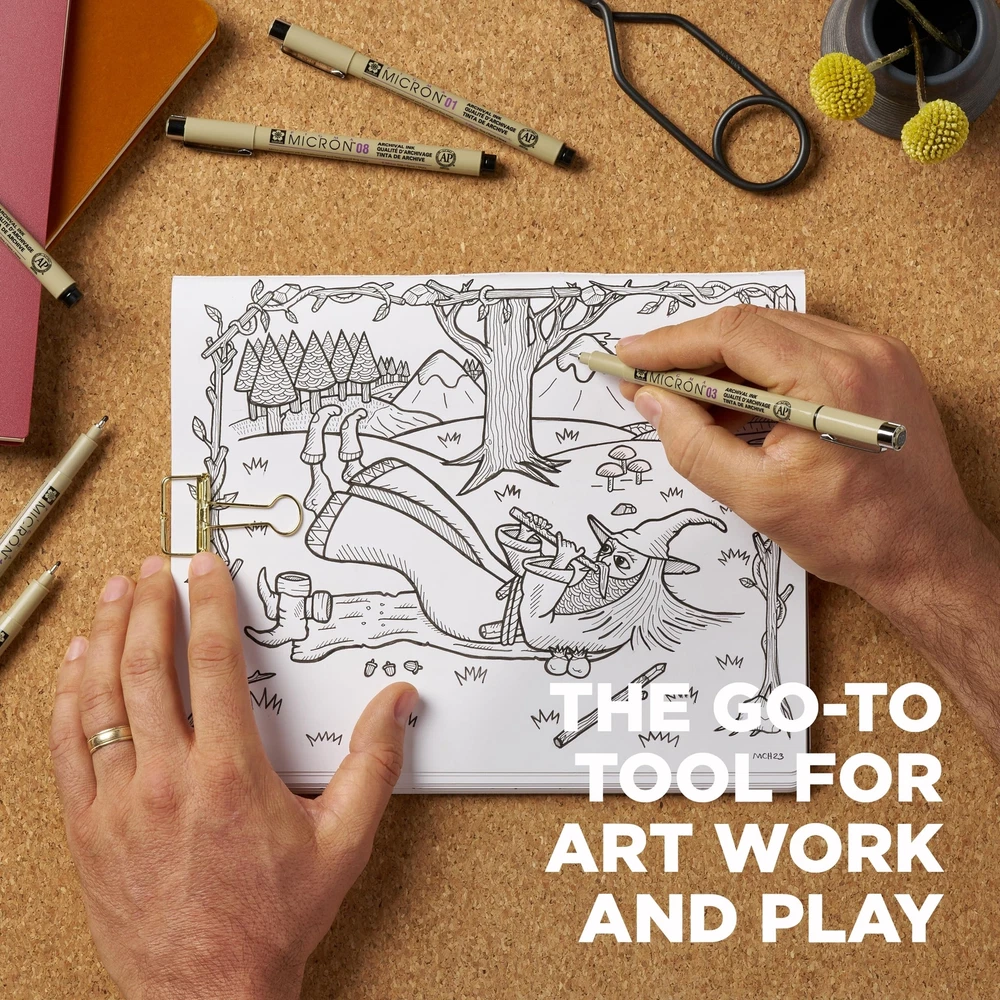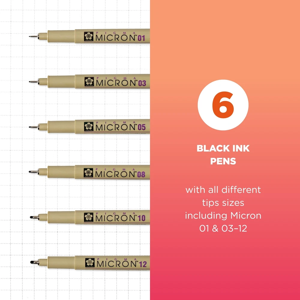When accuracy, performance and preservation count, the unparalleled fine nibs and archival ink quality of the Sakura Pigma Micron fineliner pens are the go-to tool for art, work, and play. Experience smooth writing and crisp ink quality that delivers precise points and lines. Features archival Pigma ink that doesn’t bleed through most papers, is quick drying, waterproof and fade resistant. Pigma ink, invented by Sakura over 30 years ago, continues to be the most reliable permanent ink on the market today. Artists, consumers, the government, and scientists consider Pigma Micron a necessary basic tool for any archival-quality, handwritten project. This permanent, pigment-based ink will not bleed or run if liquids are spilled on or applied to the document after the ink has dried. Perfect for legal situations, Pigma ink is nearly impossible to alter on documents, in log books, or on checks. Architects, archivists, anthropologists, entomologists and laboratories depend on Pigma Micron for record keeping. Manga artists, professional illustrators and watercolorists use the range of point sizes to create precision lines. Scrapbookers and crafters value its archival quality for preserving memories in journals, and notebooks. Use Pigma Micron to leave a mark that will last a lifetime. Certified non-toxic, approved by ACMI toxicologists & bears trusted AP Seal. Not evaluated for cosmetic use on skin. Not recommended for use on fabrics intended to be washed. Set includes 1 each of 6 points sizes in black ink: Micron 01 - 0.25 mm, Micron 03 - 0.35mm, Micron 05 - 0.45mm, Micron 08 – 0.5mm, Micron 10 – 0.6mm and Micron 12 - 0.70mm fineline pens. Precise Ink: Black ink creates precise marks that stand the test of time. Assorted Sizes: Contains 1 of each Micron pen: 01, 02, 05, 08, 10, and 12. Fade Resistant Ink: Sakura Micron Pen ink is waterproof, fade resistant, bleed free, quick drying, and pH neutral. Color Consistent: Pigma Micron pens use color from single pigments for color consistency, every time. Professional Quality: Japanese quality Sakura pens deliver professional results.