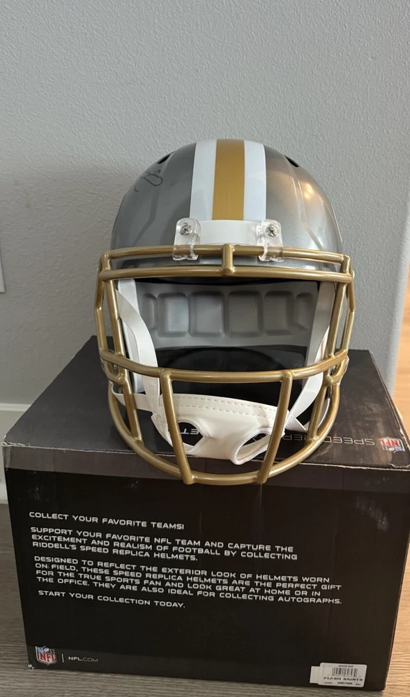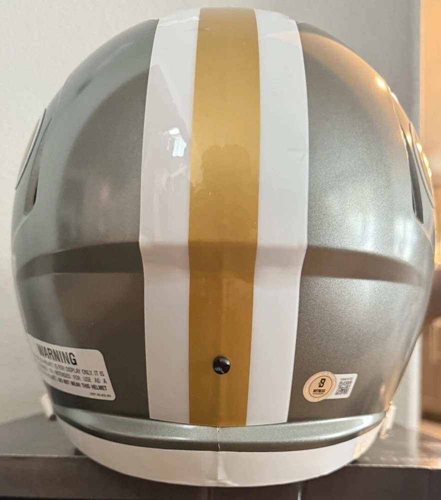 This is a New Orleans Saints Flash Gray Full Size Speed Replica Helmet that has been hand signed by Alvin Kamara. This item has been witnessed and certified authentic by Beckett Authentication (BAS) and comes with their tamper-proof witness sticker.