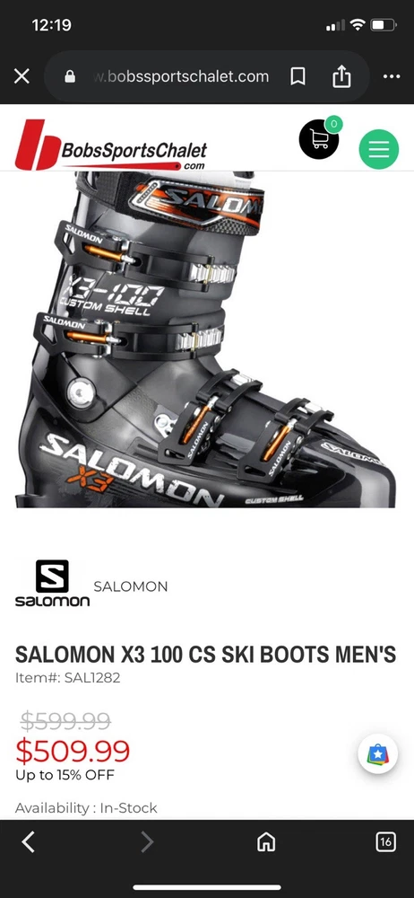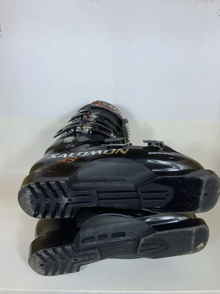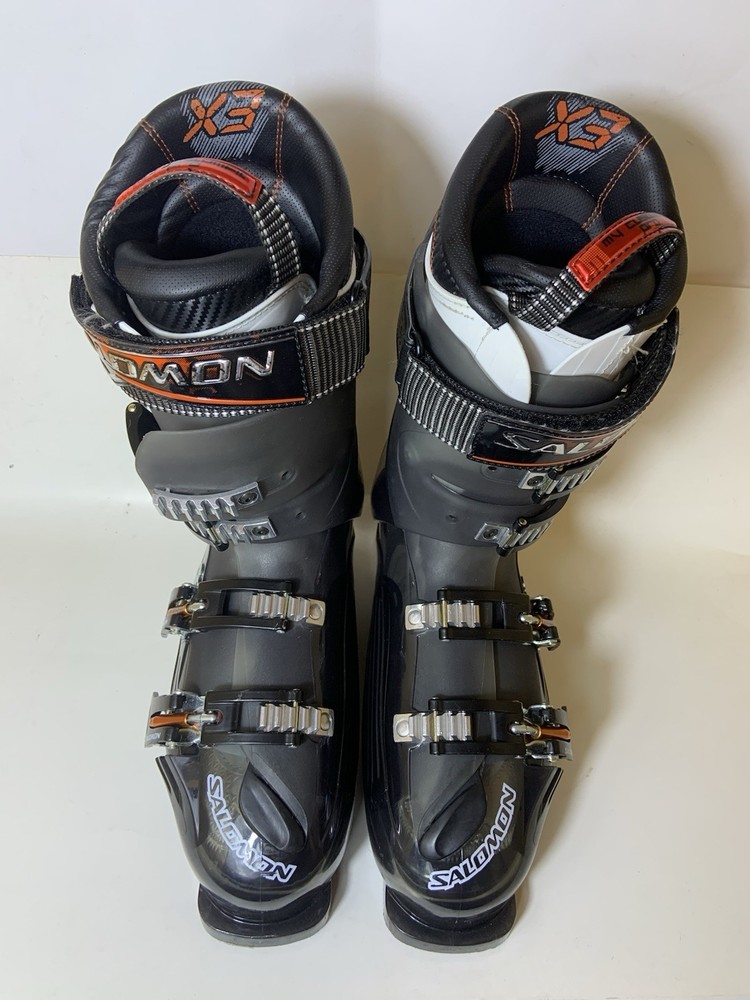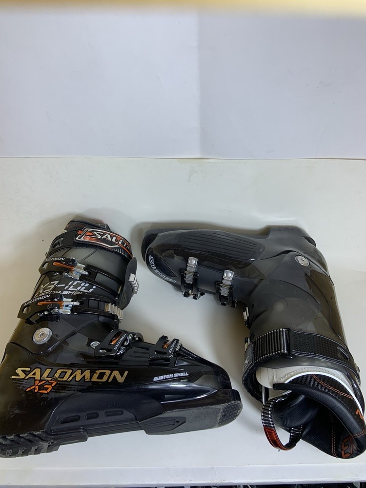 The SALOMON X3 100 CS SKI BOOTS in men's size 27.5 are designed for alpine/downhill skiing with a stiff flex for more control on the slopes. These ski boots feature a 2-piece shell design with a power strap closure for a secure fit. The black boots are compatible with alpine bindings and are suitable for all mountain riding style. Made by Salomon in 2012, these ski boots are a reliable option for serious skiers looking for a high-performance gear for their adventures on the slopes.