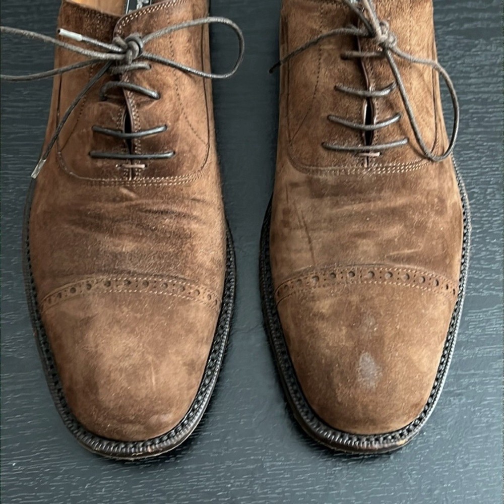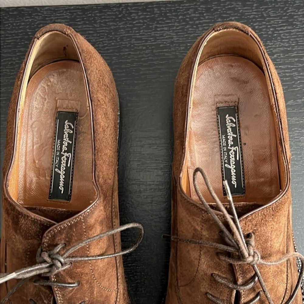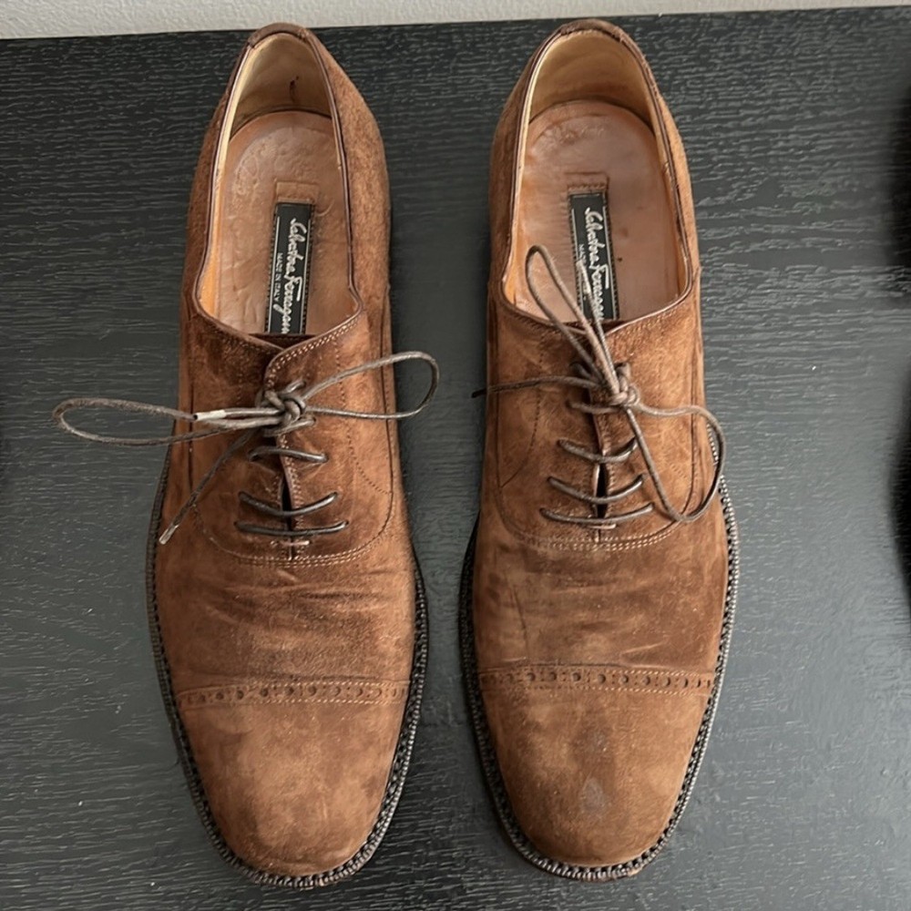 SALVATORE FERRAGAMO BROWN SUEDE OXFORD SHOES SIZE 9.5 D Made in Italy Suede Oxford in brown suede Lace-up closure • Shoes are pre owned in good condition! Shoes show normal signs of use/wear. Shoes need to be cleaned before wear. Please see carefully all pictures and the video provided. Thank you! •No Returns No Holds No Trades