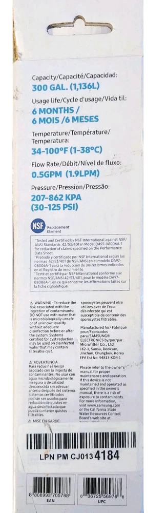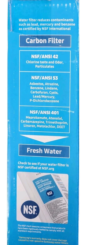 Looking for a reliable water filter that's compatible with your Samsung refrigerator? Look no further than this genuine Samsung water filter, designed specifically for carbon block filtration. It's the perfect choice for anyone looking to remove chlorine taste and odor from their water, and it's ideal for use in a household setting. This filter is made from high-quality ABS material and has a filtration method of carbon block. It's suitable for Samsung refrigerators and has a unit quantity of 1. The filter is white in color and has a height of 8.8 inches, a width of 2 inches, and a depth of 2 inches, with a weight of 14.3 oz. It's an open-box item, but rest assured it's brand new and in perfect working order.