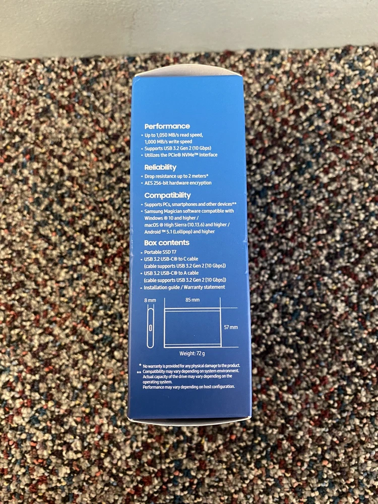 This Samsung T7 Portable 1TB SSD in blue color is an excellent choice for storing your important data. It is compatible with both laptops and PCs and supports SSD (Solid State Drive) storage format. With a storage capacity of 1TB, this external SSD is perfect for storing your documents, photos, and videos. The Samsung T7 Portable SSD has a sleek design with dimensions of 85mm in length, 57mm in height, and 8mm in width. It is a reliable and high-speed storage solution that can help you work efficiently and store your data safely. This model is perfect for professionals who need to store their data on the go.