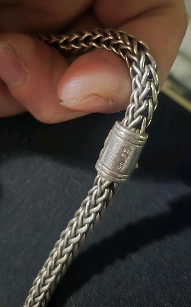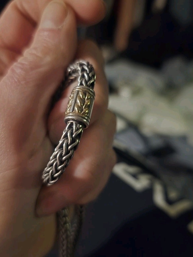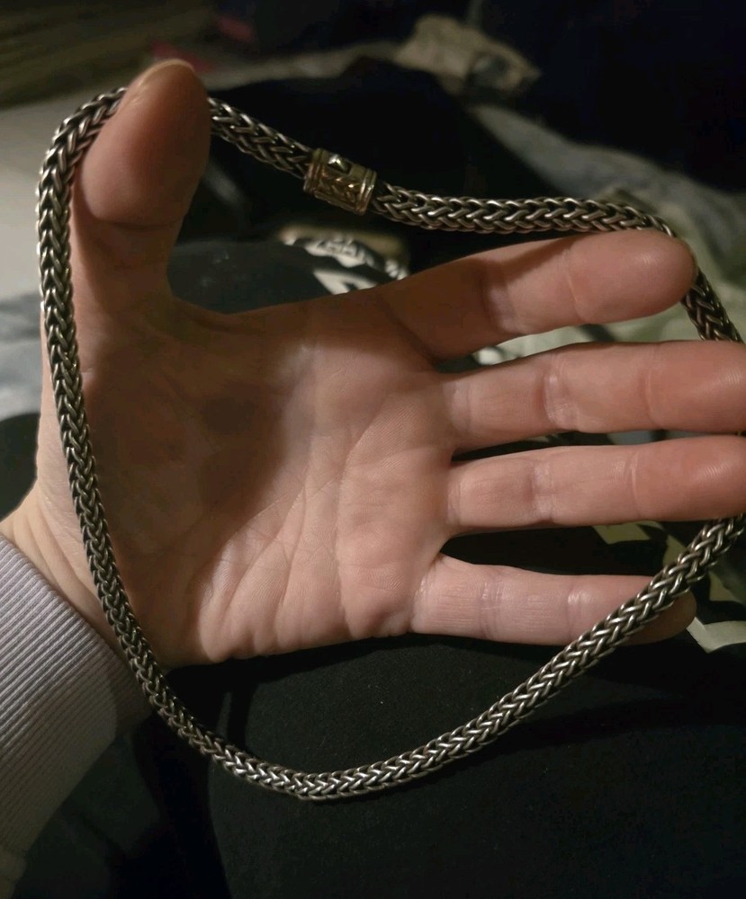 Up for sale is a beautiful, authentic Samuel b behnam Chain woven necklace. This is a signature piece from the artisan collection, known for its hand-woven texture and timeless design. Material: Solid .925 Sterling Silver with 18K Yellow Gold (750) accents on the clasp. Design: Classic Chain "S" Gauge (approx. 5mm width). Length: [Insert exact length here, e.g., 18"] inches. Hallmarks: Stamped with "925" (Silver), "750" (18K Gold), and the John Hardy "S" size indicator on the clasp. Condition: Excellent pre-owned condition. The weave is tight and the clasp is secure with a satisfying click. This necklace features the iconic blackened oxidation in the recessed areas, which makes the woven pattern really stand out against the polished silver and gold. It’s a substantial, weighty piece that works perfectly for daily wear or as a statement item.