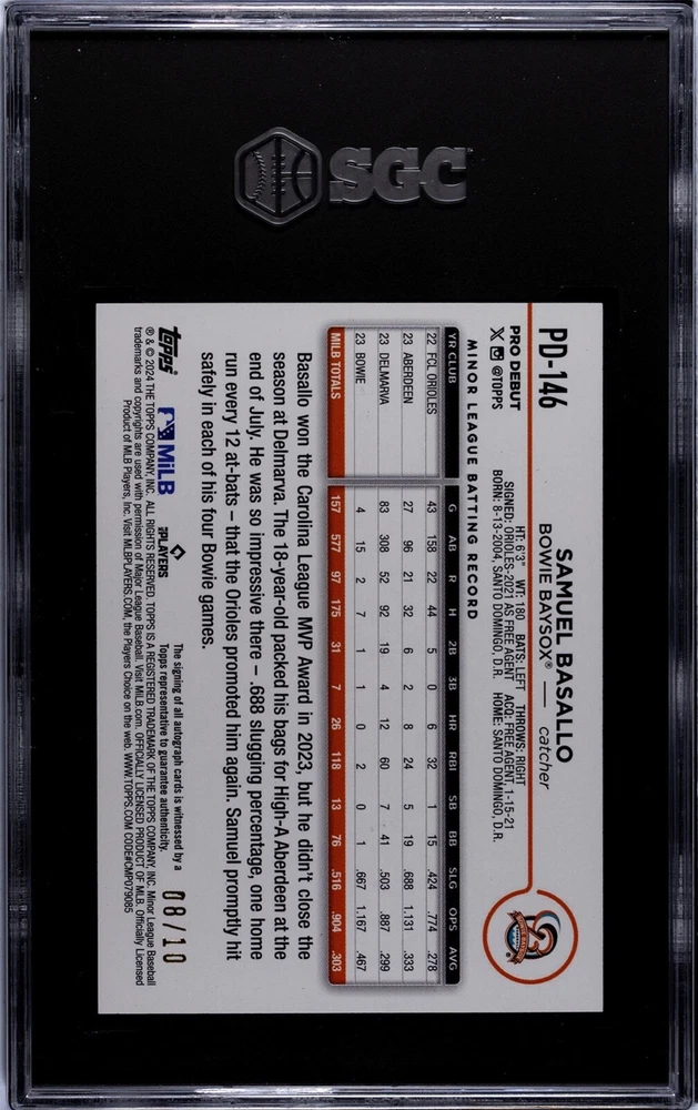 This is a rare and highly sought-after 2024 Topps Pro Debut baseball trading card featuring Samuel Basallo, signed by the player himself. The card is a Red Foil Refractor parallel with a print run of only 10, making it a true collector's item. It is authenticated by Topps and comes with a label or sticker autograph format. The card is in standard size and made of chrome material, with a grade of 10 and a serial number of PD146. It features Samuel Basallo, a rookie player for the Bowie Baysox and Baltimore Orioles. The card is perfect for fans and collectors of Major League Baseball (MLB) and comes with a set of features that make it an excellent addition to any collection.