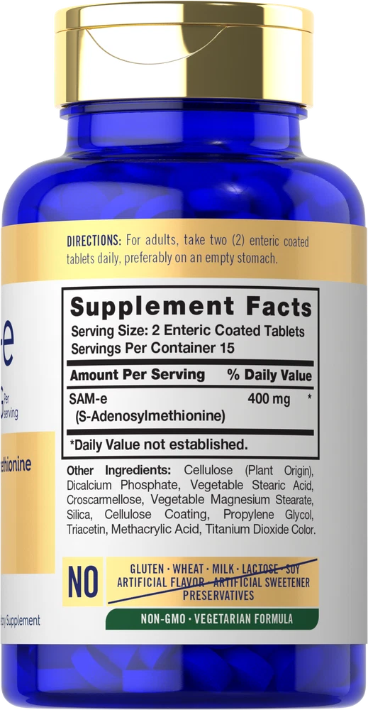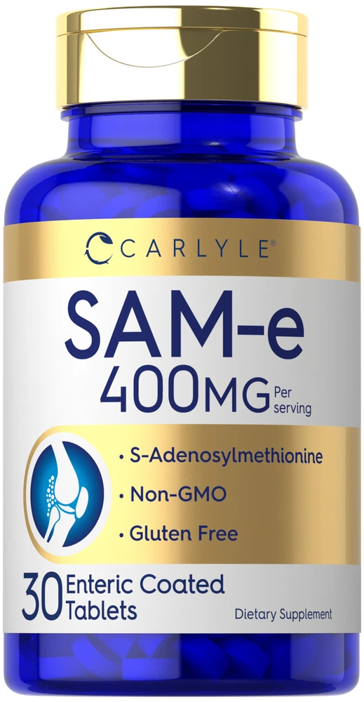 Supplementing with SAM-e: S-Adenosylmethionine, or SAM-e, is a compound formed by the amino acid methionine and found naturally within the body. SAM-e can be found in supplement forms such as pills, capsules, chewable tablets, liquids, gummies, bulk powders, and more. Carlyle’s SAM-e: Carlyle SAM-e features 400 mg of S-Adenosylmethionine per serving in easy-to-swallow enteric coated encapsulations. Our supplement is vegetarian, gluten-free, and non-GMO making it a wonderful addition to your daily routine. Rooted in Wellness: Our expertise in sourcing the purest extra strength ingredients combined with advanced technologies makes us proud to deliver premium, honest supplements at the best value. Our SAM-e formula is a testament to our commitment to excellence, made with powerful ingredients rooted in wellness. Thanks for choosing us in your pursuit of living healthy! WARNING: If you are pregnant, nursing, taking any medications, including antidepressants, or have any medical condition, consult your doctor before use. May cause gastrointestinal discomfort. If any adverse reactions occur, immediately stop using this product and consult your doctor. If seal under cap is damaged or missing, do not use. Keep out of reach of children. Store in a cool, dry place.