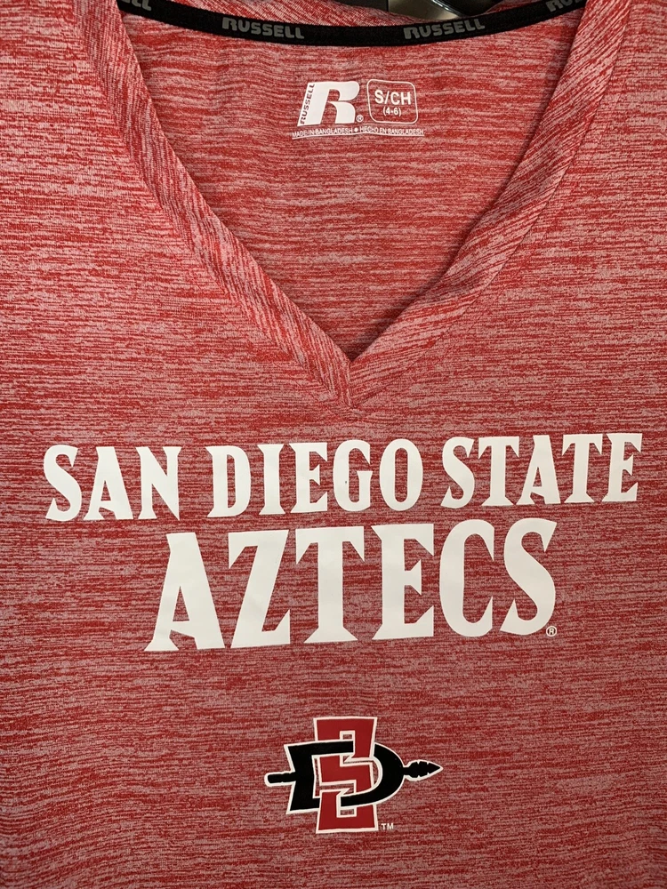 Event/Tournament: NCAA Sport: Football Brand: Russell Athletic gtin13: Does not apply Team: San Diego State Aztecs Officially Licensed: Yes UPC: Does not apply Product: Shirt Size: S Pre & Post Season: Regular Season Color: Red Country/Region of Manufacture: Bangladesh Gender: Women