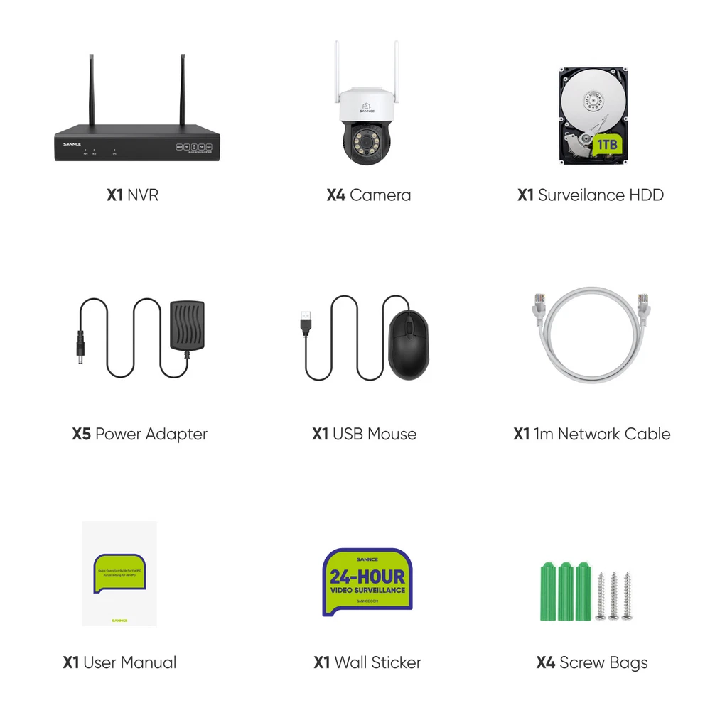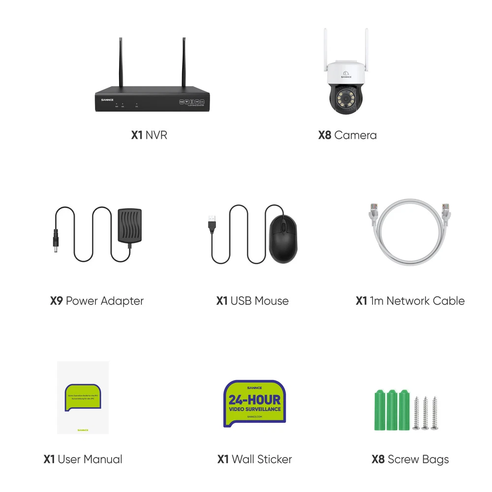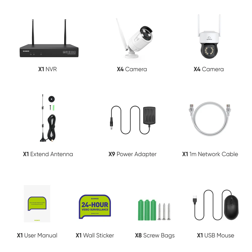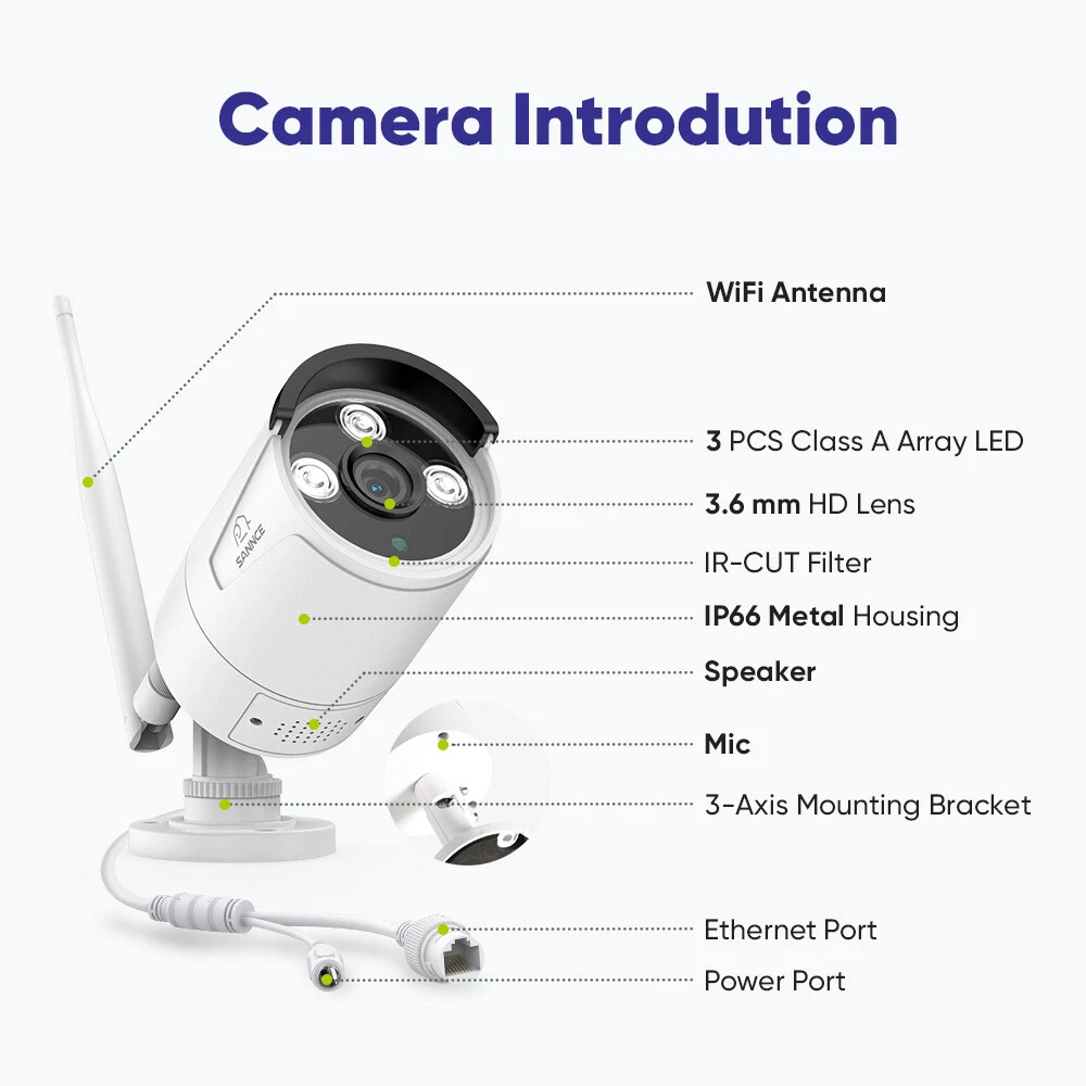 ANNKE Home Surveillance 1080P TVI Camera System 5MP TVI Camera System 4K TVI Camera System 5MP POE Camera System 4K POE Camera System 12MP POE Security Camera Kits Wireless IP Camera System SANNCE Home Surveillance 1080P TVI Camera System 1080P ColorVu Camera System 5MP TVI Security Camera System 3MP POE Camera System 5MP POE Camera System 8MP POE Camera System Wireless Camera System CCTV Camera DVR/NVR CCTV Accessories POE IP Security Cameras ebay2023 SANNCE 5MP 10CH Wireless NVR 3MP Pan/Tilt & Bullet Cameras Easy Use, Omnipotent Guarding Full HD 3MP & 16X Images E-zoom The outdoor security camera delivers 3MP(2304H×1296V) resolution, which not only brings wider vision than 1080p but 1.5 times crisp image quality. You can enjoy 16X images e-function by using two fingers to touch, then you'll get more details of pictures. Real-time Two Way Audio This camera can deliver images and transfer voice via the inserted mic and speaker. You can communicate with your family and friends freely or warn suspicious strangers. Black&White Flexible Switching to Color Night With the built-in high-efficiency dual-wick lights, 3 modes to choose from. IR night vision and color night vision modes are switchable. Also, a smart mode to set that automatically turns on the color night vision once a person is detected, avoid light pollution to some degree (66ft IR night vision and 33ft full color vision) 2K Super HD & 100 ft Night Vision 1/2.8'' CMOS sensor, digital WDR, BLC & HLC ensure ultra-clear 2K 3MP Super HD clarity regardless of day or night. 3 powerful infrared LEDs deliver up to 100 ft/30 m night vision range. You may identify objects in any lighting condition. Smart Human Detection & Auto Tracking The camera can detect and extract human shapes with the advanced AI algorithm, achieve exact human motion alerts and up to 90% accuracy. You will receive prompt APP push notifications and email alarms with screenshots when someone triggers alerts. ( Pls Note: Only the PT Camera has auto tracking function ) Scare Up Unwelcomed with Sound Alarm You can activate the siren via APP to scare the suspicious away from your premises once you notice the detected notification and find strangers, ensuring your security. Auto Cascading & WiFi Repeater The IP camera and NVR will pair automatically without any manual setting after plugging in the socket. The nearest camera can serve as a WiFi repeater to bolster the connection signals and the spacious wireless distance up to 3281ft. Marvelous Pan&Tilt: More Zones Coverage The camera can rotate horizontal 350°, vertical rotation 90°, which provides expanded vision. Work with Alexa This security camera system is able to work with Amazon Alexa, allowing voice control to access the system. You can receive live feed via 100% hands-free control even if no smartphones or laptops. Remote Access&Motion Detection Alerts Enjoy unlimited remote access will free SANNCE App via your smartphones ,tablets or laptops.When there are motion events,you will receive real-time app push notifications and email alerts Customized Motion Area/Time & Preset Respond Quickly You can customize important areas or times for accurate alerts like backdoor, garage, lanes, etc. And you will receive notifications if there are detected motion events. When you check the premises, the pan and tilt are very convenient for you. Therefore, you can preset up to 6 important points so that the camera can give quick responses just in seconds, this is more user-friendly to you. Multiple Storage: the choice is up to you The camera not only supports cloud storage but the NVR local HDD storage(up to 6TB). Also, the built-in SD card slot can maximize 128G. Thus, you can store videos on HDD/Cloud/SD cards and you will never miss any second when you are not here. IP66 & Extreme Temperature Resistant Boasting an IP66 rating, the rugged camera is resilient to temperature conditions(-4 °F – 122 °F /-20 °C – 50 °C), whether it's rain, hail or shine, your faithful guard still stands here. NVR Video & Audio Video Compression H.264+ IP Video Input 10CH Wireless Video Output HDMI and VGA Up to 1080P Audio Output Support Max Recording Resolution Up to 5MP (2560 X 1920) Max Playback Resolution Up to 5MP (2560 X 1920) Max Playback Channel 4CH Max Playback Capacity 4CH 3MP/2CH 5MP Hard Drive HDD 1 SATA interface HDD Capacity Up to 6TB capacity(3.5 inches) External Interface Network Interface RJ45x1(10/100M) Wireless Antenna 3 Ports(IEEE802.11b/g/n) USB USB2.0x1 General Housing Metal for mainpart Operating Power DC12V Power Consumption 6 W (Without HDD) Working Temperature 14 °F ~ 131 °F/-10 °C ~ 55 °C Dimensions (W X H X D) 260 X 245 X 47 mm Weight (Without Hard Disk) 760 g (Without HDD) Pan&Tilt Camera Camera Video Resolution 3MP(2304×1296) Image Sensor 1/2.9" Progressive Scan CMOS Audio Compression G.711A Video Compression H.264+ Lens 3.6 mm Angle of View 70° PT Horizontal 350°, Vertical 90° IR-Cut Filter Yes Audio Input/Output Built in microphone & speaker, support 2 way audio Number of Infrared/Full color LEDs 8 Night Vision/Full color Distance Up to 20m/10m Ethernet RJ45x1(10M/100M) Wireless IEEE802.11b/g/n General Housing Plastic Operating Power DC12V Storage Micro SD Card(up to 128GB) Indoor/Outdoor Indoor/Outdoor Operating Temperature '-4 °F – 122 °F /-20 °C – 50 °C Mount Option Ceiling mount/Wall mount Weatherproof Rating IP66 Dimension (L X W X H) 100 × 105 × 130mm Weight 260g IP Camera Camera Video Resolution 3MP (2304 X 1296) Image Sensor 1/2.8" Progressive Scan CMOS Video Compression H.264+ Audio Compression G.711A Lens 3.6mm Angle of View 70° Number of Infra-Red LEDs 3PCS Class A Array LED Night Vision Distance Up to 100ft/30m Audio Input/Output Built in microphone & speaker, support 2 way audio IR-Cut Filter Yes Wireless IEEE802.11b/g/n Ethernet RJ45x1(10M/100M) General Housing Metal Operating Power DC12V Operating Temperature '-4 °F – 140 °F/-20 °C – 60 °C Indoor/Outdoor Indoor/Outdoor