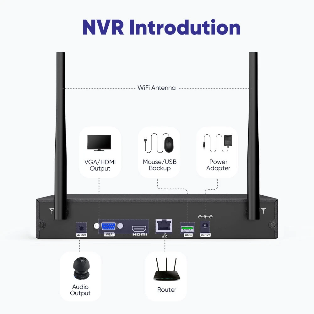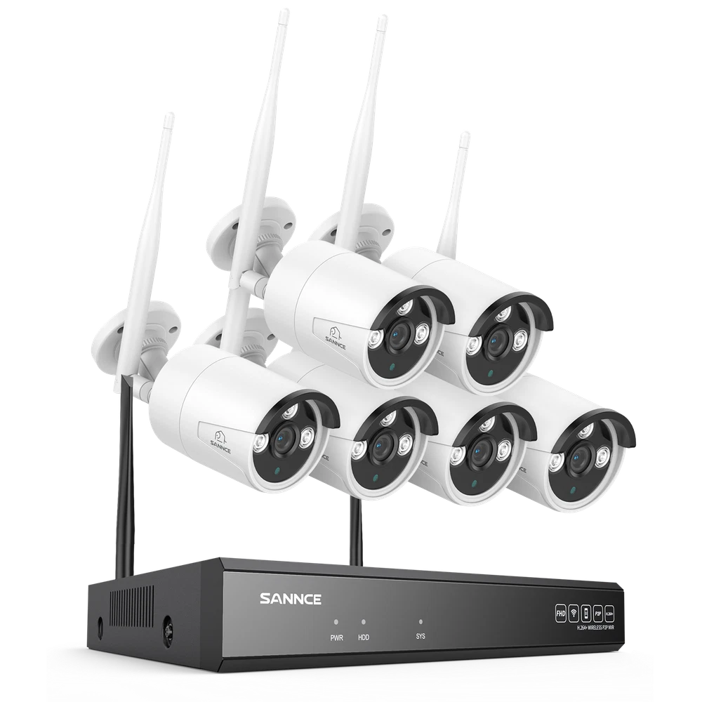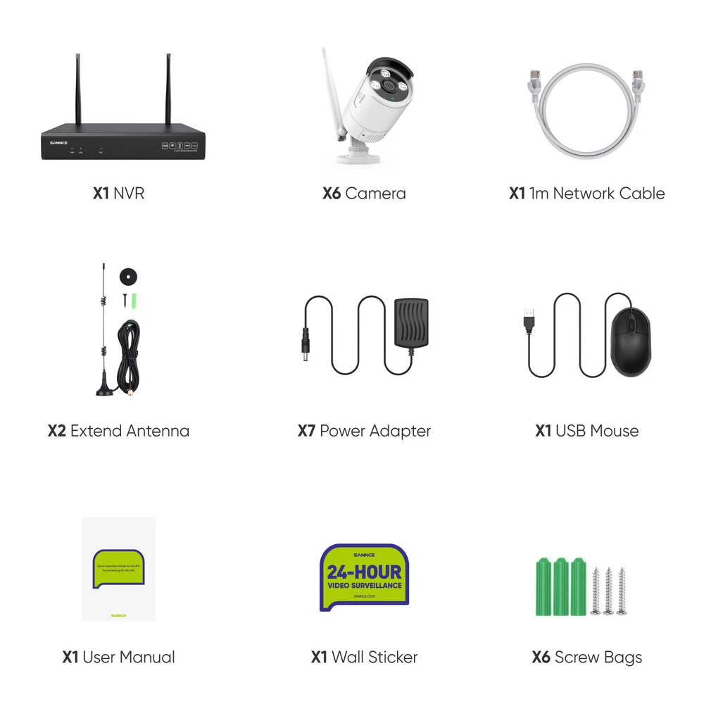 Angle of View: 70° Color Mode: Color Day, B&W Night NVR Recording Mode: Continuous, Time Scheduled, Motion Detection Number of Cameras Included: 2/4/5/6/8/10 Remote View: iPhone®, iPad®,Android™ PC: Support Windows IE Type: Dome+Bullet Camera Feature1: 5MP, In/Outdoor; Day/Night; IR Cut Maximum Resolution: 2304×1296 Number of Infrared/Full color LEDs: 8 Smart Home Compatibility: Amazon Alexa Camera Feature2: Two Way Audio Audio Input/Output: Built in microphone & speaker, support 2 way audio Camera Lens: 3.6mm Smart Home Protocol: Wi-Fi Video Compression: H.264+ Location: Indoor/Outdoor Pls Note: Bullet camera doesn't has color night vision Manufacturer Warranty: 3 years Items Included: Alarm, Camera, Motion Sensors, Remote Control, Infrared Detector Surveillance Technology: IP/Network NVR Recording Mode 1: E-mail alert, Multi-Channel Playback,Real Time Surveillance NVR Feature: 5MP, P2P, QR to Remote Access Camera Storage: Micro SD Card(up to 128GB)(Not included) Power Source: Wall Plug-In Number of Channels: 10 Night Vision/Full color Distance: PT Camera:Up to 20m/10m ;Bullet Camera no this function Model: N48WHE+71DC+71GL Features: Infrared/Night Vision, Weatherproof, Wi-Fi access, real plug-and-play system, Night Vision, Outdoor/Weatherproof, Wi-Fi, Wall Mounted, Waterproof, Built in Microphone, Two Way Audio, Auto Tracking, Energy Saving, Instant Alert, Multiple Language Support, Plug in, Smart Light Connectivity: Wireless Warranty: 3 Years Application: Indoor/Outdoor MPN: SU-N48WHE-71DC-71GL Brand: SANNCE PT: Horizontal 350°, Vertical 90° PT Camera Feature: Color Night Vision